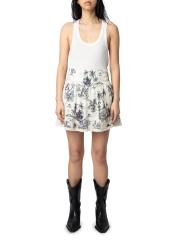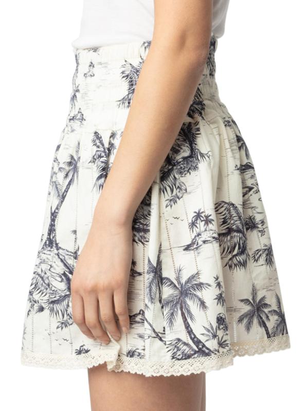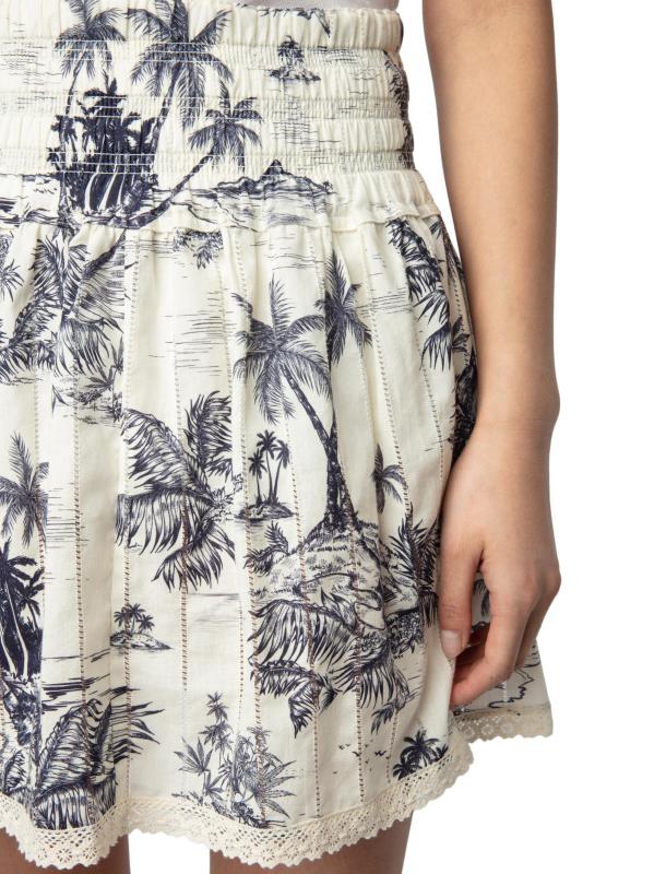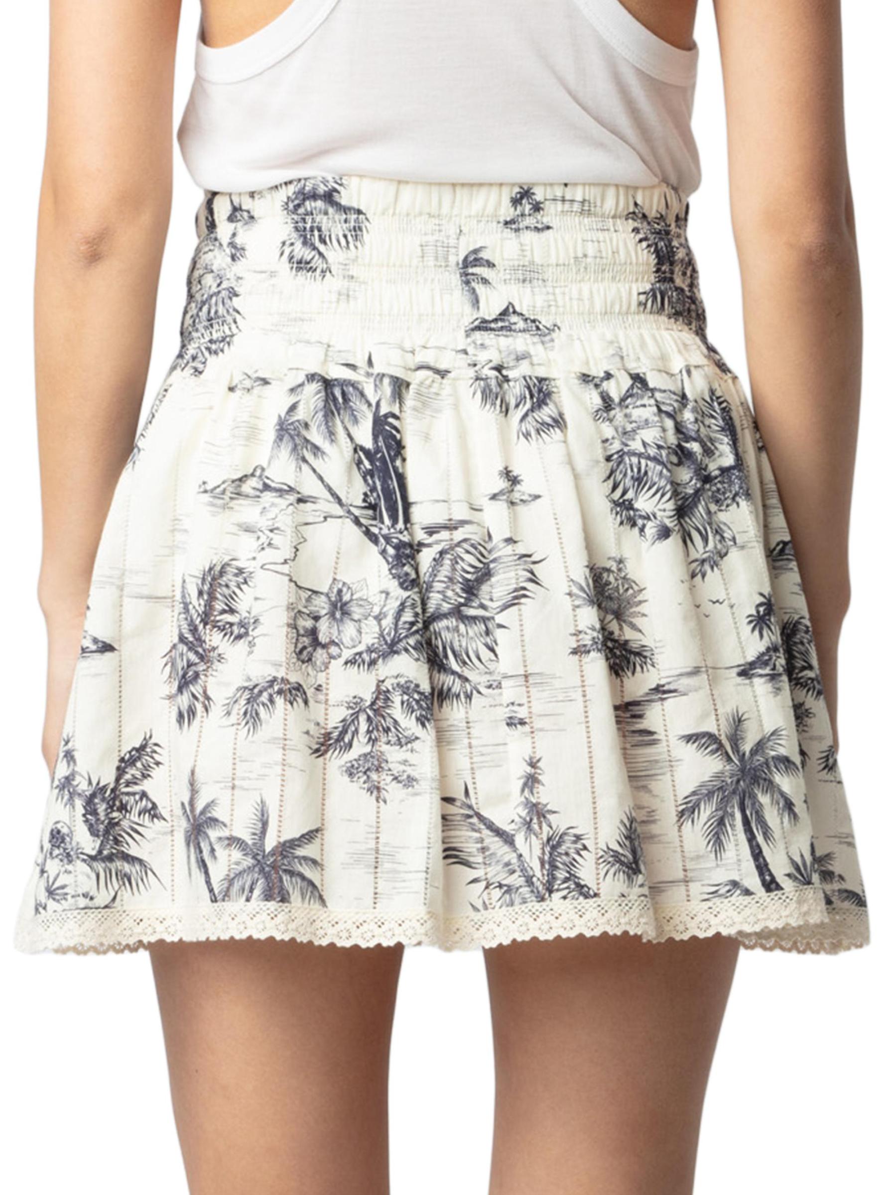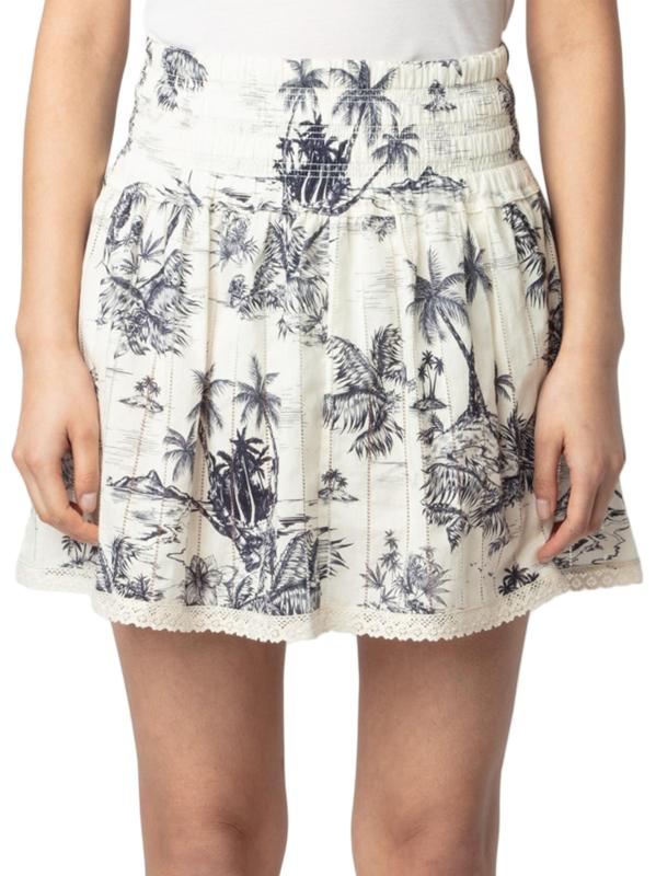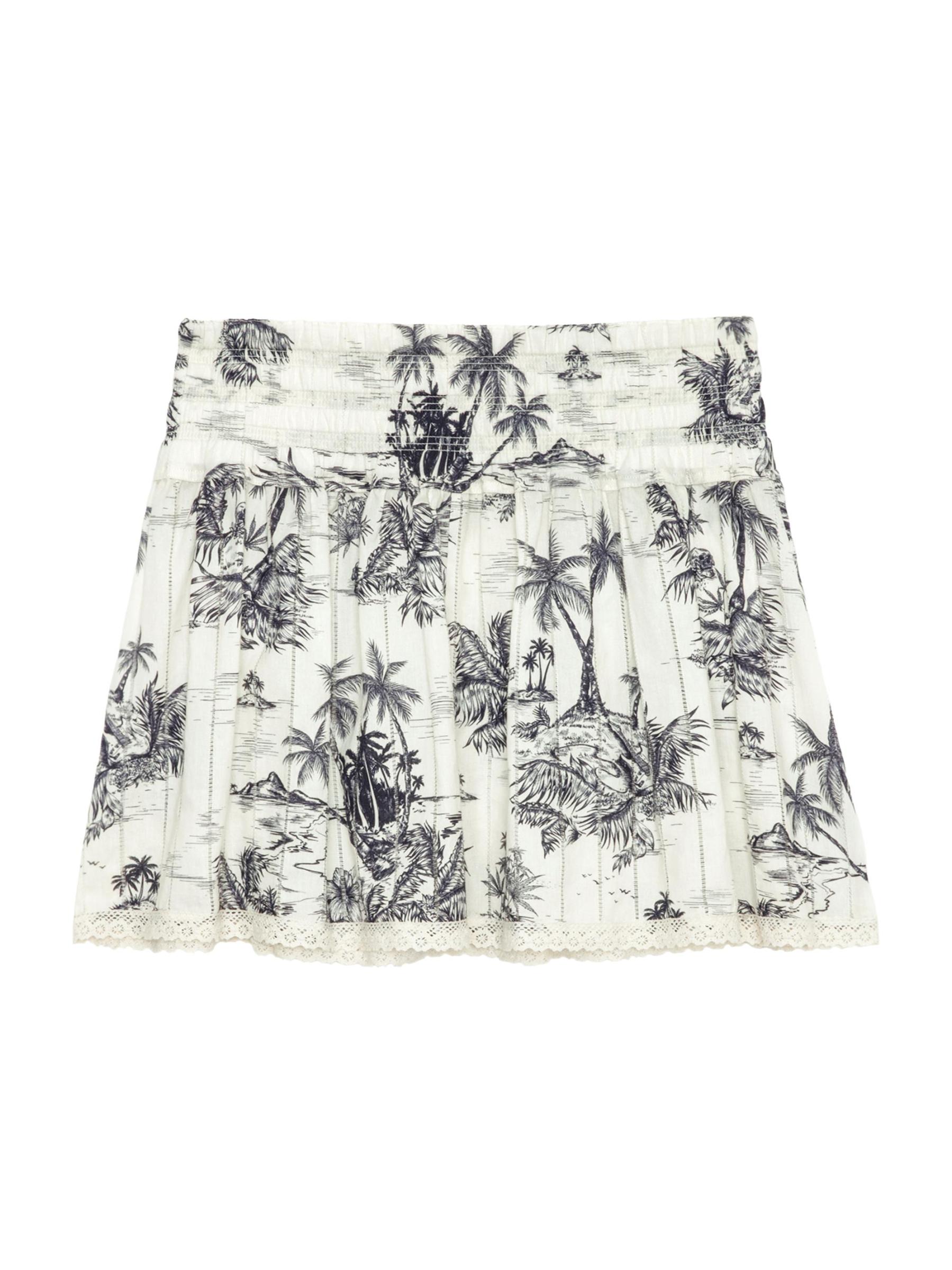Voltaire's Jocky miniskirt has an elastic waistband and is styled with a tropical toile de jouy-inspired print and ladder lace.
