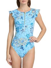 Style with a floral print, Lilly Pulitzer's Jossette one-piece swimsuit features flounce detailing at the shoulders and a goldtone center zipper.