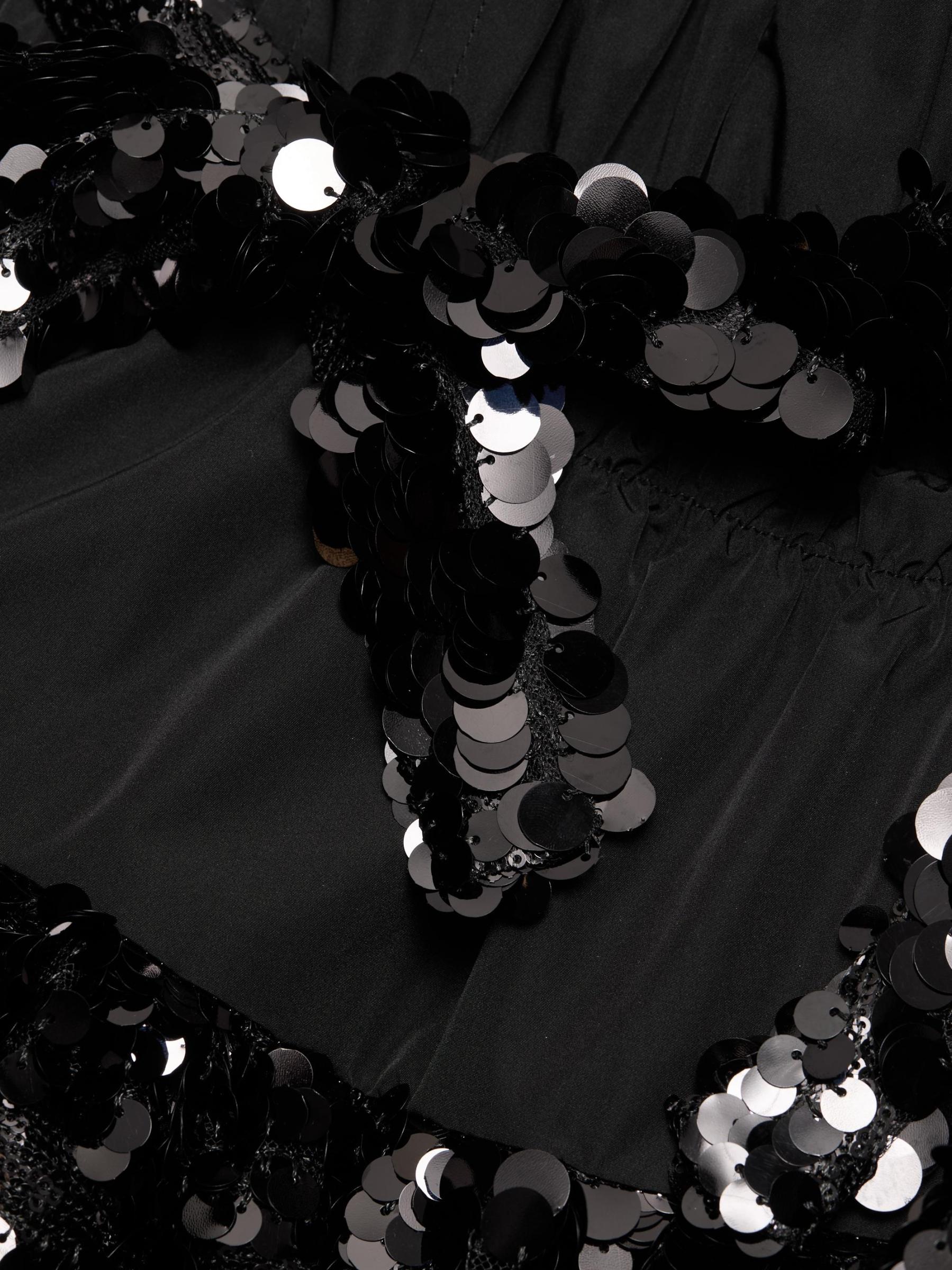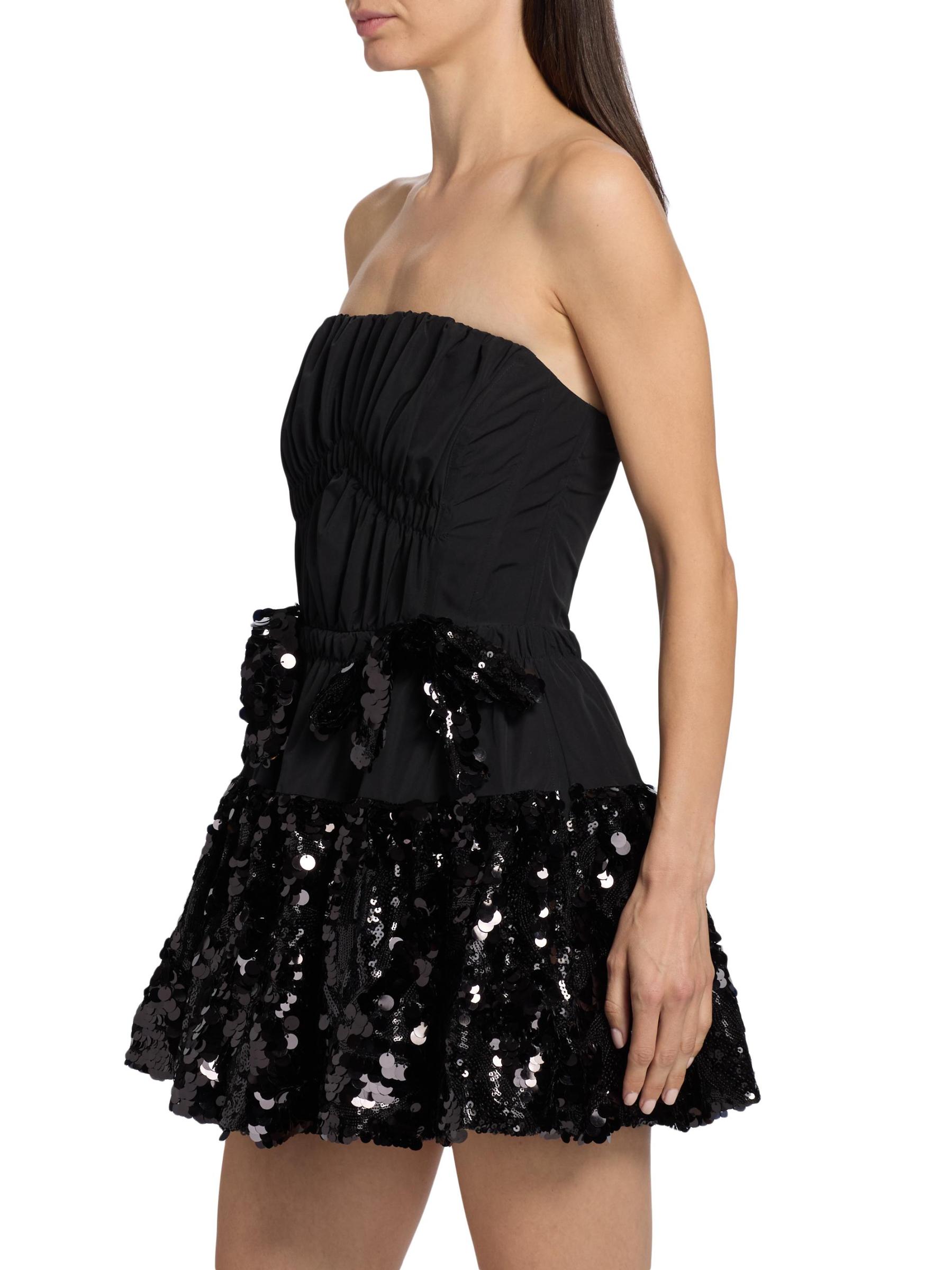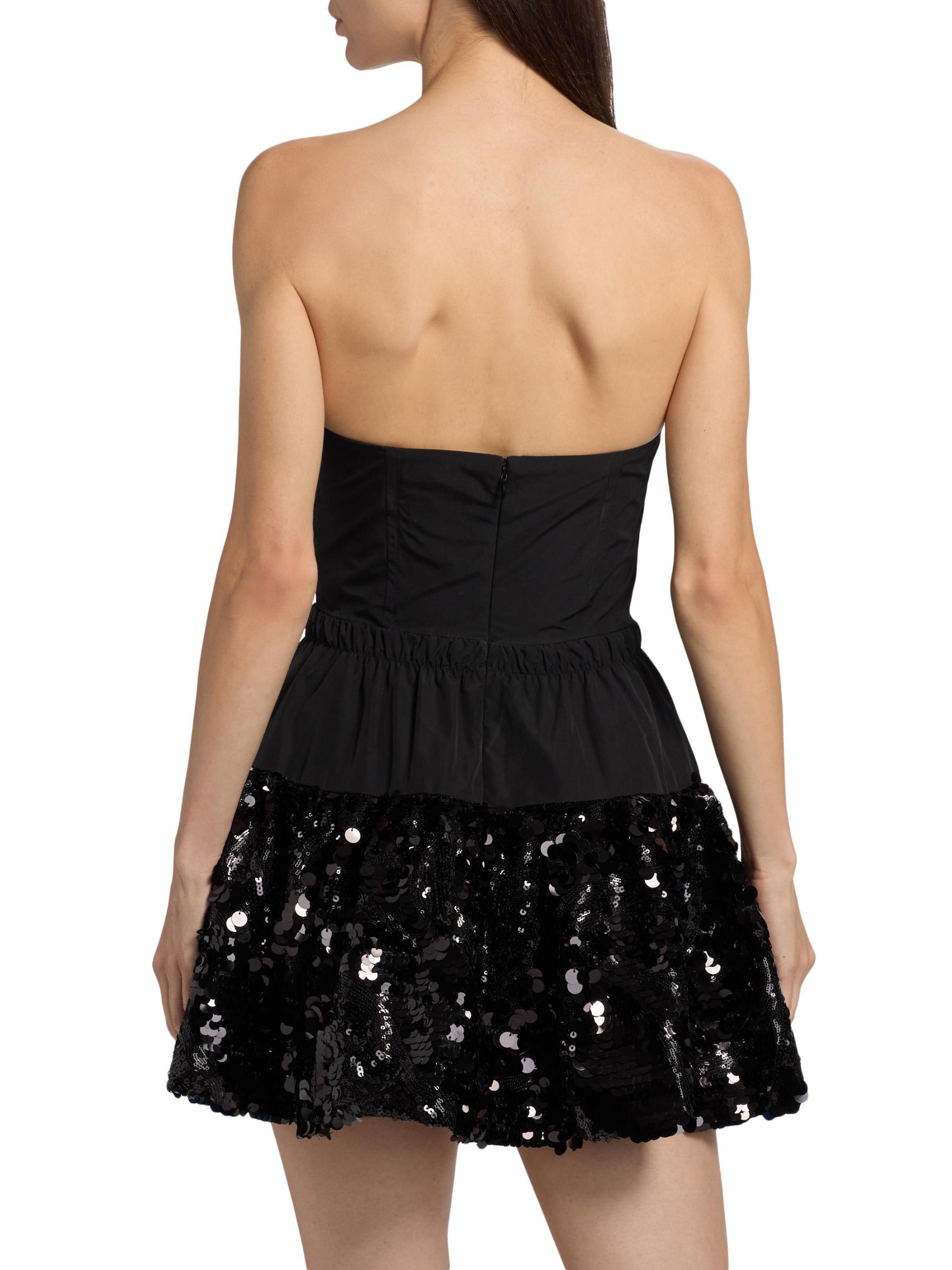 Aknvas' Kamilla fit-and-flare minidress features a strapless neckline, gathered bodice, and sequined skirt.