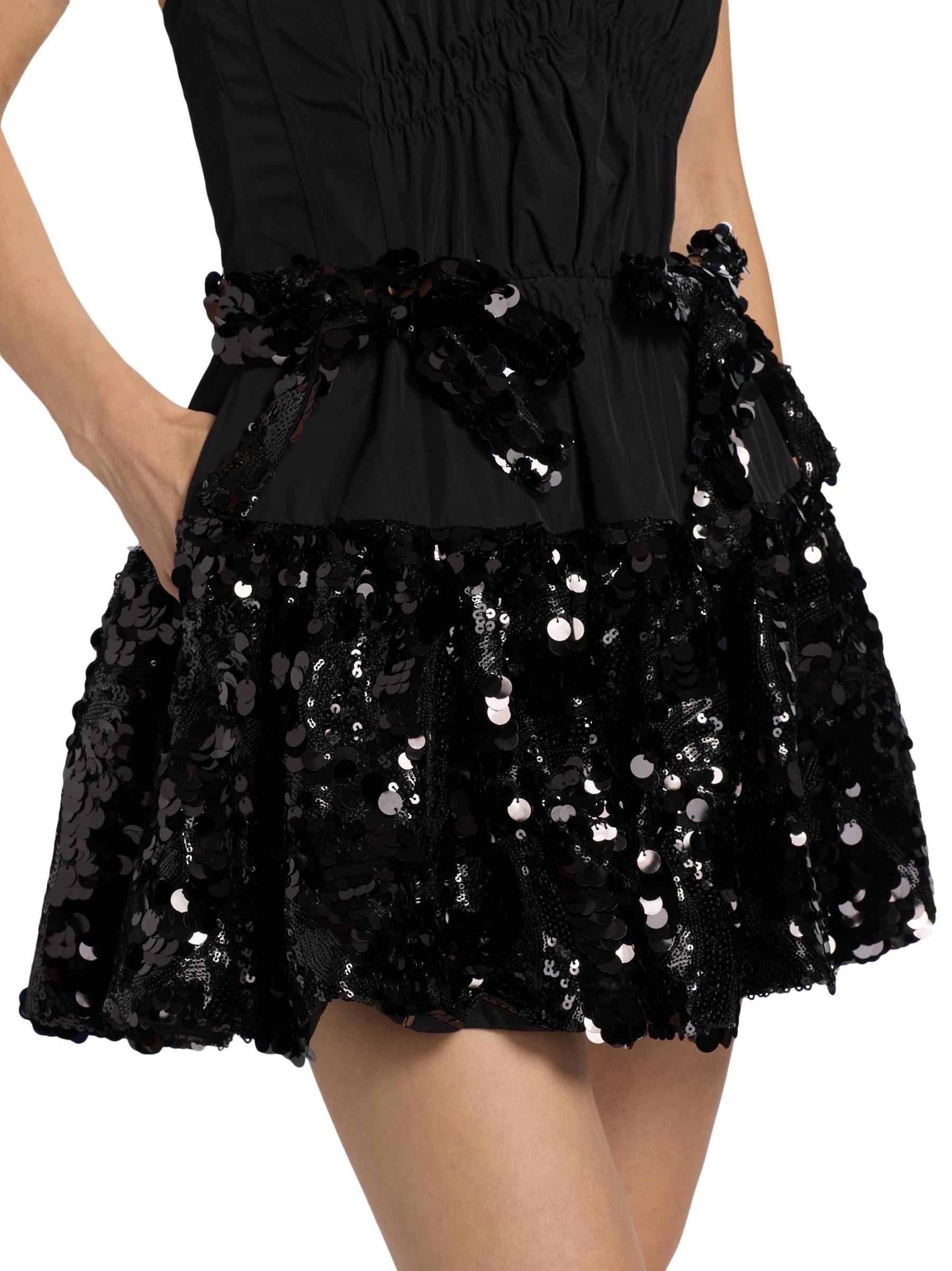 Aknvas' Kamilla fit-and-flare minidress features a strapless neckline, gathered bodice, and sequined skirt.Strapless neckline Sleeveless Gathered bodice Back zip closure 100% polyester Lining: 100% polyester Dry clean Imported