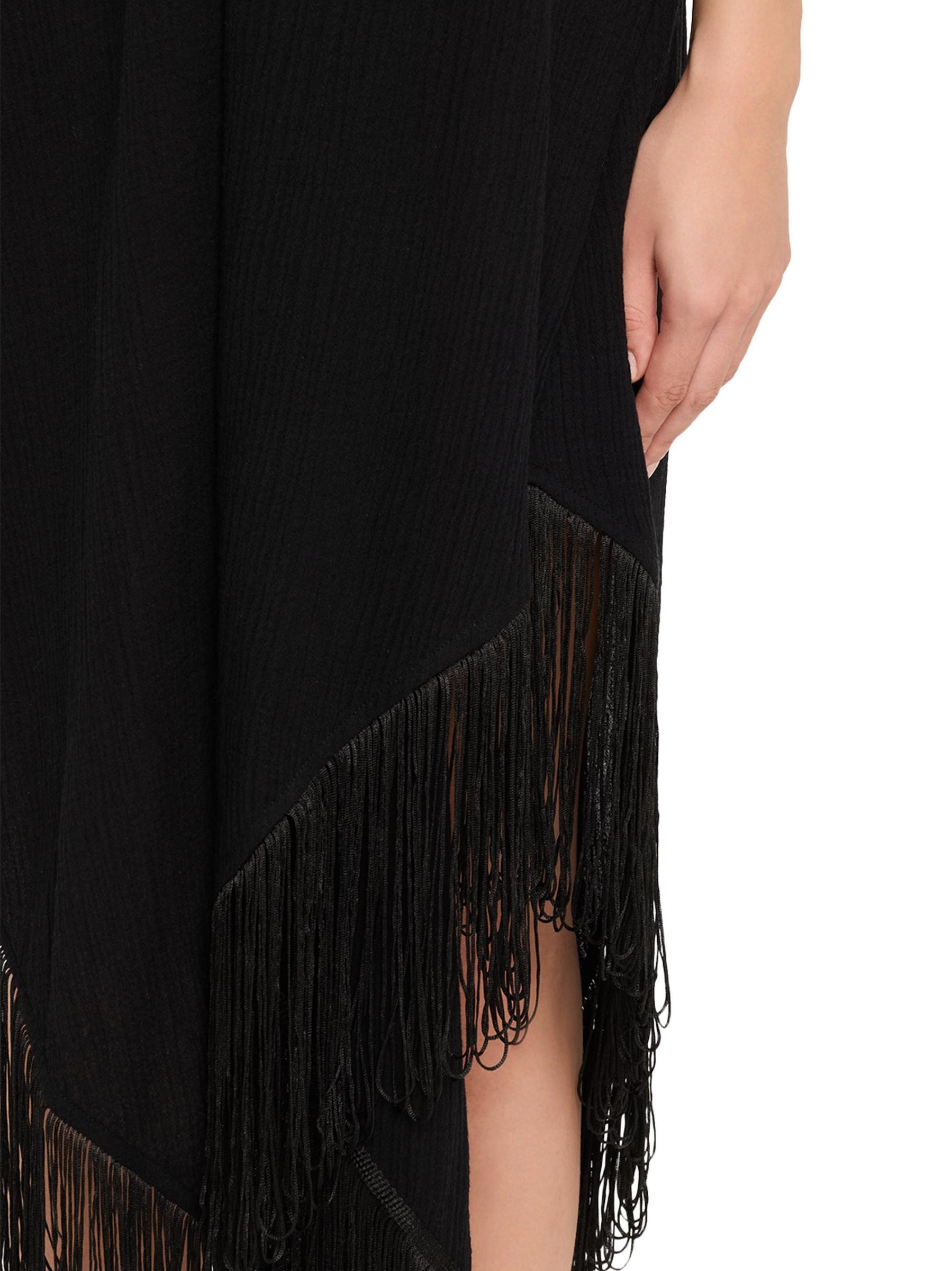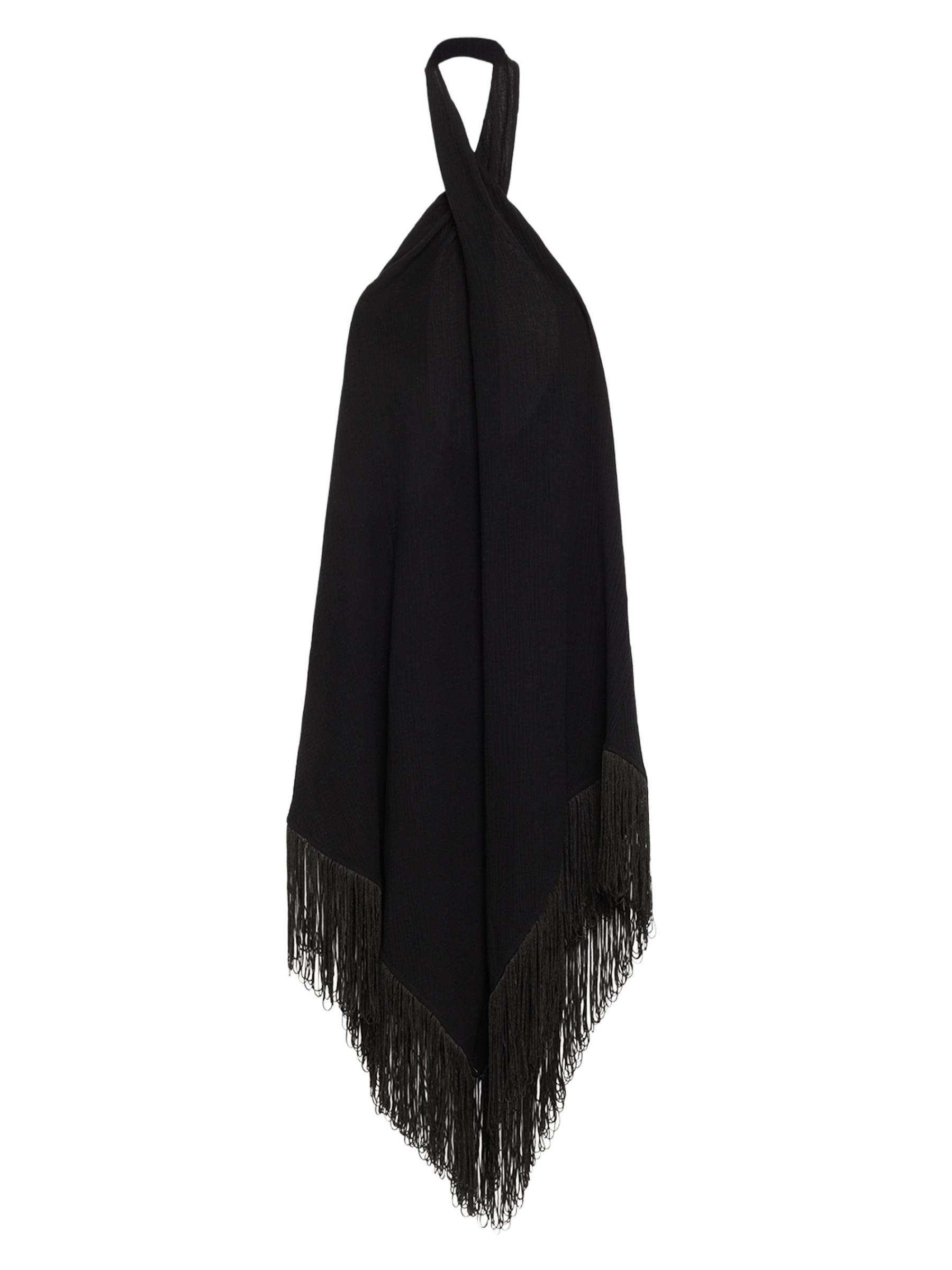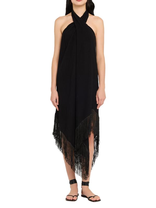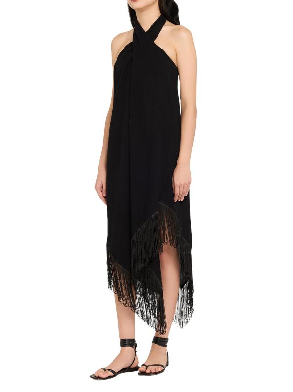 The Kate midi-dress from PQ is adorned with tonal fringe trim, featuring a crossover halter neckline. A handkerchief hemline lends playful movement to this breezy silhouette.