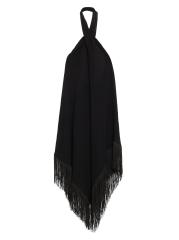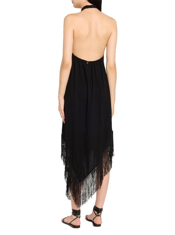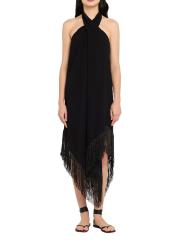 The Kate midi-dress from PQ is adorned with tonal fringe trim, featuring a crossover halter neckline. A handkerchief hemline lends playful movement to this breezy silhouette.Halterneck Sleeveless Open back Handkerchief hem Back clasp closure Nylon/polyester/elastane Dry clean Imported