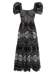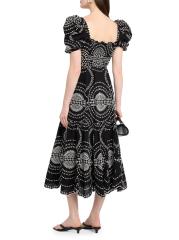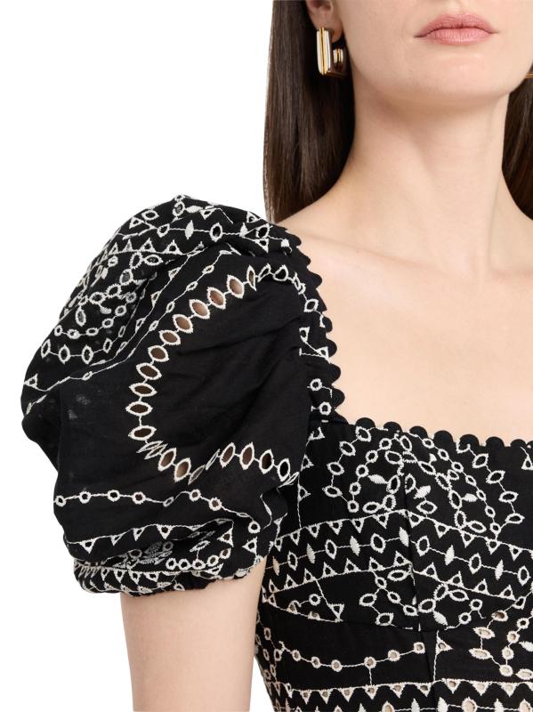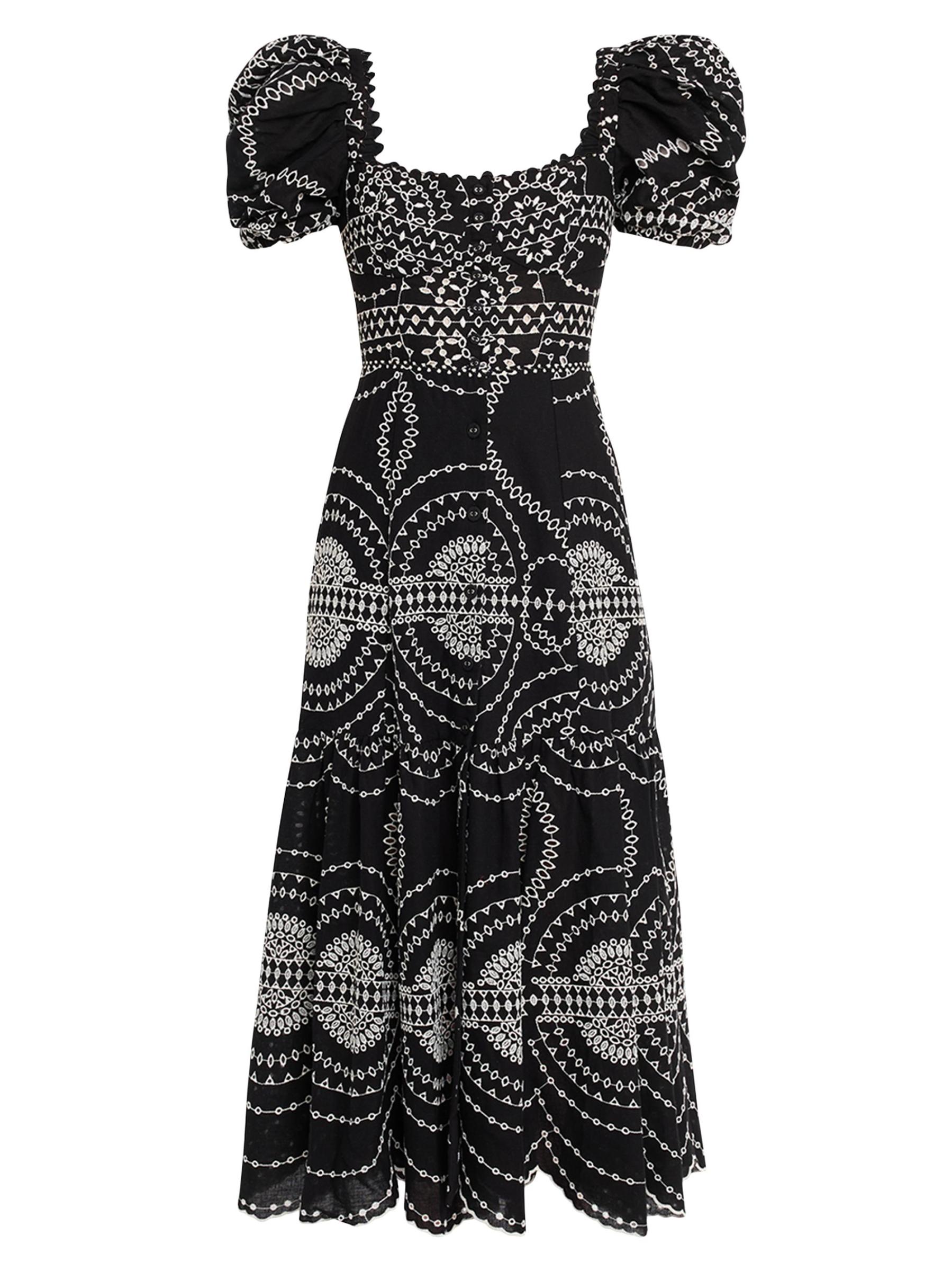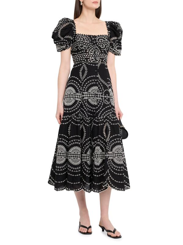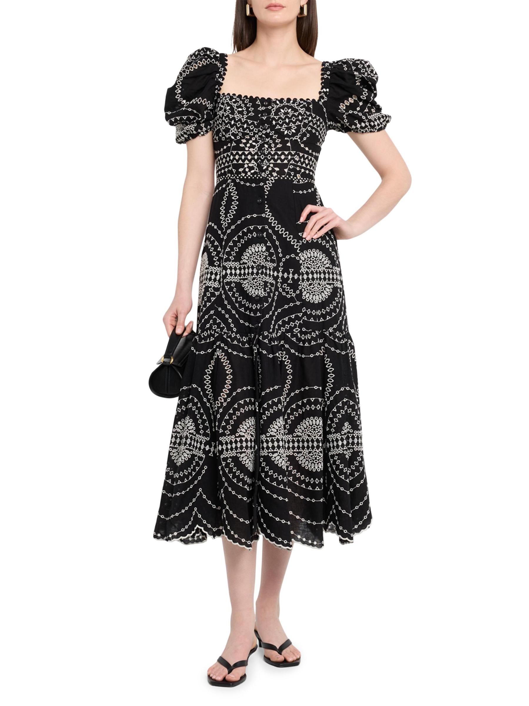 The Kaysa fit-and-flare midi-dress from Charo Ruiz Ibiza is crafted of a lightweight cotton-and linen blend with contrast embroidery.Square neck Short puff sleeves, elasticized cuffs Scalloped hem Button front closure Cotton/linen/polyester Dry clean Imported