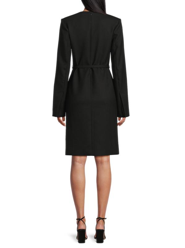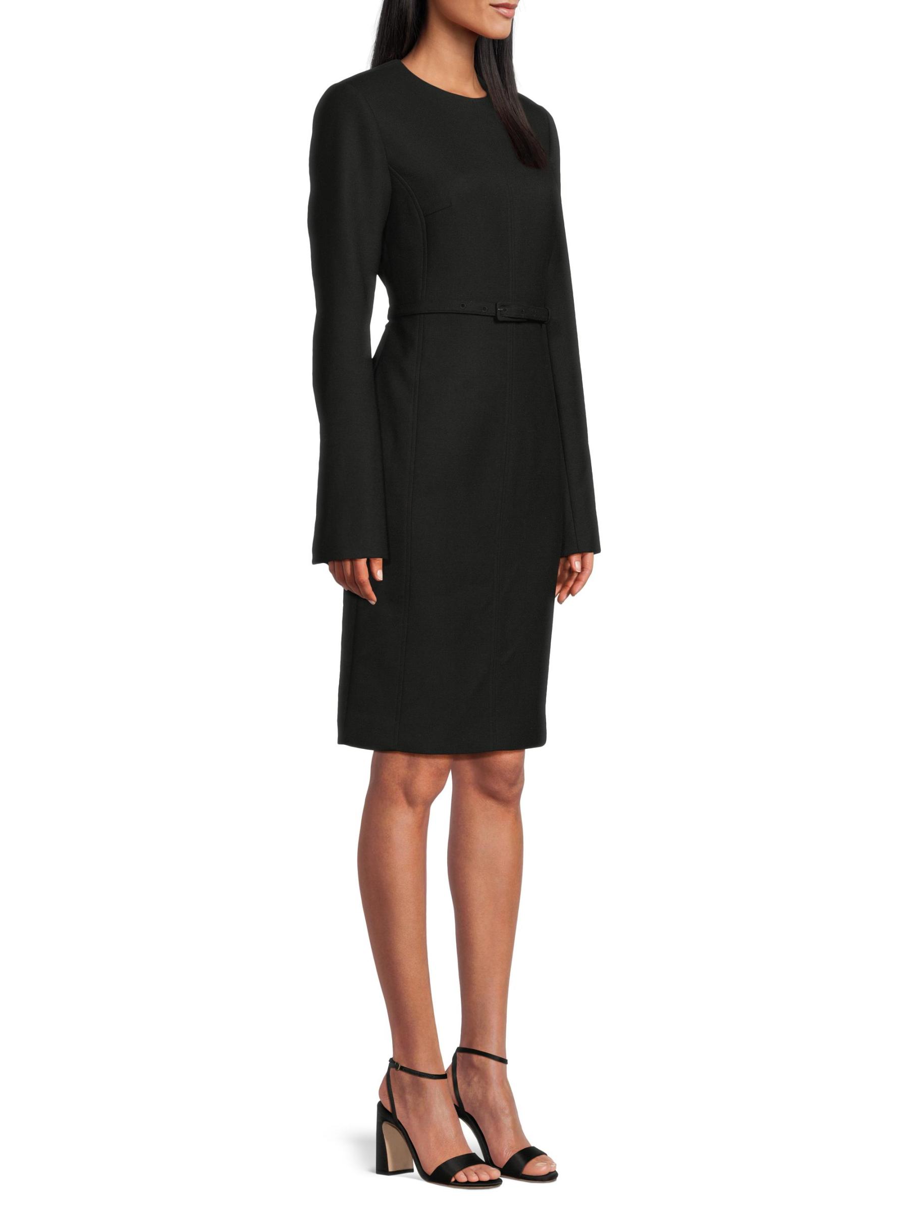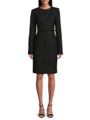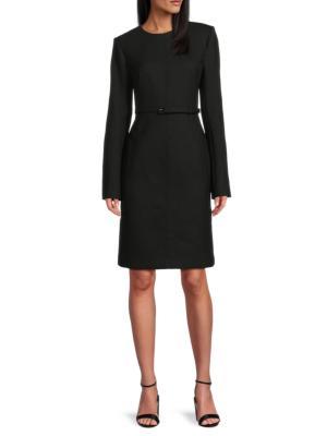 The Kember knee-length dress from Rue Sophie is crafted of wool-blend crepe.Round neck Shoulder pads Long sleeves Belted Concealed back zip closure 45% wool/32% polyester/20% viscose/3% spandex Lining: 100% polyester Dry clean Imported