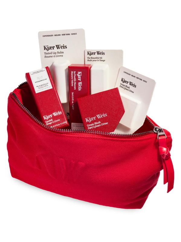 A collection of Kjaer Weis creations across makeup and skincare, all contained in a limited edition makeup bag. Cream Blush in Blossoming, a dewy touch of soft warm pink with a rosy hue, is designed to melt effortlessly into the skin to sculpt and illuminate for a naturally radiant finish. Im-Possible Mascara dramatically lengthens, thickens, and defines lashes. Tinted Lip Balm in Clear offers 24 hours of hydration delivered in a buttery soft formula containing Hyaluronic Acid, Squalane, and a nourishing blend of 10 oils. The Beautiful Oil mini is a rich and nourishing elixir, packed with nutrient-rich ingredients to moisturize skin and provide an instant glow. Made in Italy.