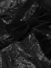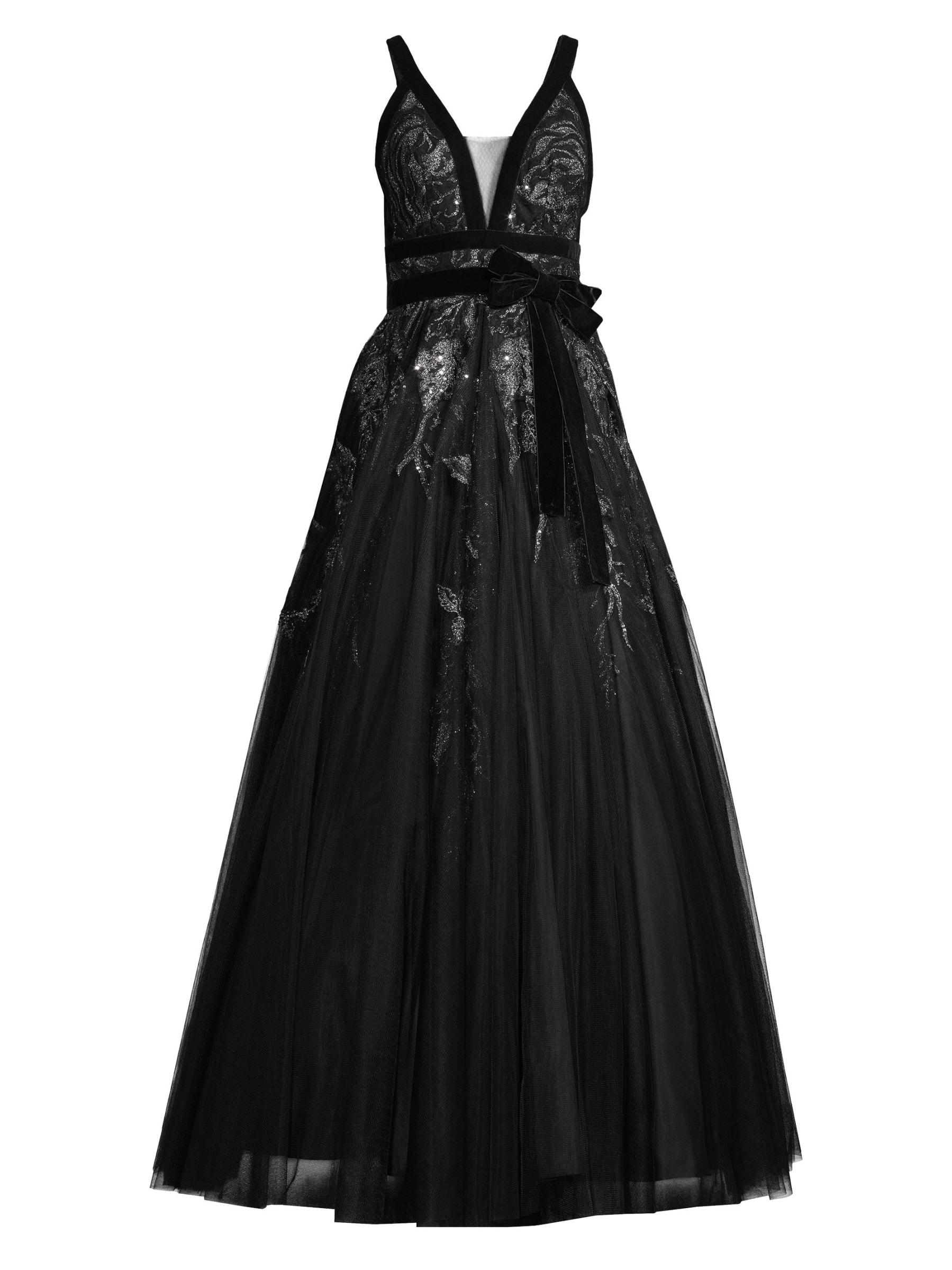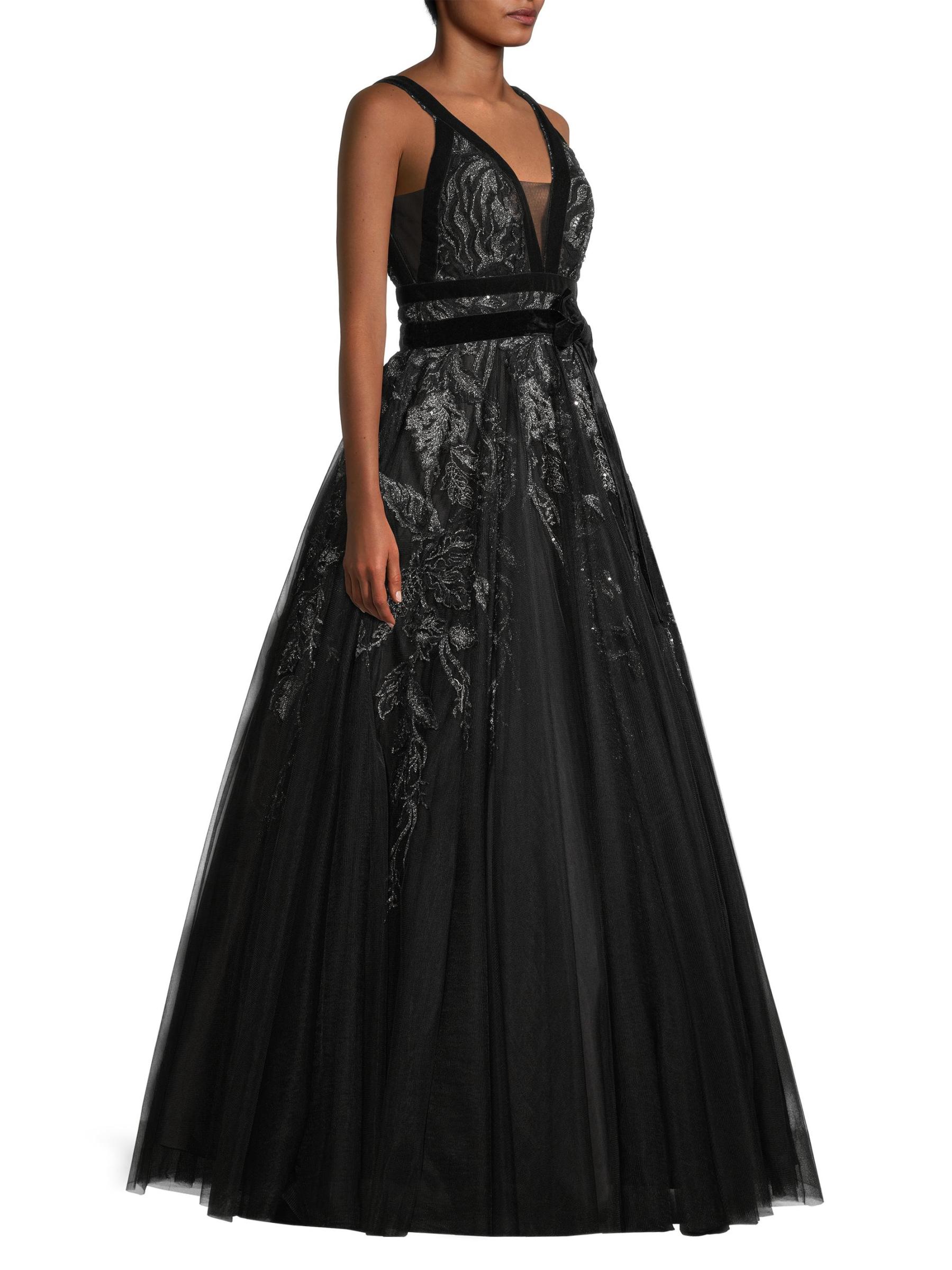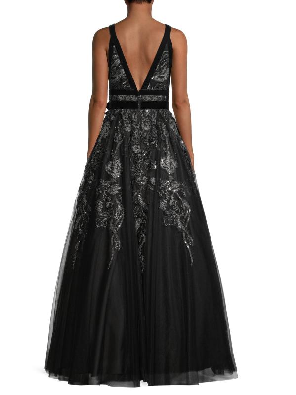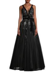 Decorated with lace embroidery, Basix's ball gown is crafted of tulle. This elegant style features a plunging V-neck and a circle skirt trimmed with velvet.