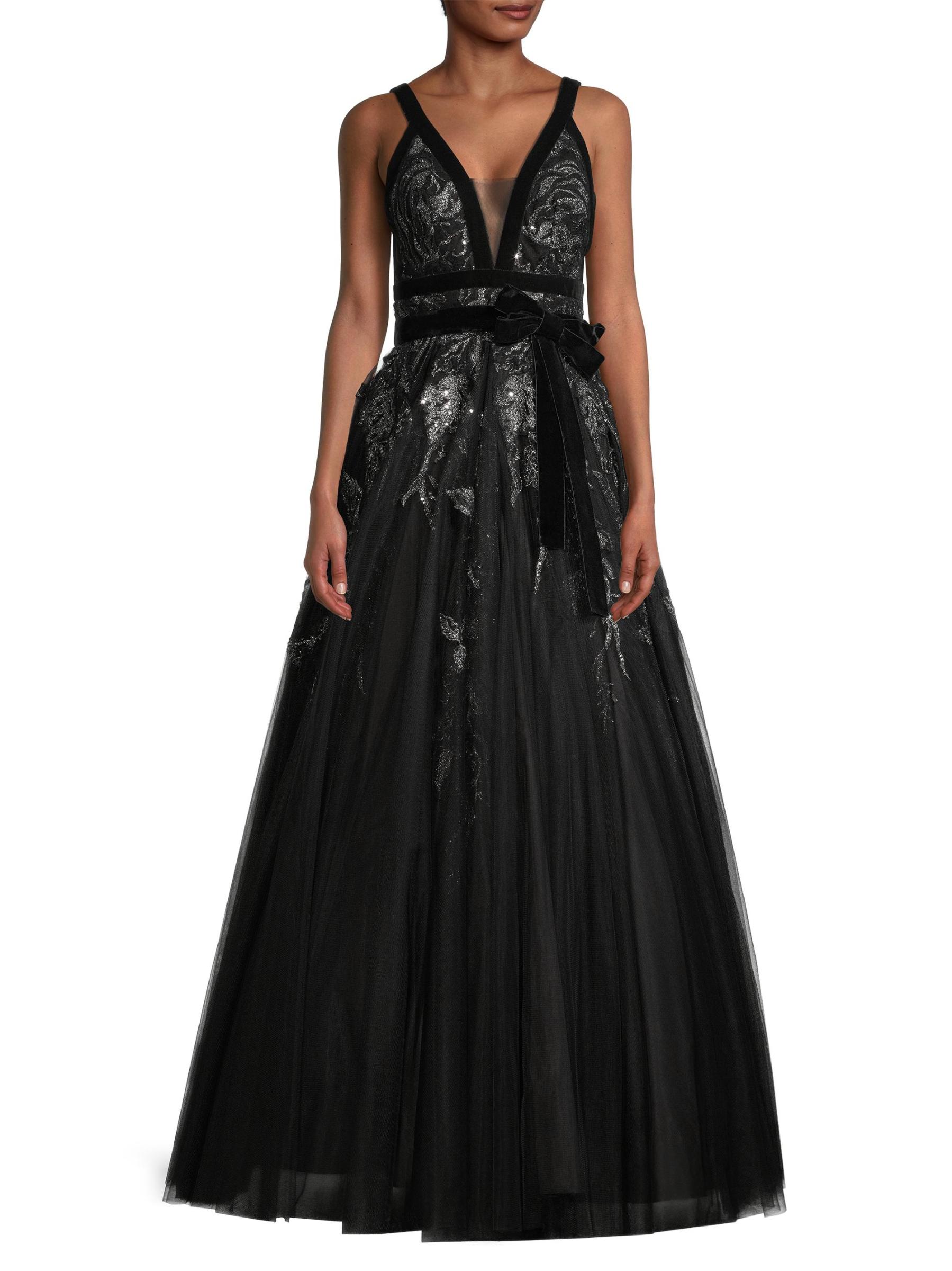 Decorated with lace embroidery, Basix's ball gown is crafted of tulle. This elegant style features a plunging V-neck and a circle skirt trimmed with velvet.V-neck Sleeveless Zip center back 100% polyester Lining: 100% acetate Dry clean Imported