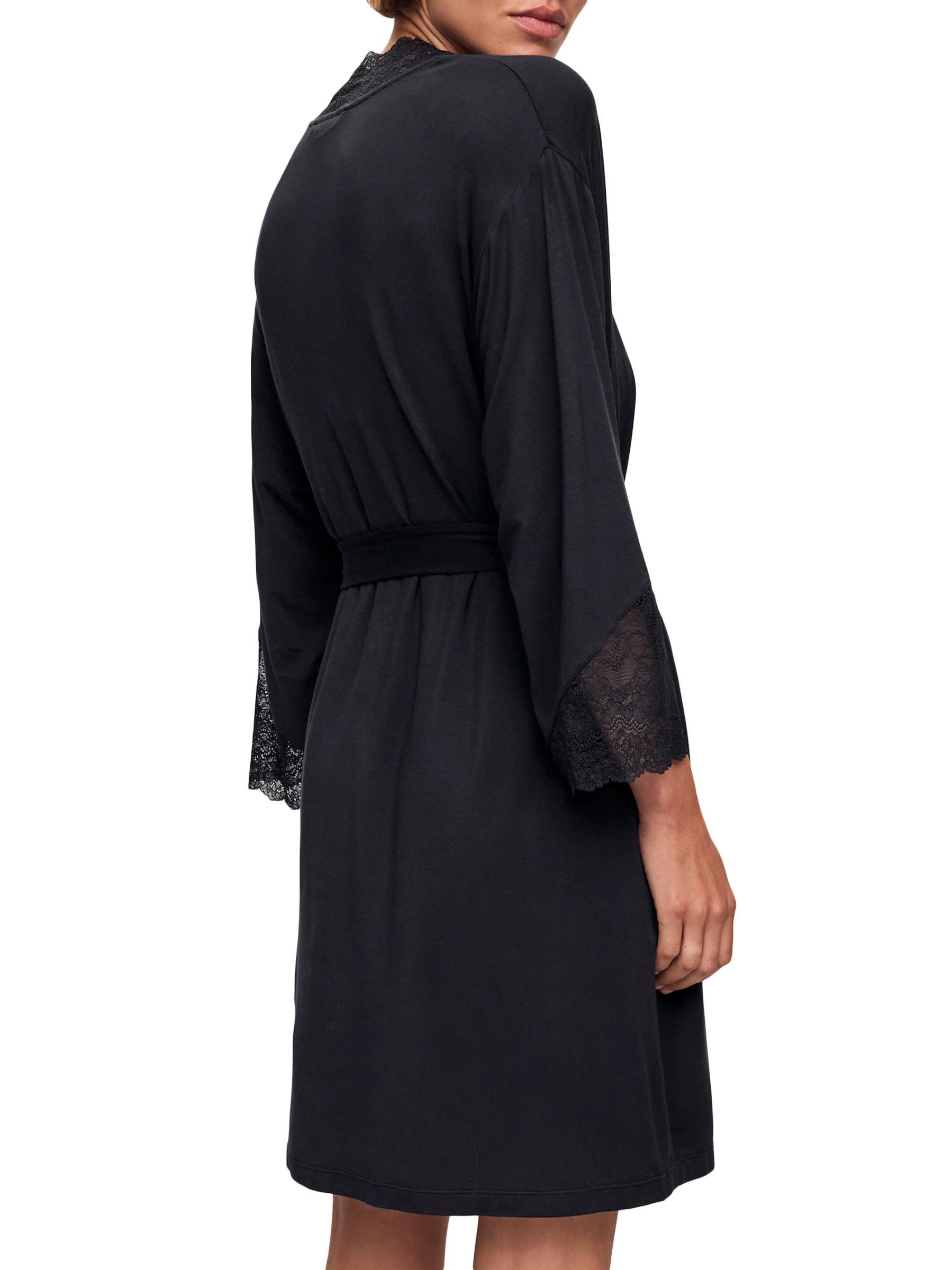 This jersey-knit short robe from Eberjey boasts kimono-inspired sleeves and luxe lace trim.V-neck Three-quarter length sleeves Self-tie belt 95% Lenzing tencel™ modal/5% spandex Lace: 91% nylon/9% spandex Hand wash Imported