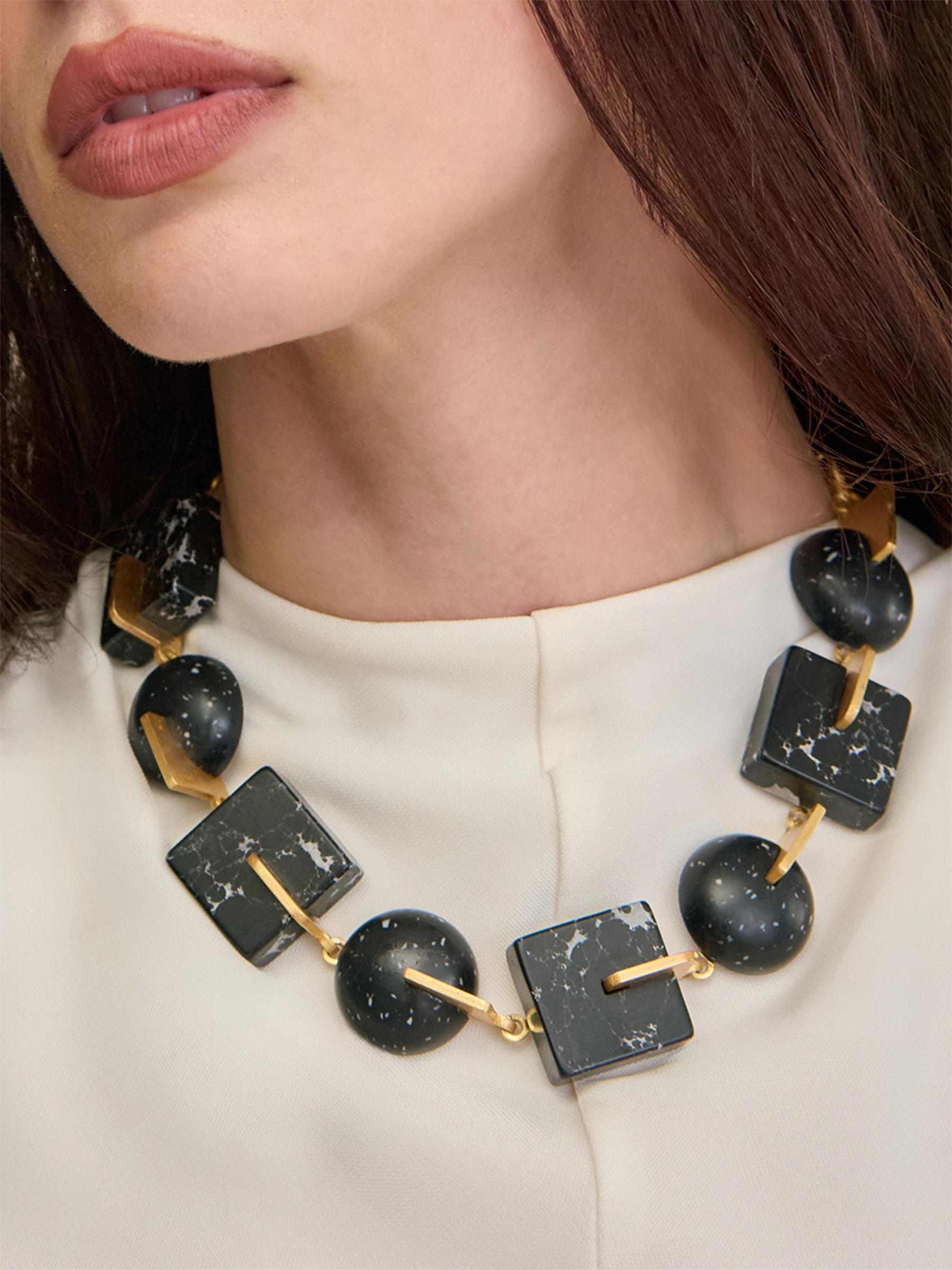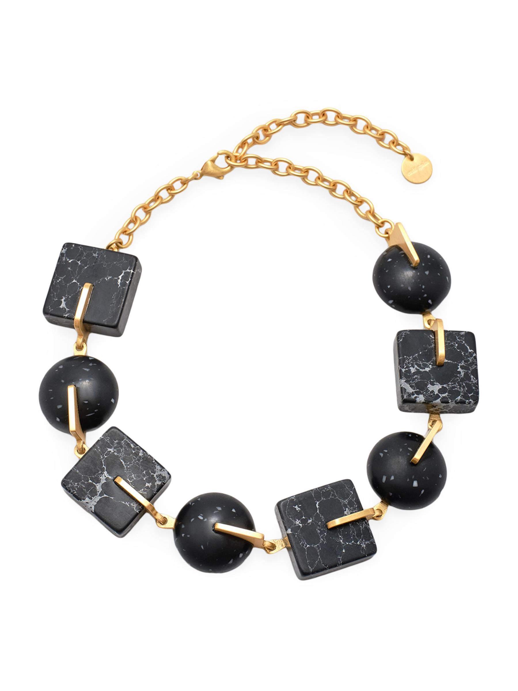 Showcasing multihued resin in mixed geometric shapes, the Laguna choker from Cult Gaia is linked by glossy goldtone rolo chain.