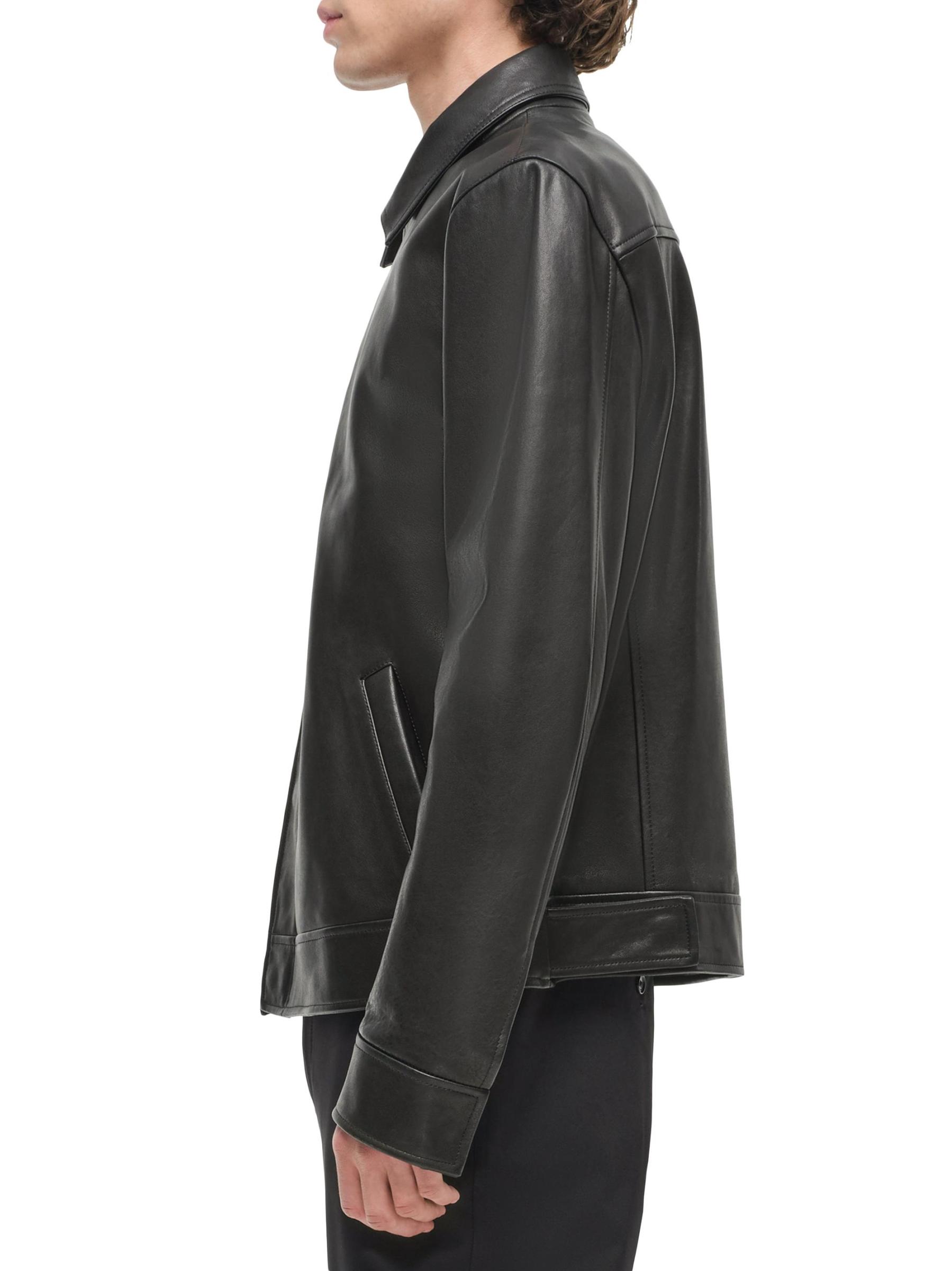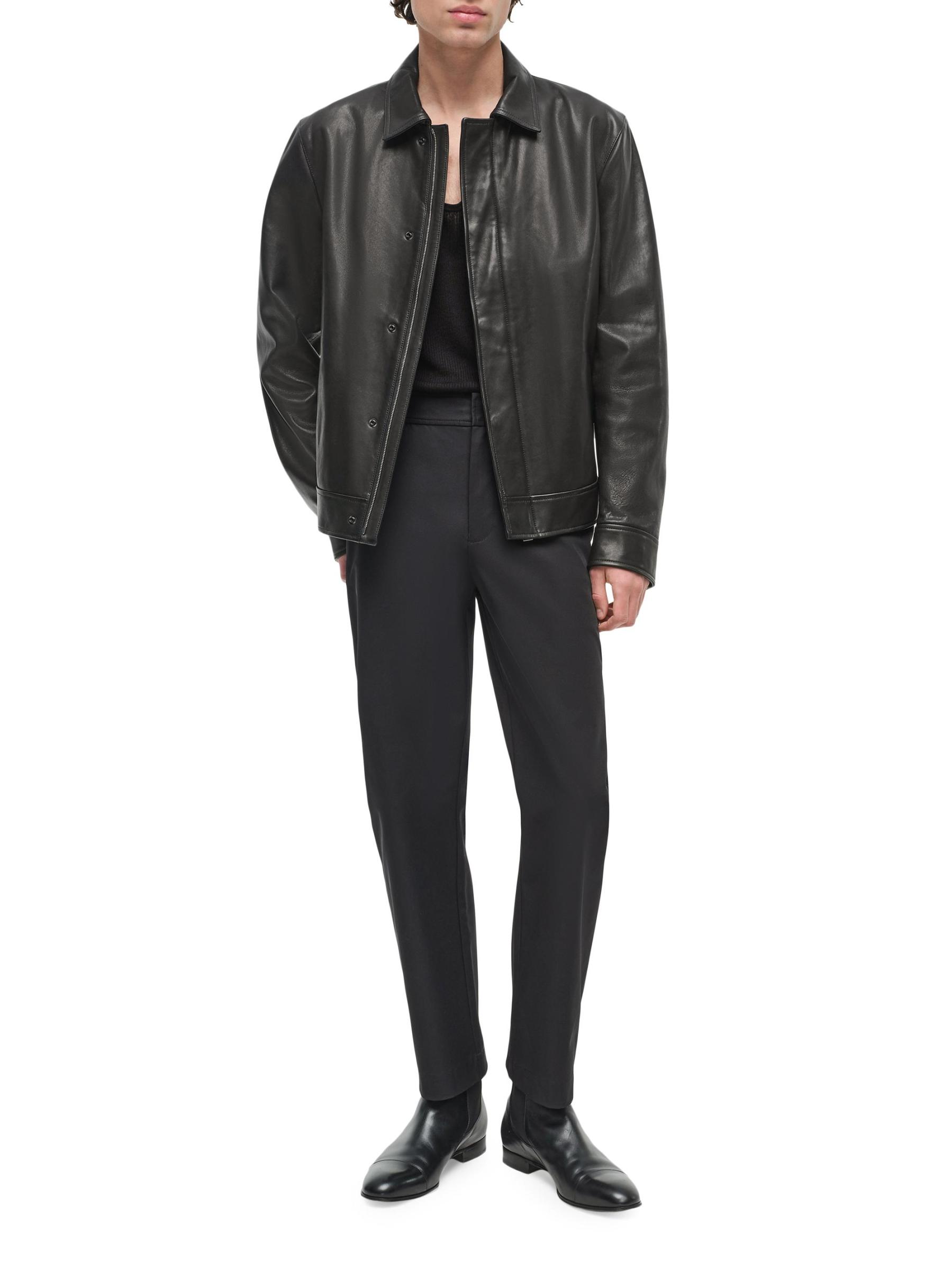 Crafted of buttery lambskin leather, the Landon jacket from SIMKHAI features a pared-back 90s design with a spread collar.