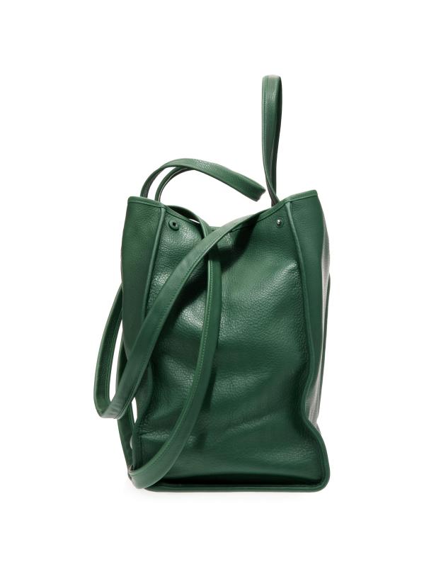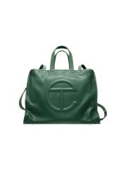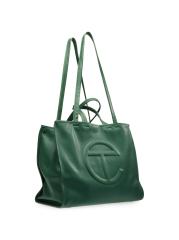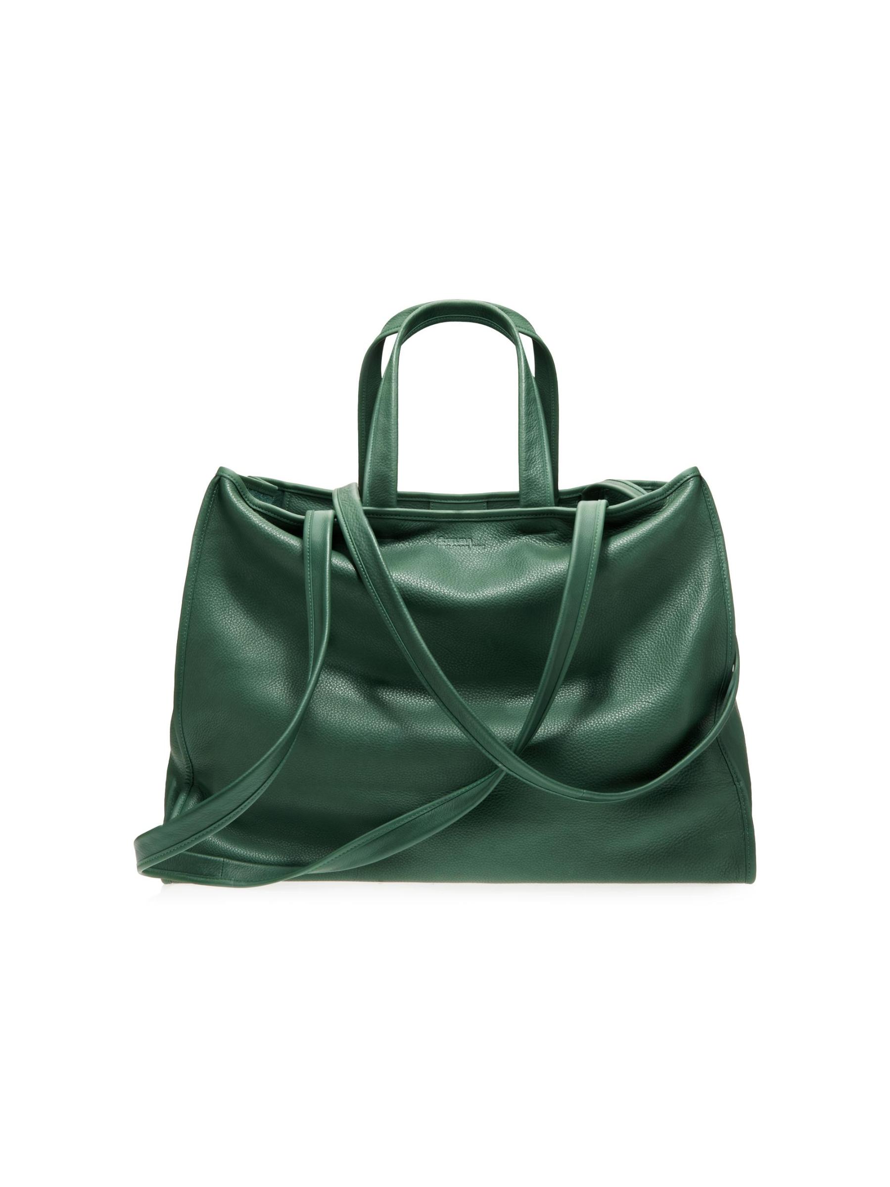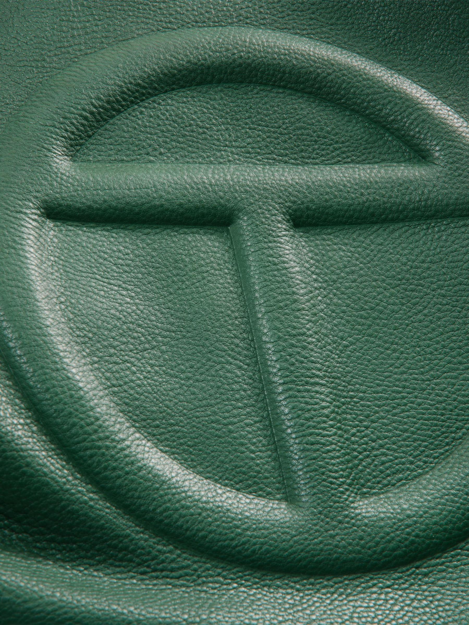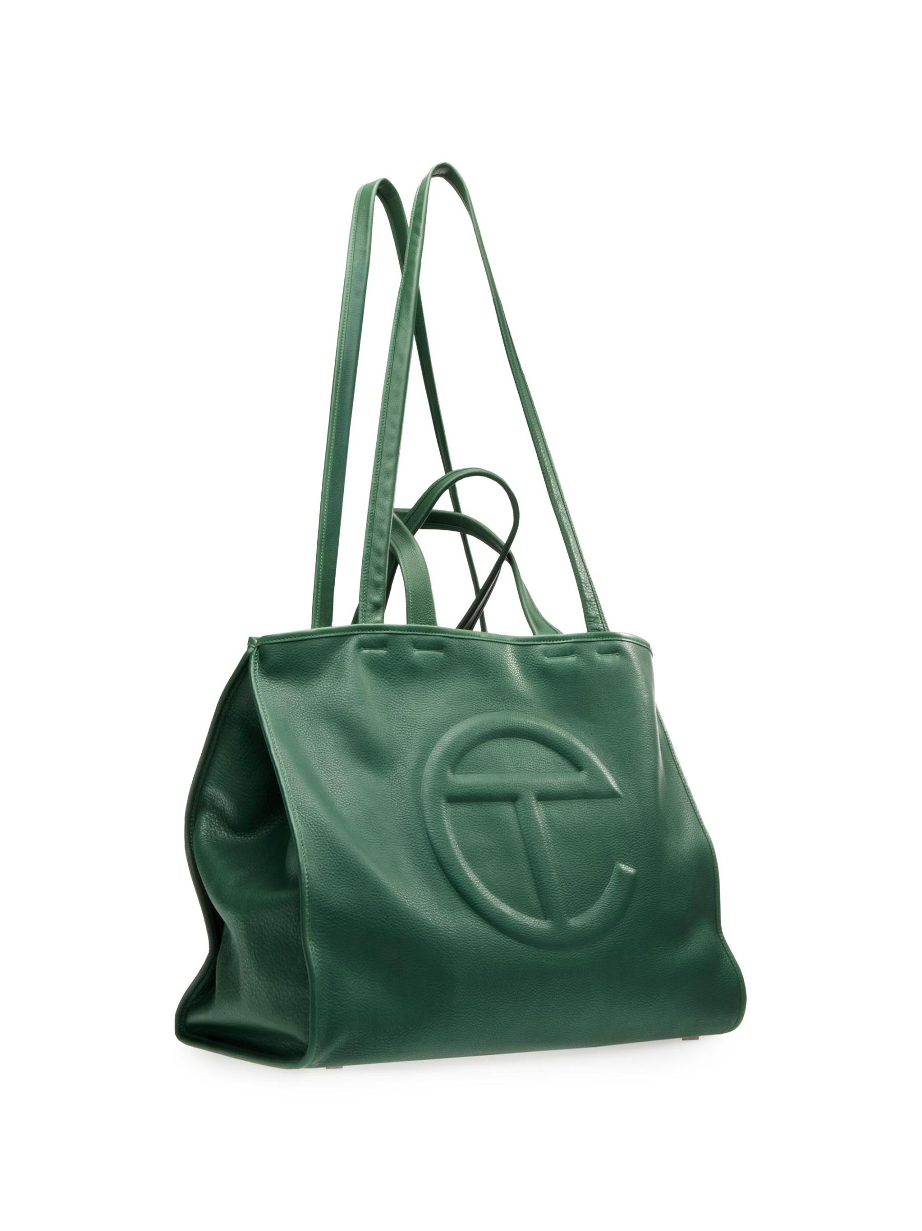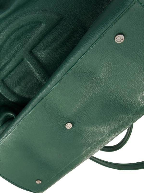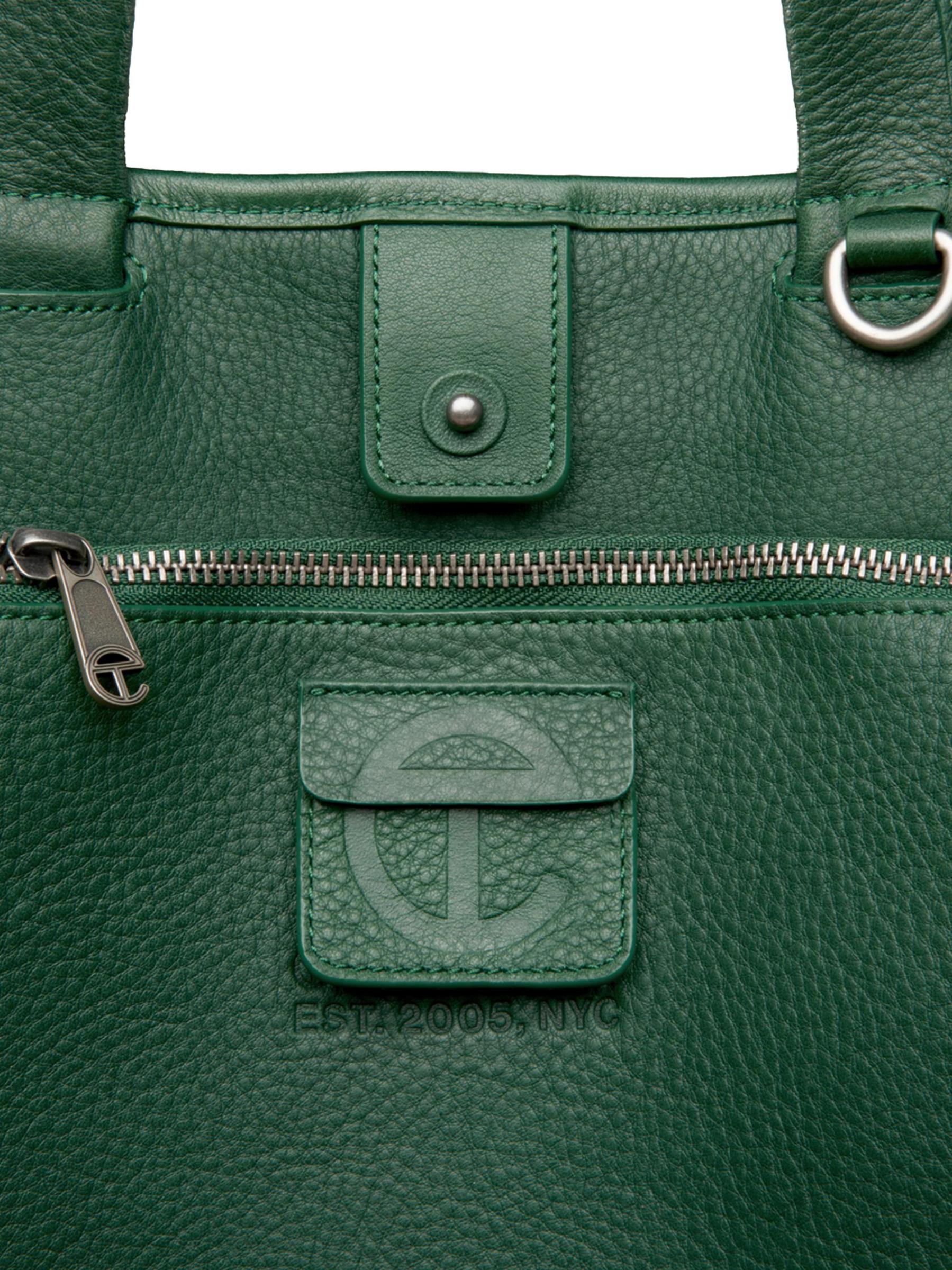 Crafted of leather, this large Carry bag from TELFAR features a sleek design with dual shoulder and crossbody straps. The style is finished with an embossed logo.Made with responsibilty tanned leather Two shoulder straps Two crossbody straps Exterior: one zip pocket Protective metal feet Snap closure Responsibly tanned leather, exclusive of trim leather Imported