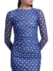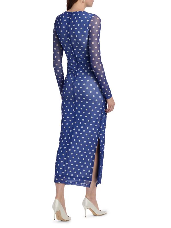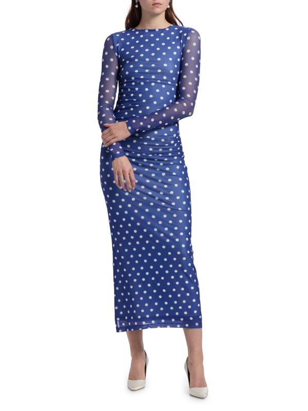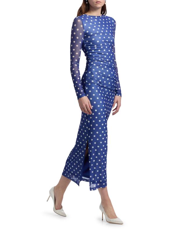 From Le Fleur Collection. Aston Studio's Ezli mesh maxi dress is designed with polka dots and ruching at the waist.Round neck Long sleeves Concealed back zip closure 90% polyester/10% spandex Dry clean Imported