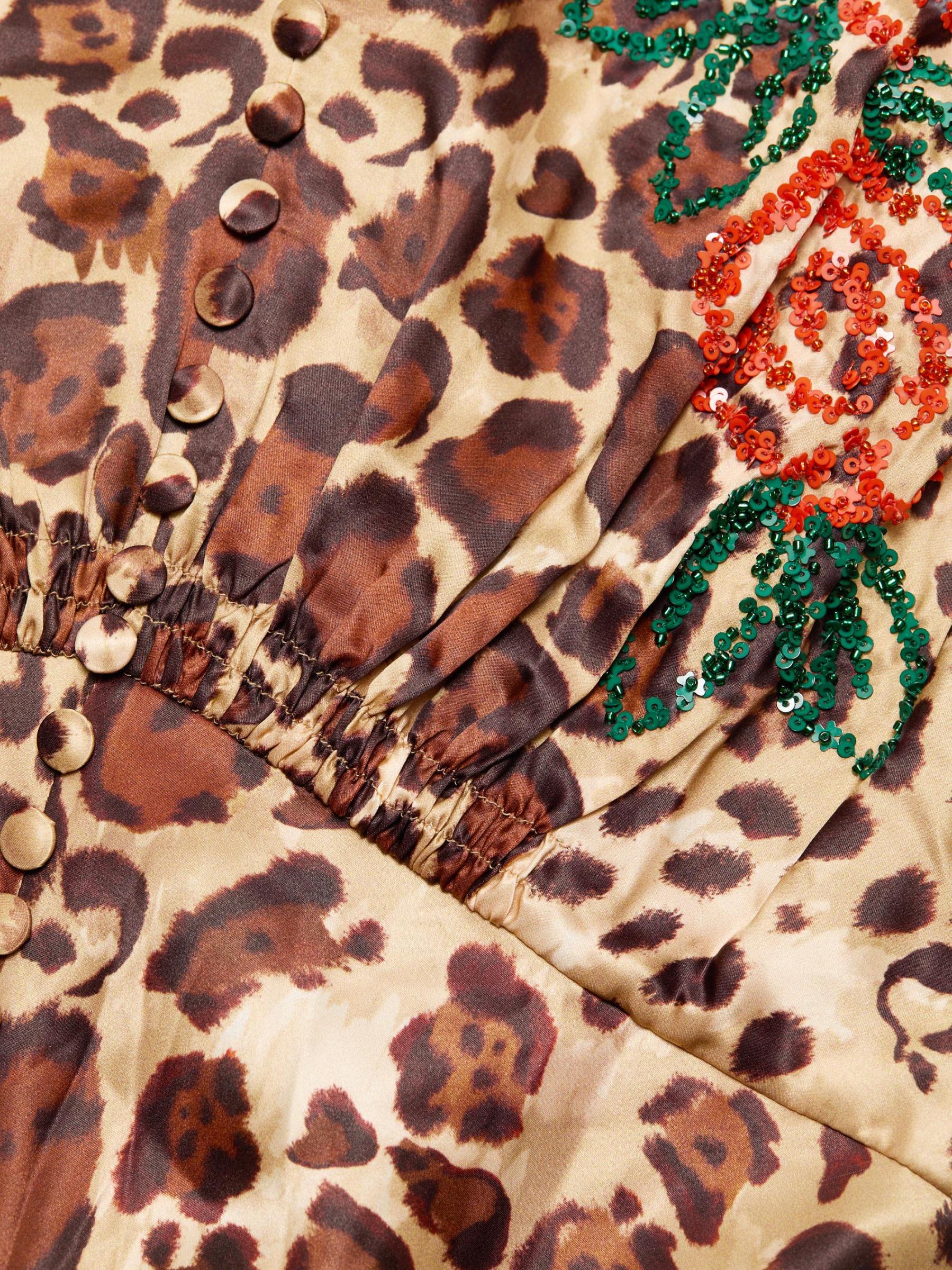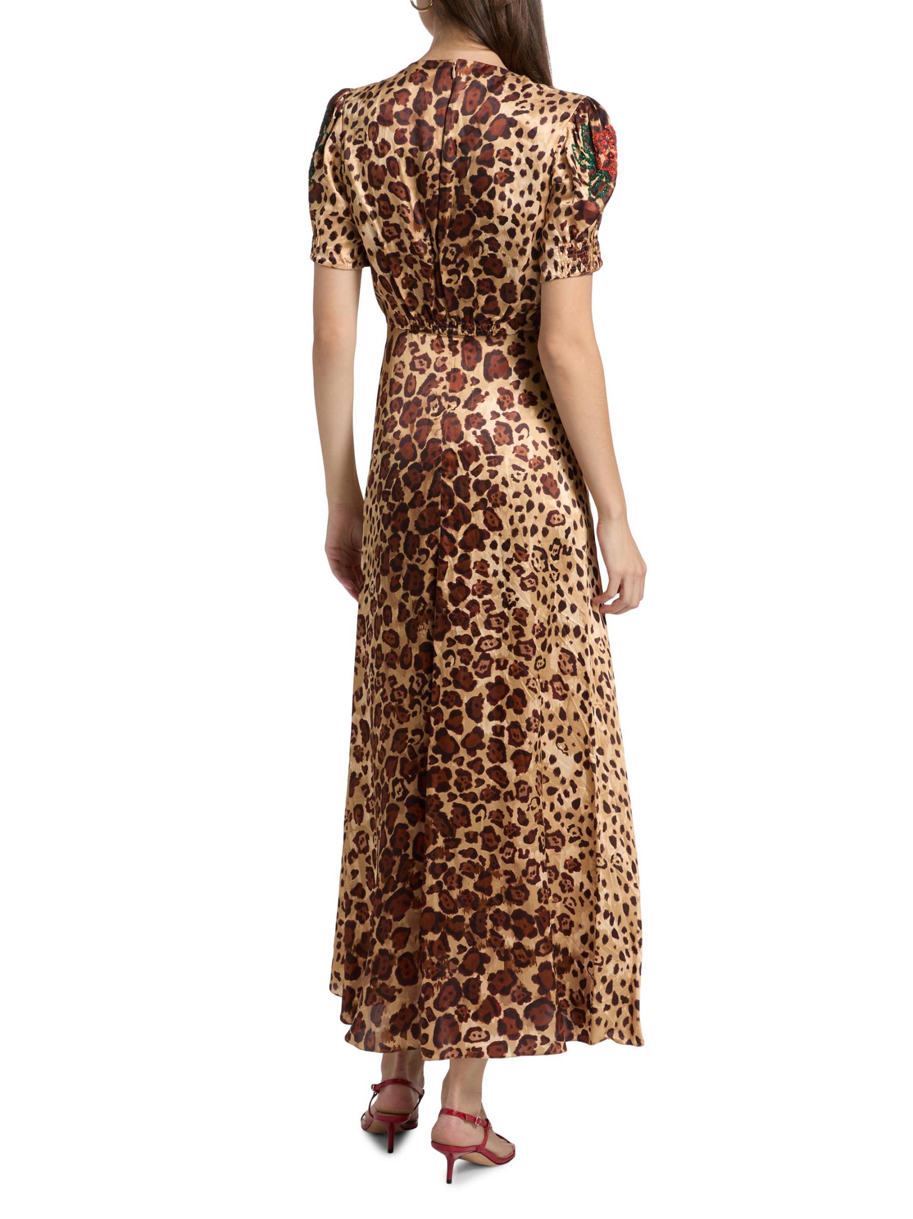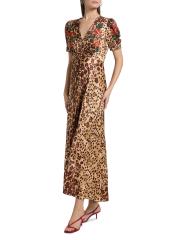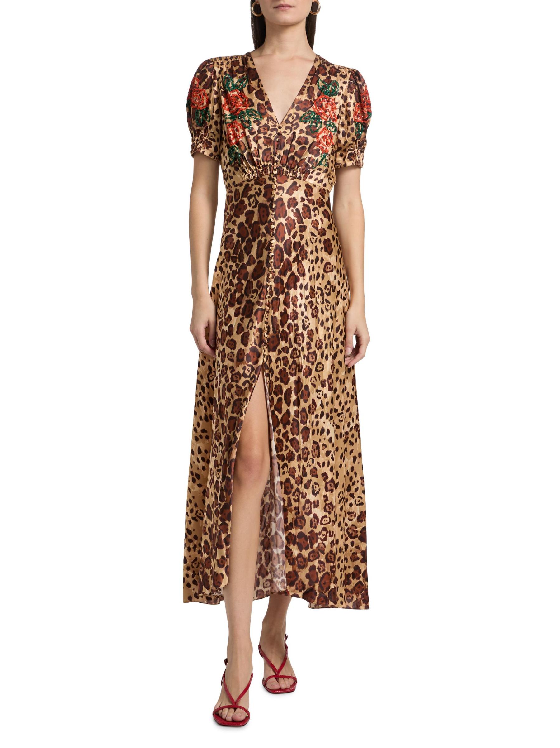 Crafted from a lightweight silk blend, Saloni's Lea midi-dress features a cheetah motif with charming florals at the bodice.