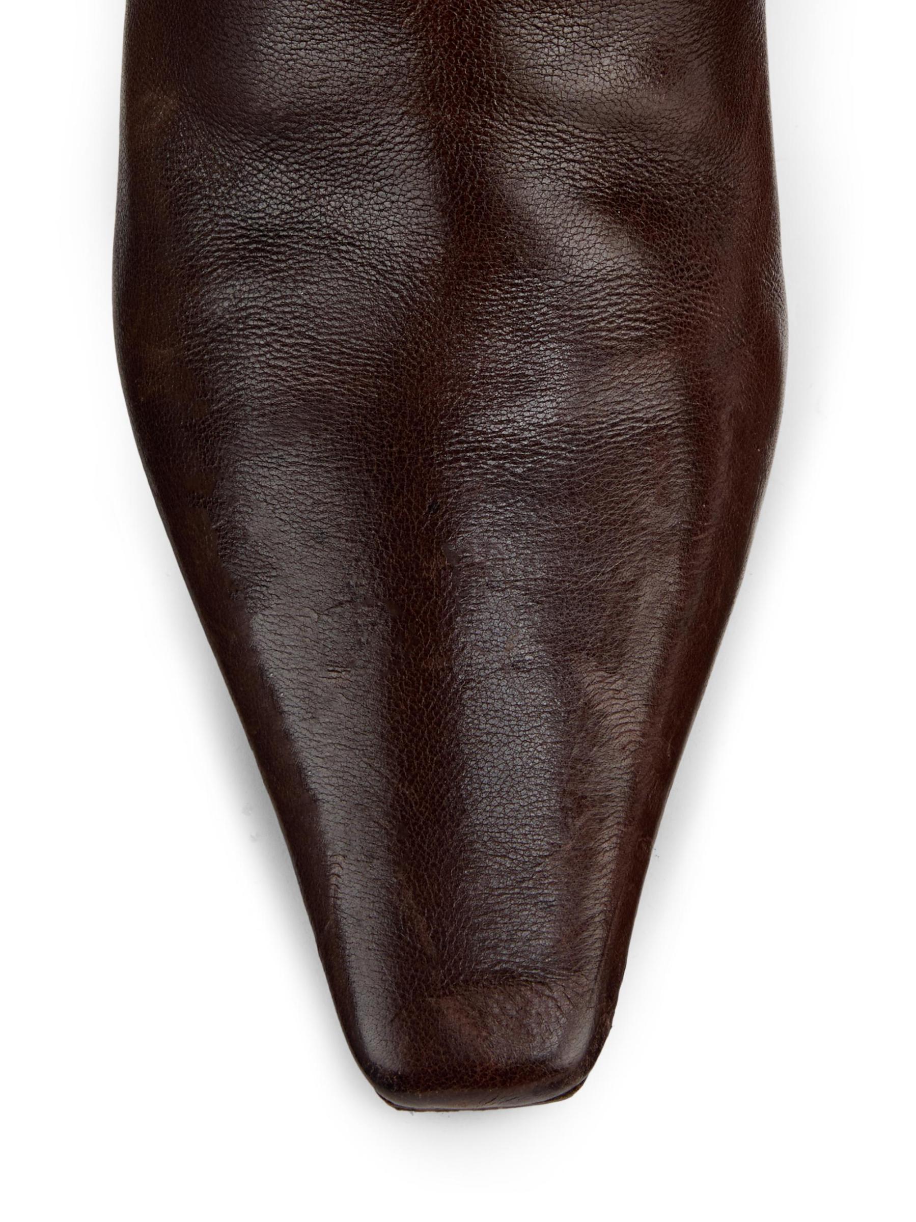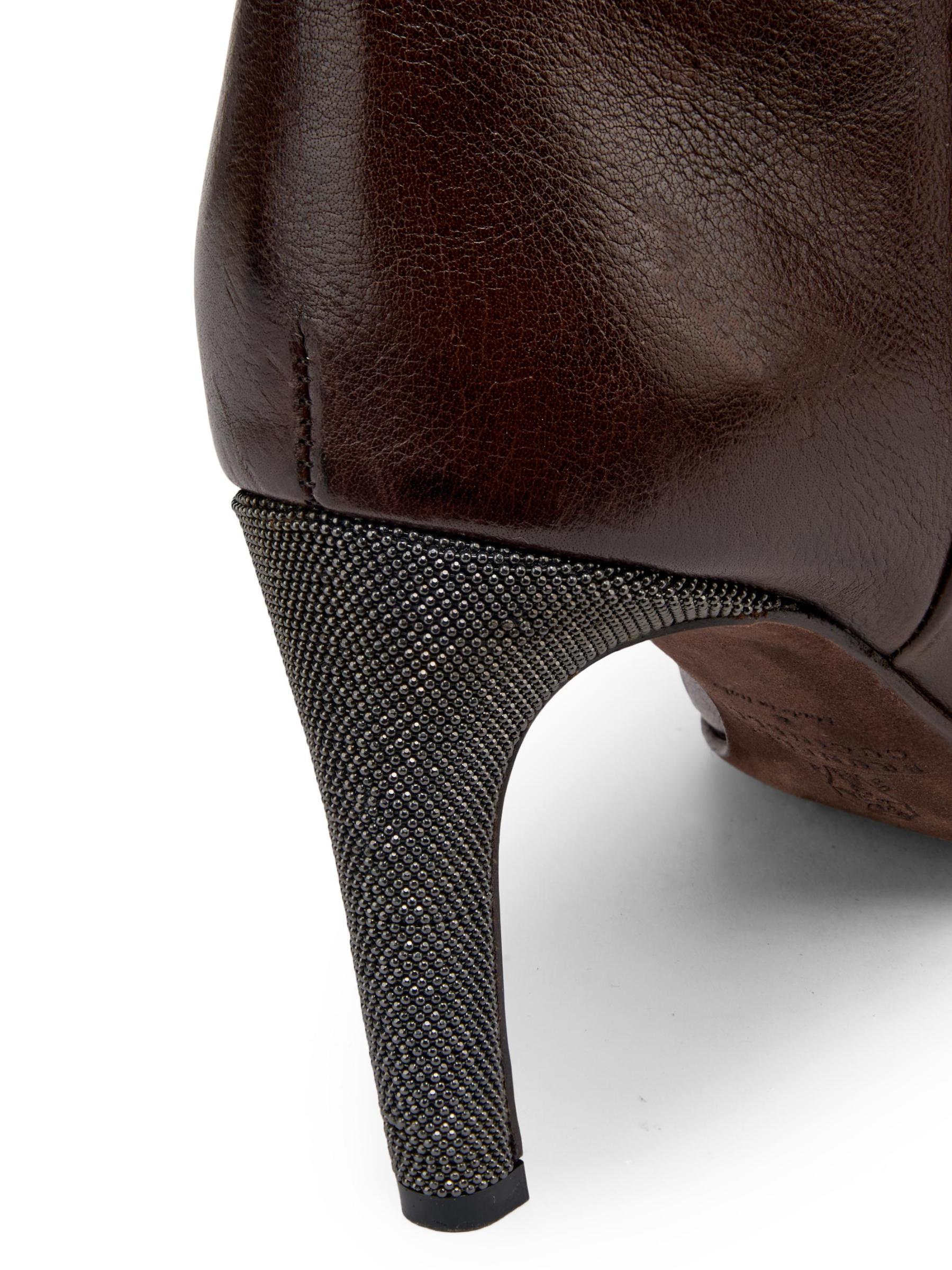 Crafted of luxe Italian leather, Brunello Cucinelli's over-the-knee boots flaunt a curved Monili heel adorned with shimmering crystals. This sleek pull-on pair features a sharp square toe.