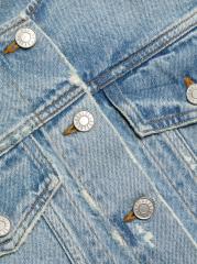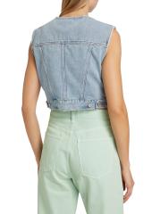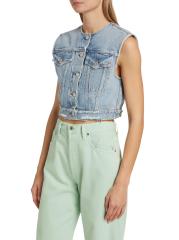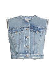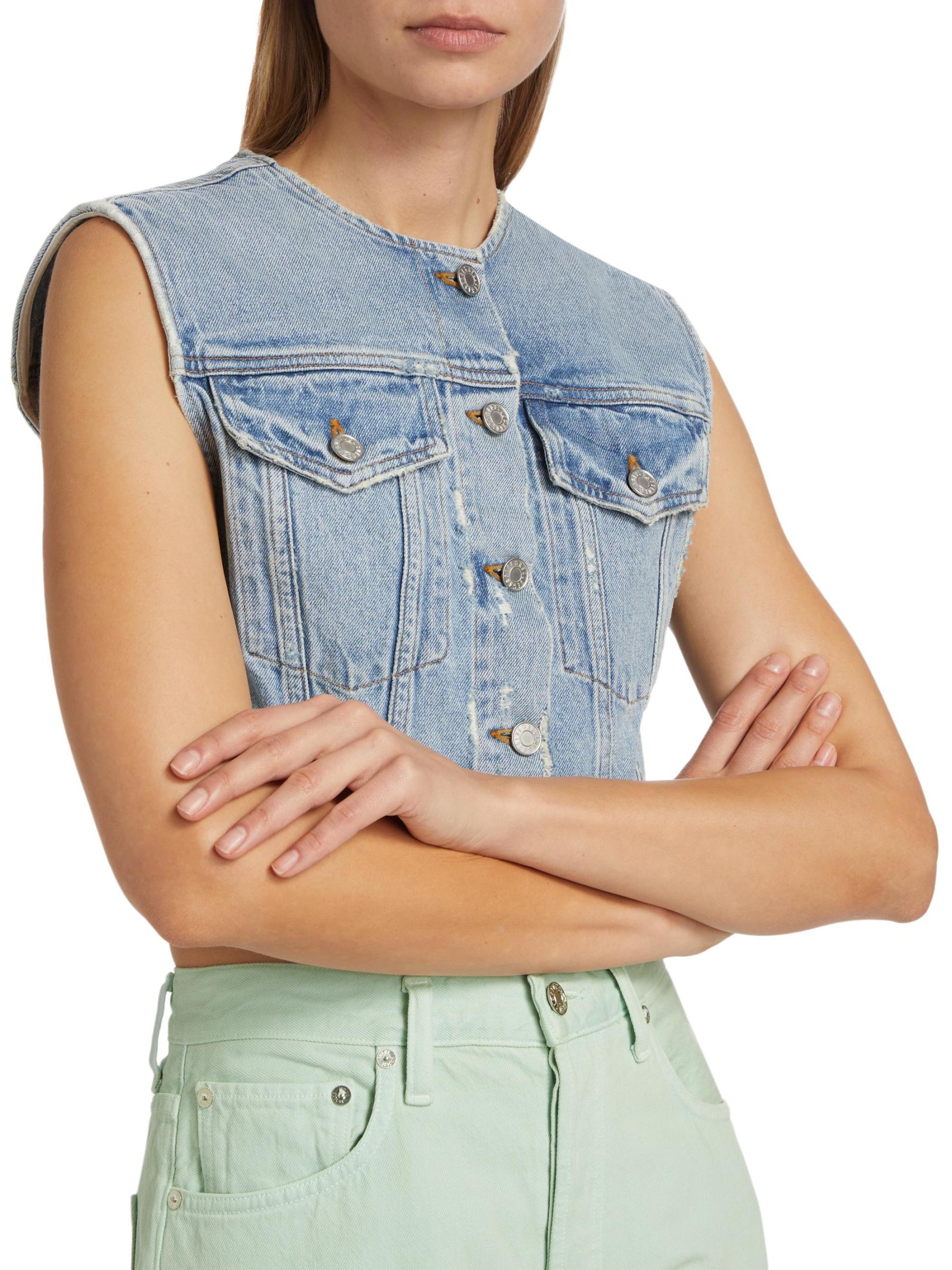 Crafted of distressed denim, Agolde's Leo vest showcases a crewneck, sleeveless cut, and chest flap pockets.Crewneck Sleeveless Chest button-through flap pockets Button front closure 100% Cotton Machine wash Imported