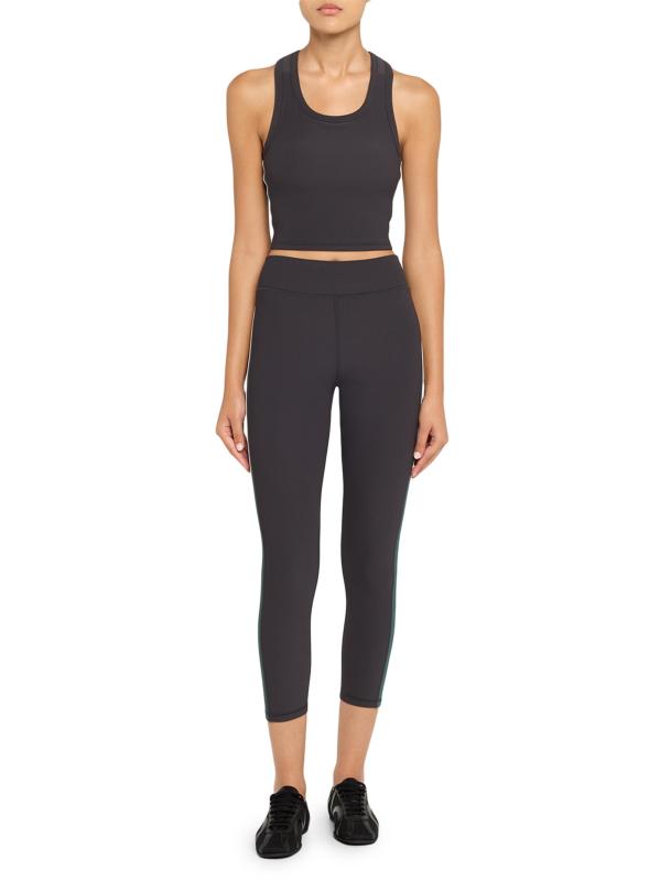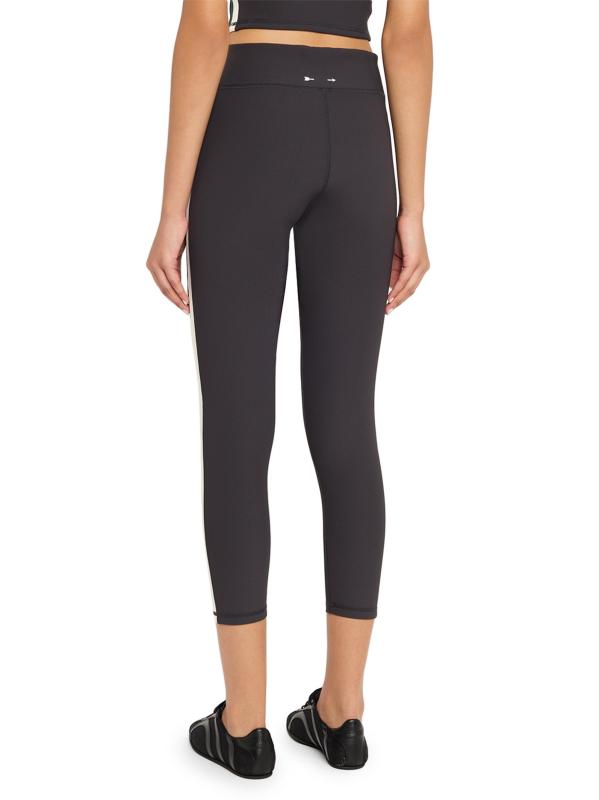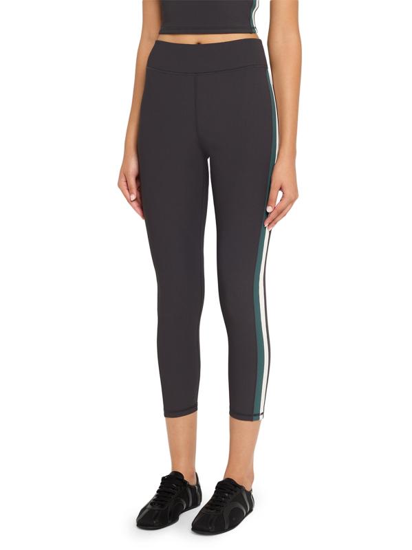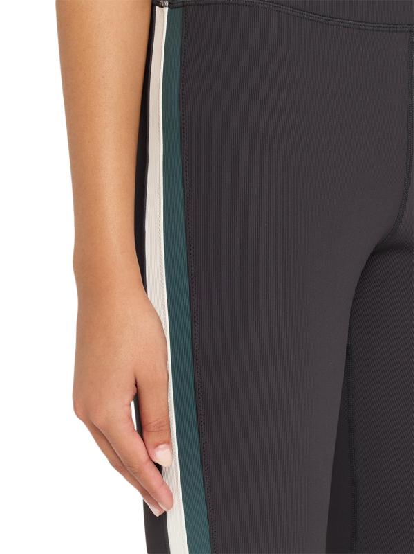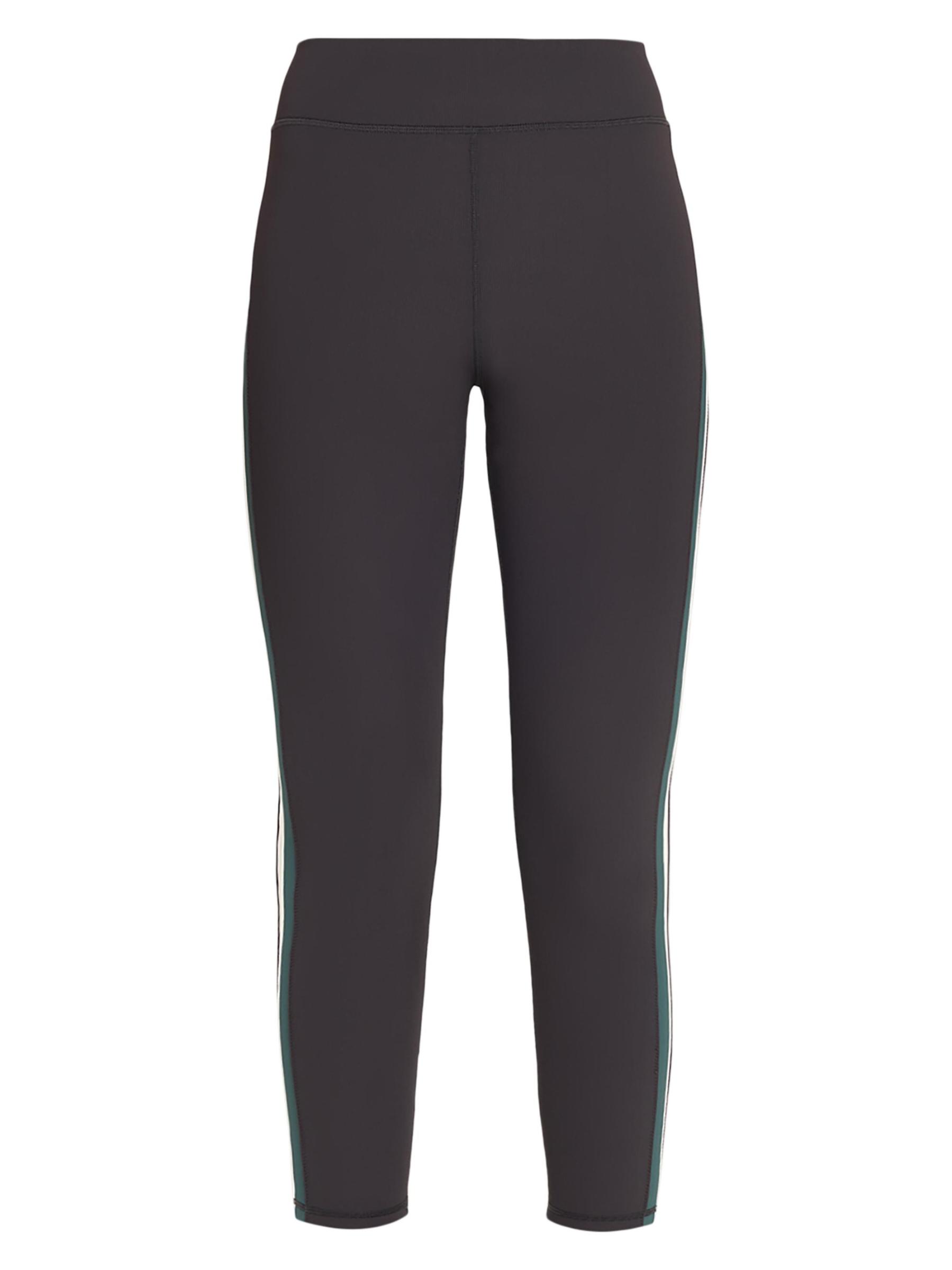 Contrast side stripes define the Limiter leggings from The Upside.This style is crafted of a stretch fabric and cut in an ankle-length silhouette.