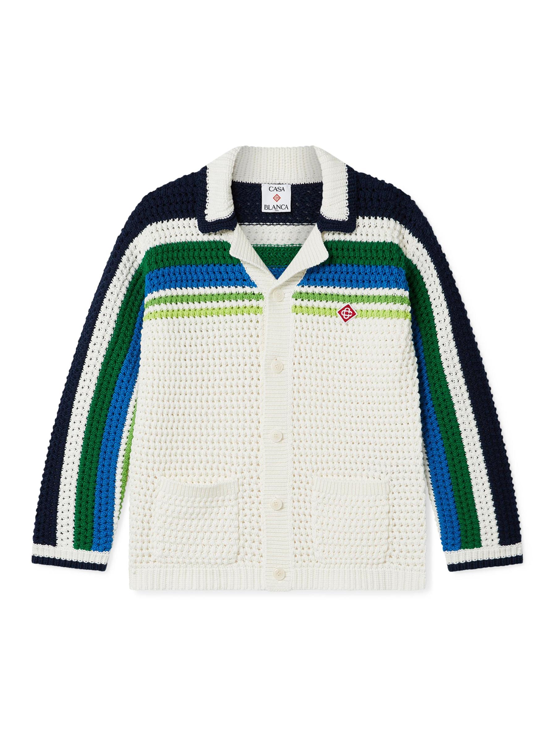 Crafted of cotton, this Casablanca button-front shirt is knit with a crochet design and accented with a multicolored striped pattern.