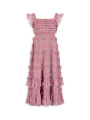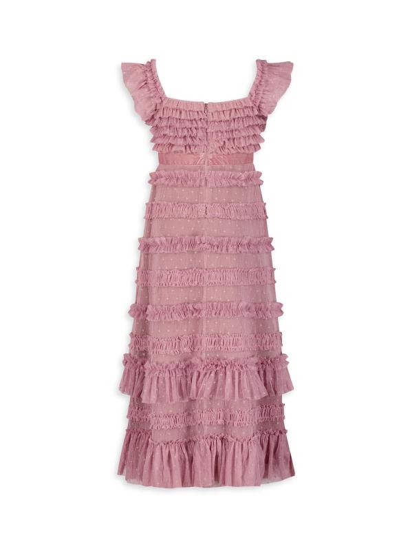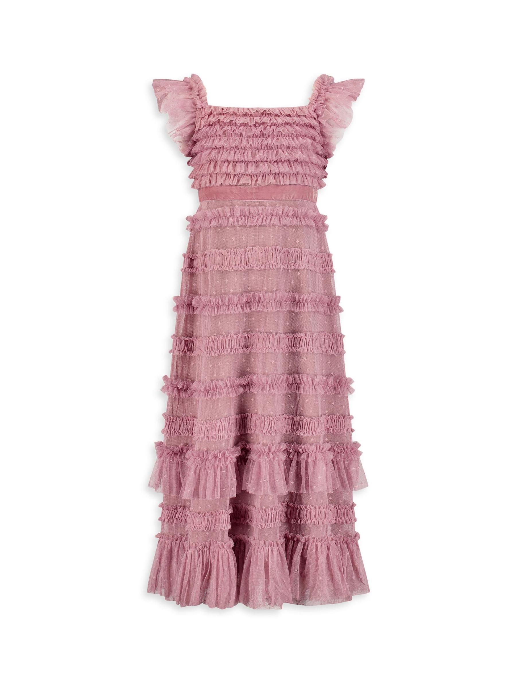 This tiered ruffle gown from Mac Duggal features a square neckline, sheer cap sleeves, and a velvet-trimmed belt at the waist.