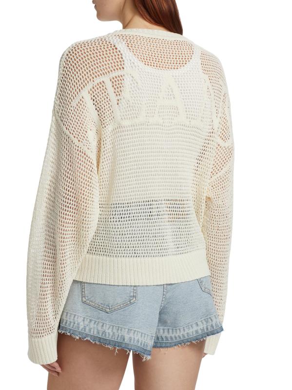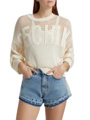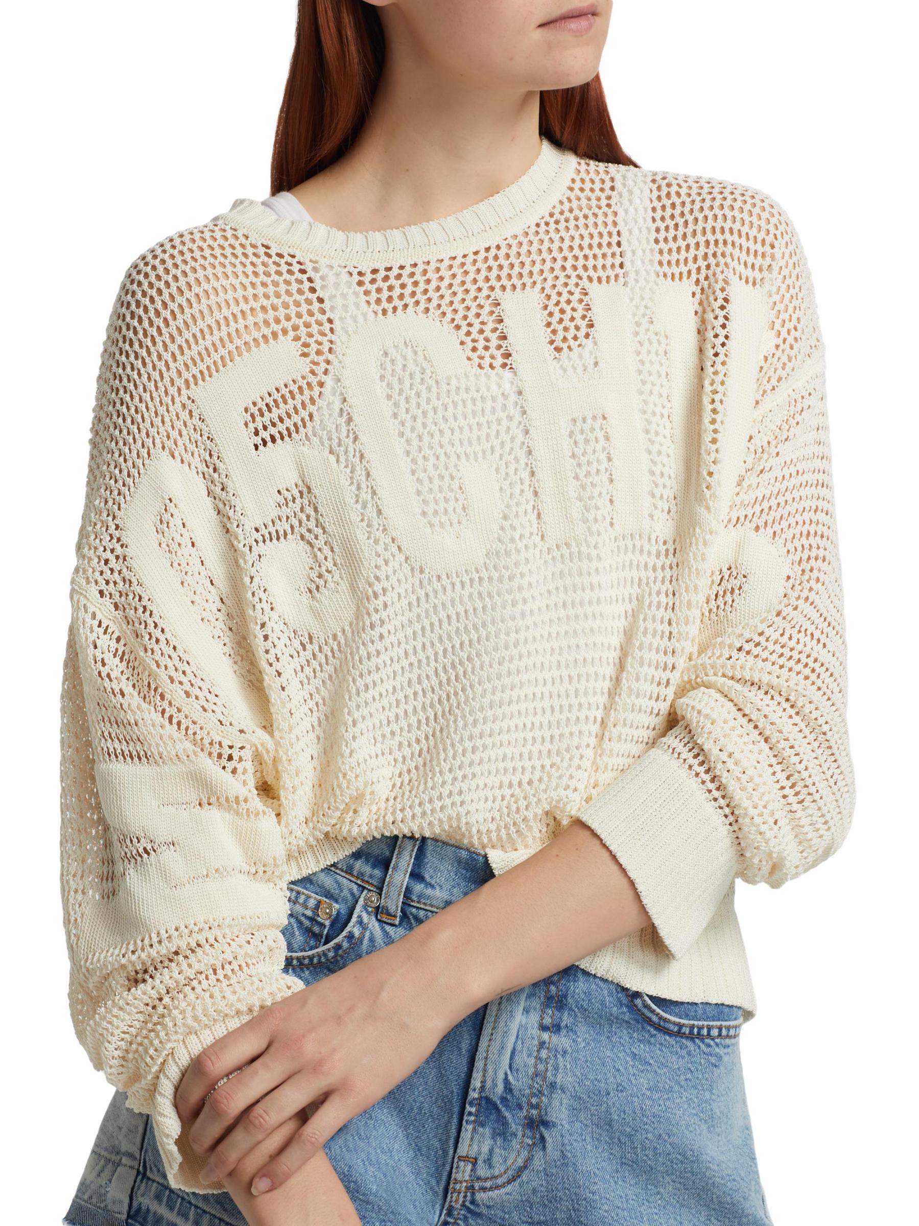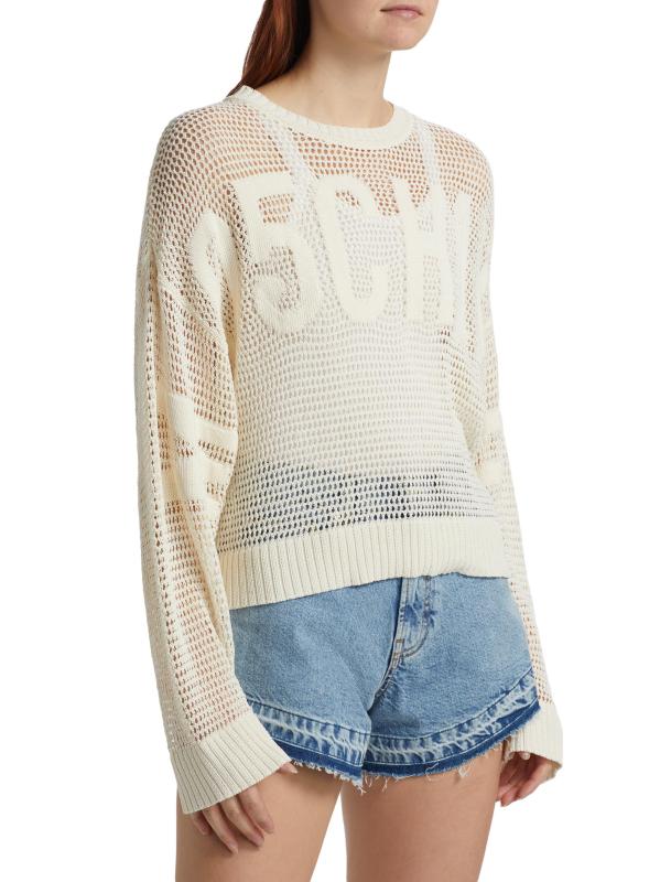 Moschino Jeans' mesh stretch sweater showcases a classic crewneck, a tonal logo at the chest, and a lightweight cotton blend.Crewneck Long sleeves Pulls over 75% cotton/25% polyester Dry clean Made in Italy