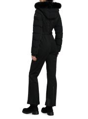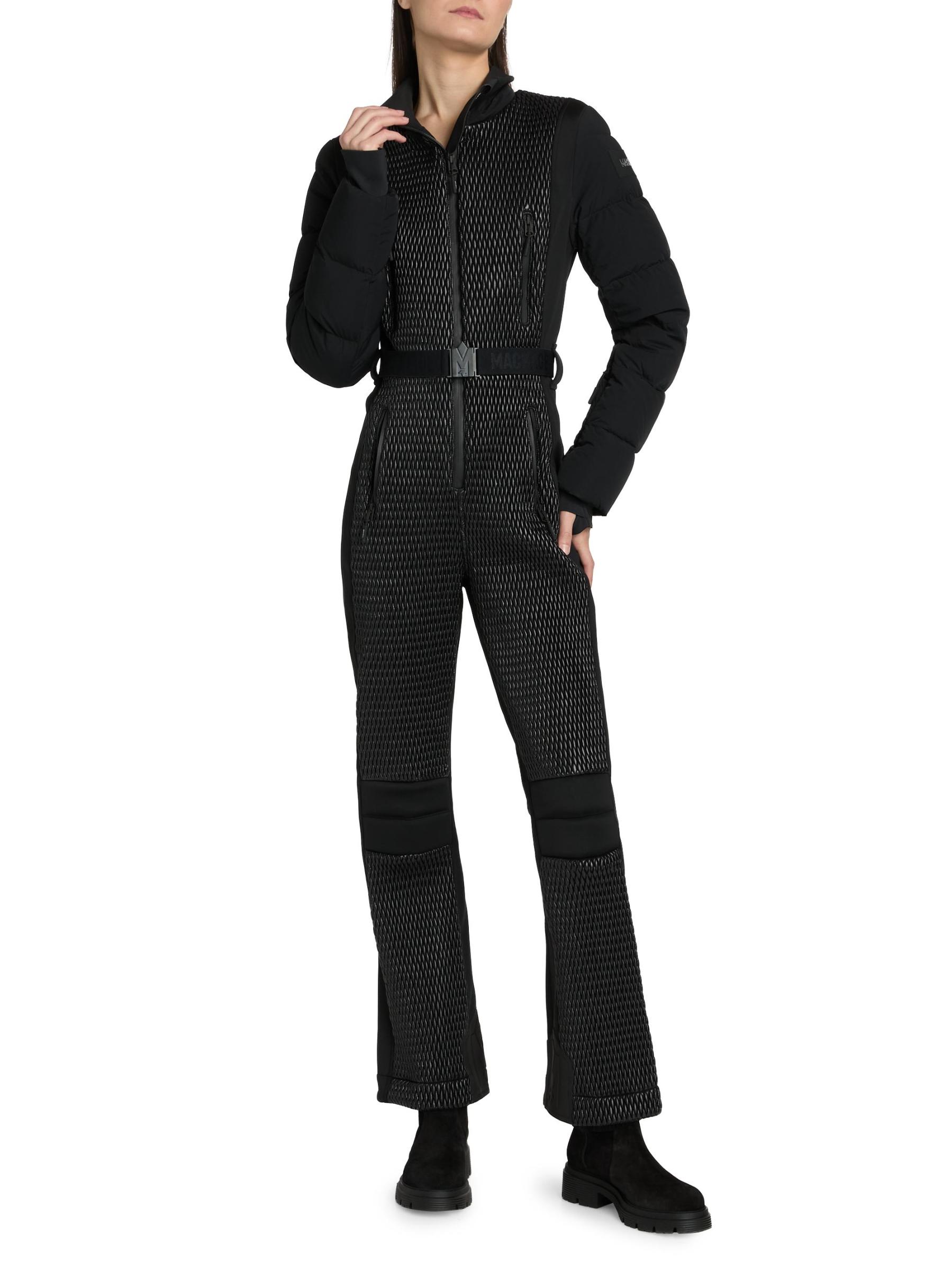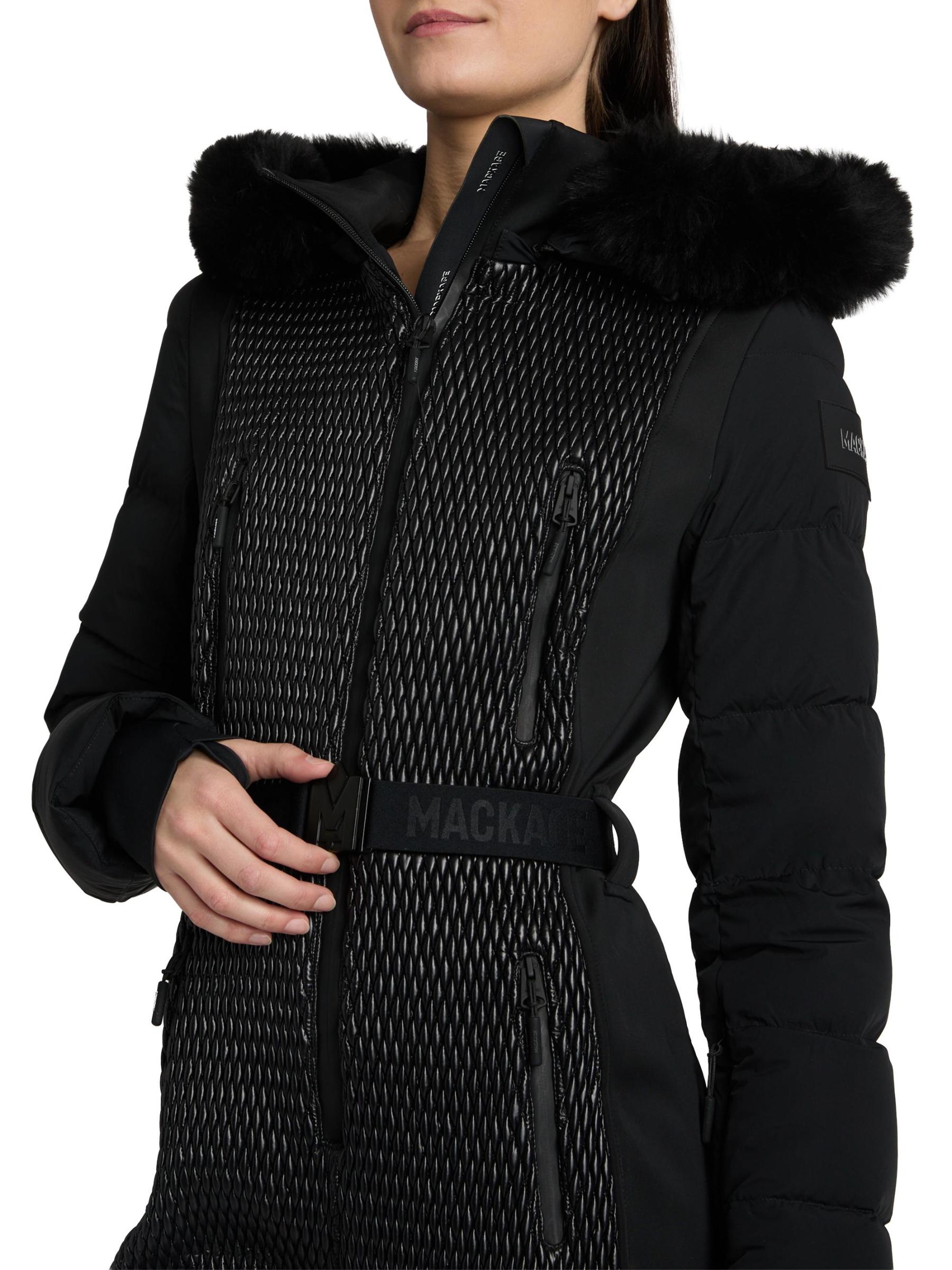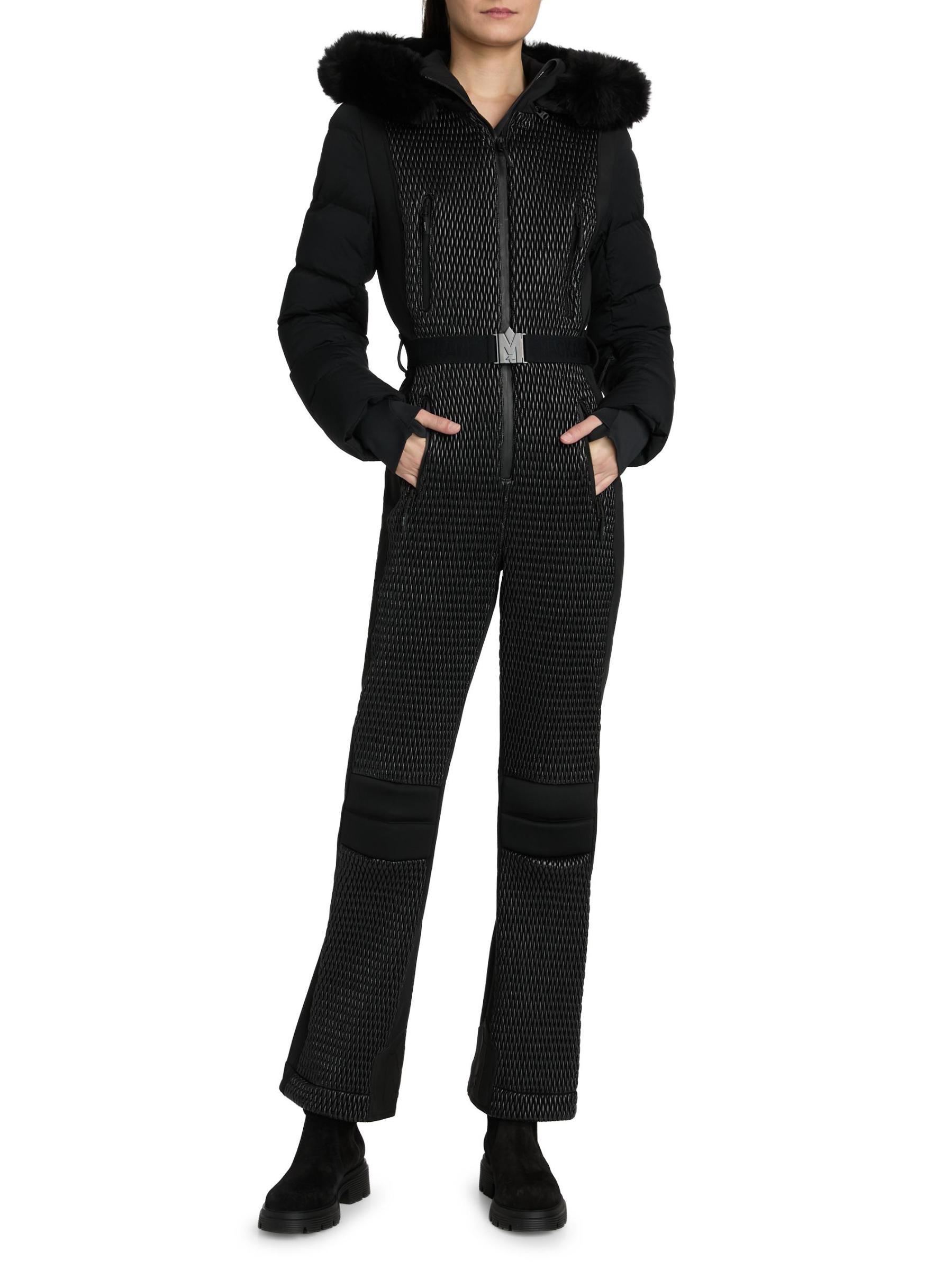 A sleek and technical one-piece for all-day warmth and on-slope ease, the Lorelle ski suit from Mackage is crafted of bonded fleece. Smocking details the front and upper back while channel quilting adds mixed-media detail to the sleeves. Designed for peak alpine performance, this style features a removable hood with removable shearling trim, an adjustable branded belt, and water-resistant zip closures. Snow gaiters offer extra protection, while storm cuffs trap in the warmth.