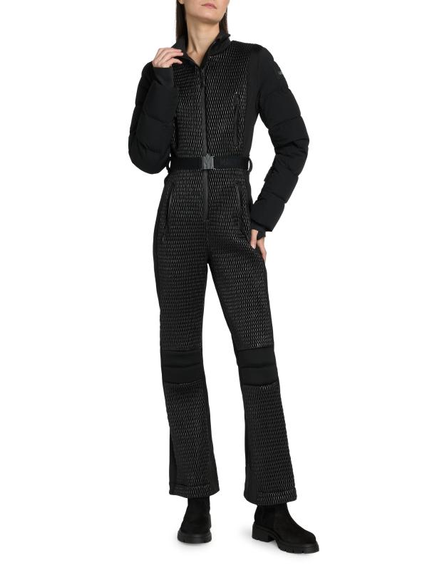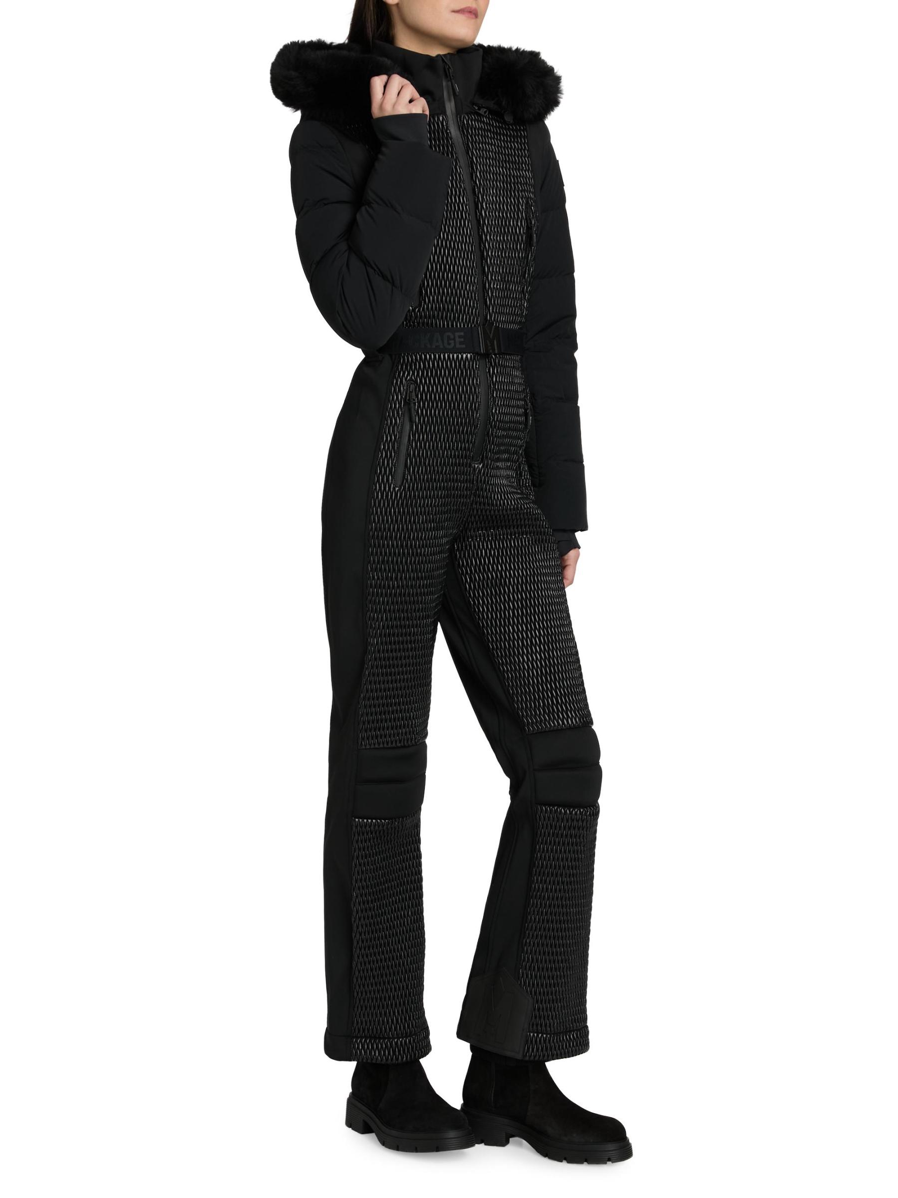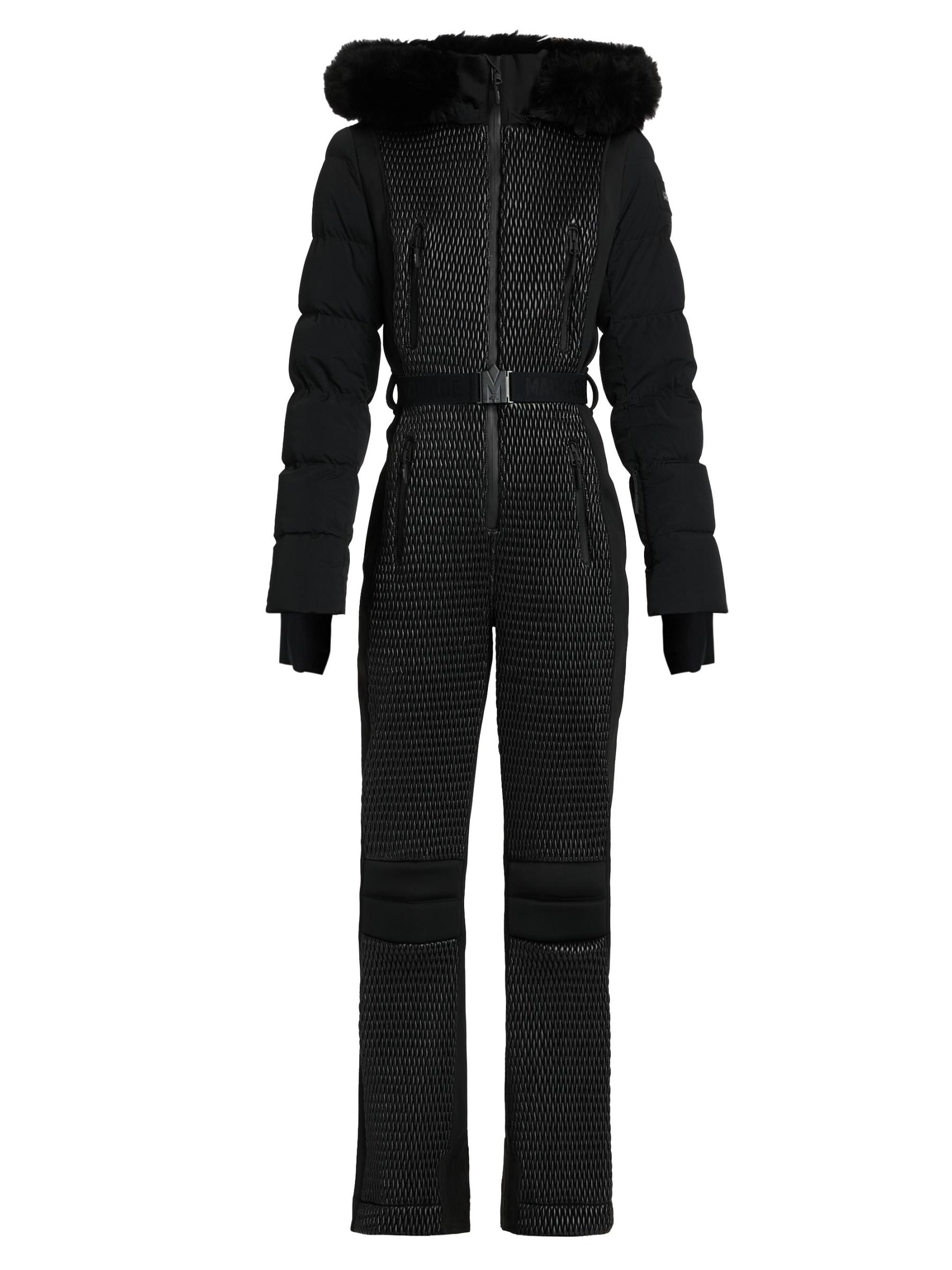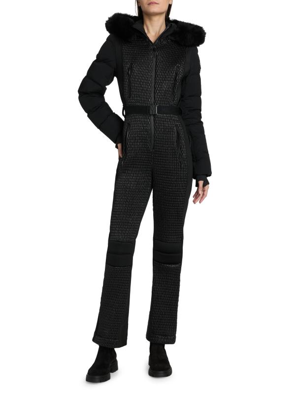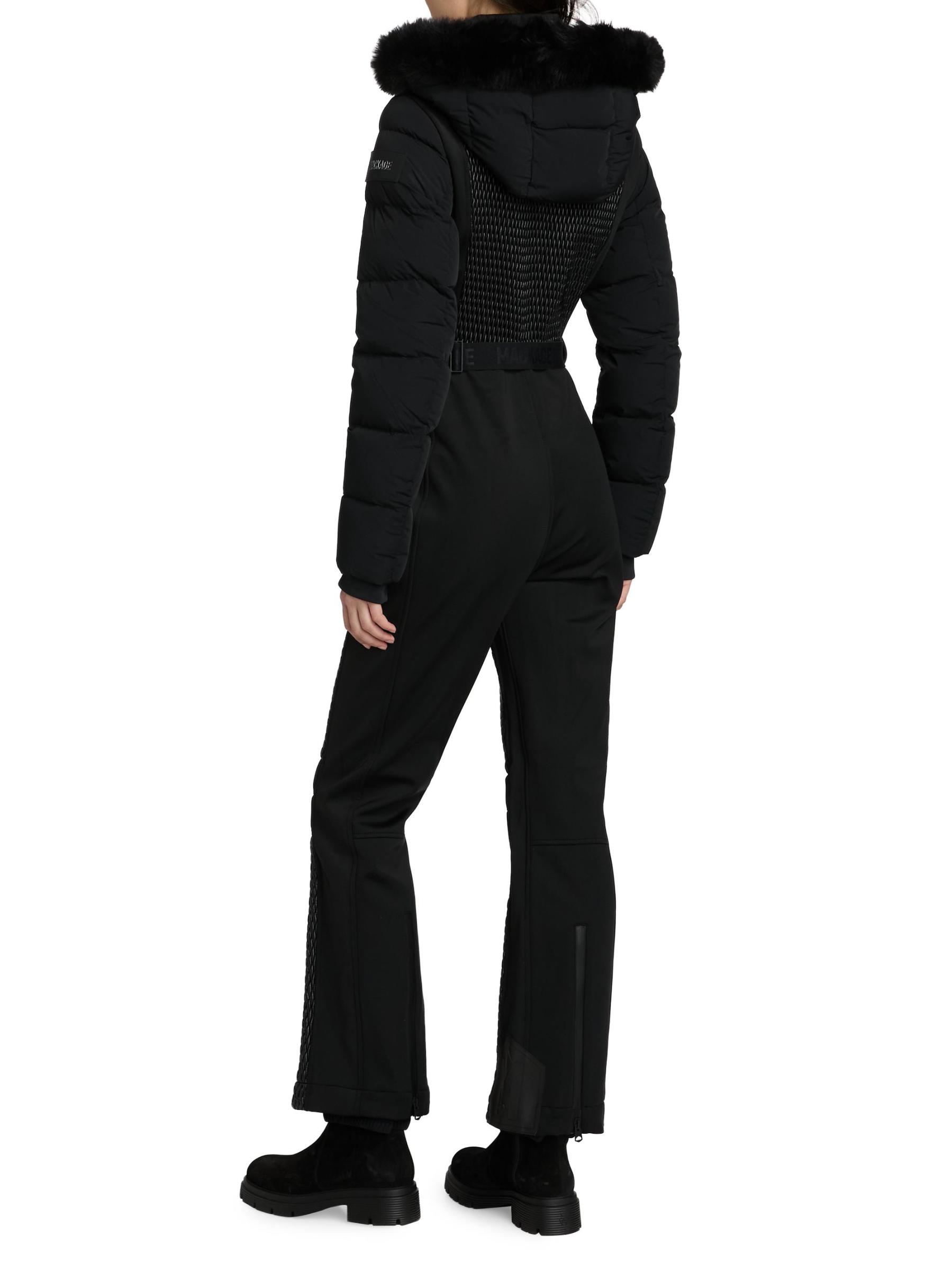 A sleek and technical one-piece for all-day warmth and on-slope ease, the Lorelle ski suit from Mackage is crafted of bonded fleece. Smocking details the front and upper back while channel quilting adds mixed-media detail to the sleeves. Designed for peak alpine performance, this style features a removable hood with removable shearling trim, an adjustable branded belt, and water-resistant zip closures. Snow gaiters offer extra protection, while storm cuffs trap in the warmth.Removable hood Stand collar Long sleeves Chest and side zip pockets Belted Zip hem Front zip closure 100% nylon Combo: 82% polyamide/18% elastane Fill: 100% polyester Trim: 100% leather Fur type: Shearling Fur origin: Iceland Machine wash Imported
