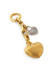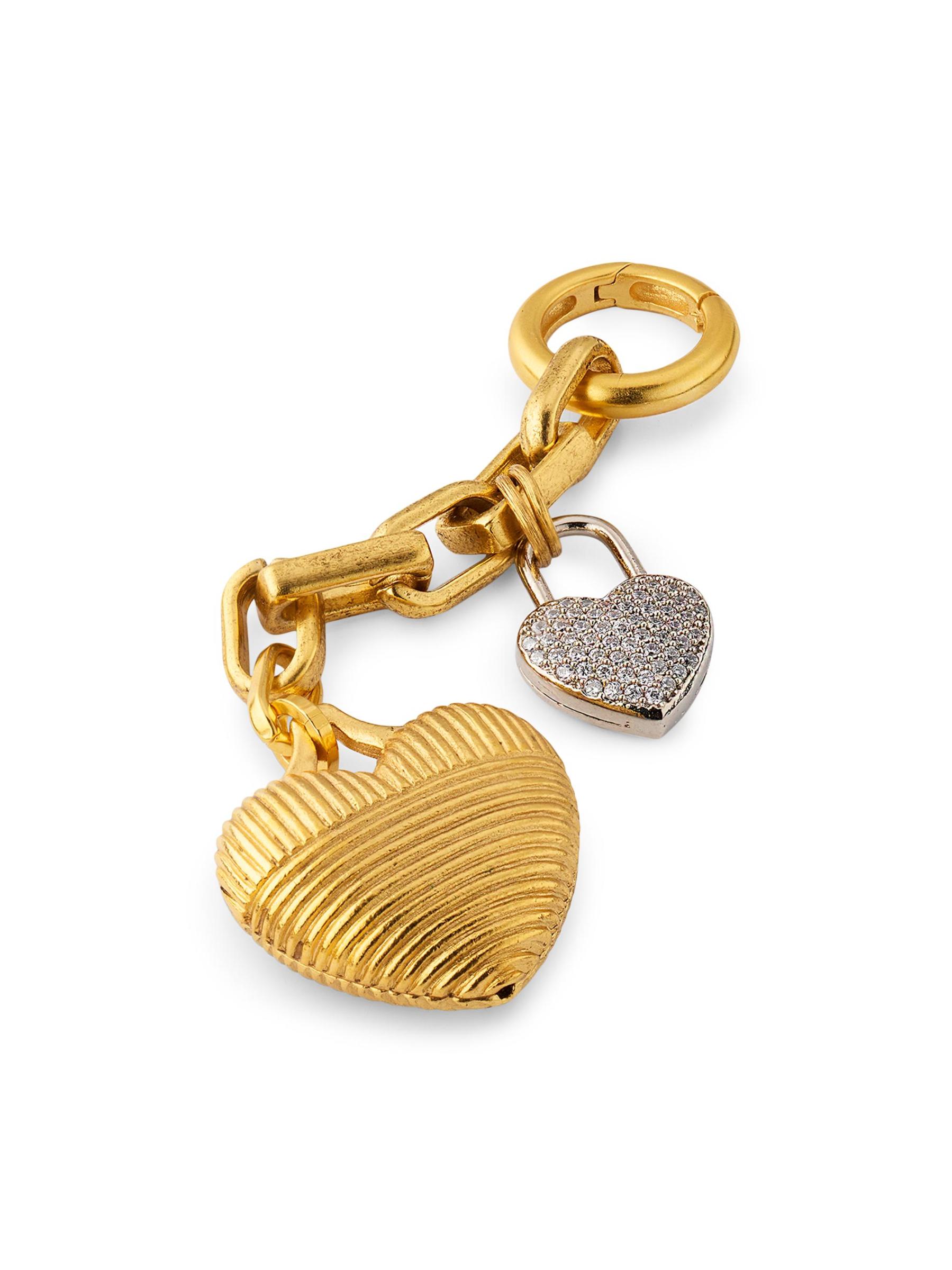 The Mallory bag charm from Elizabeth Cole is crafted of 24K-gold-platted brass and features two heart charms, one crystal embellished.