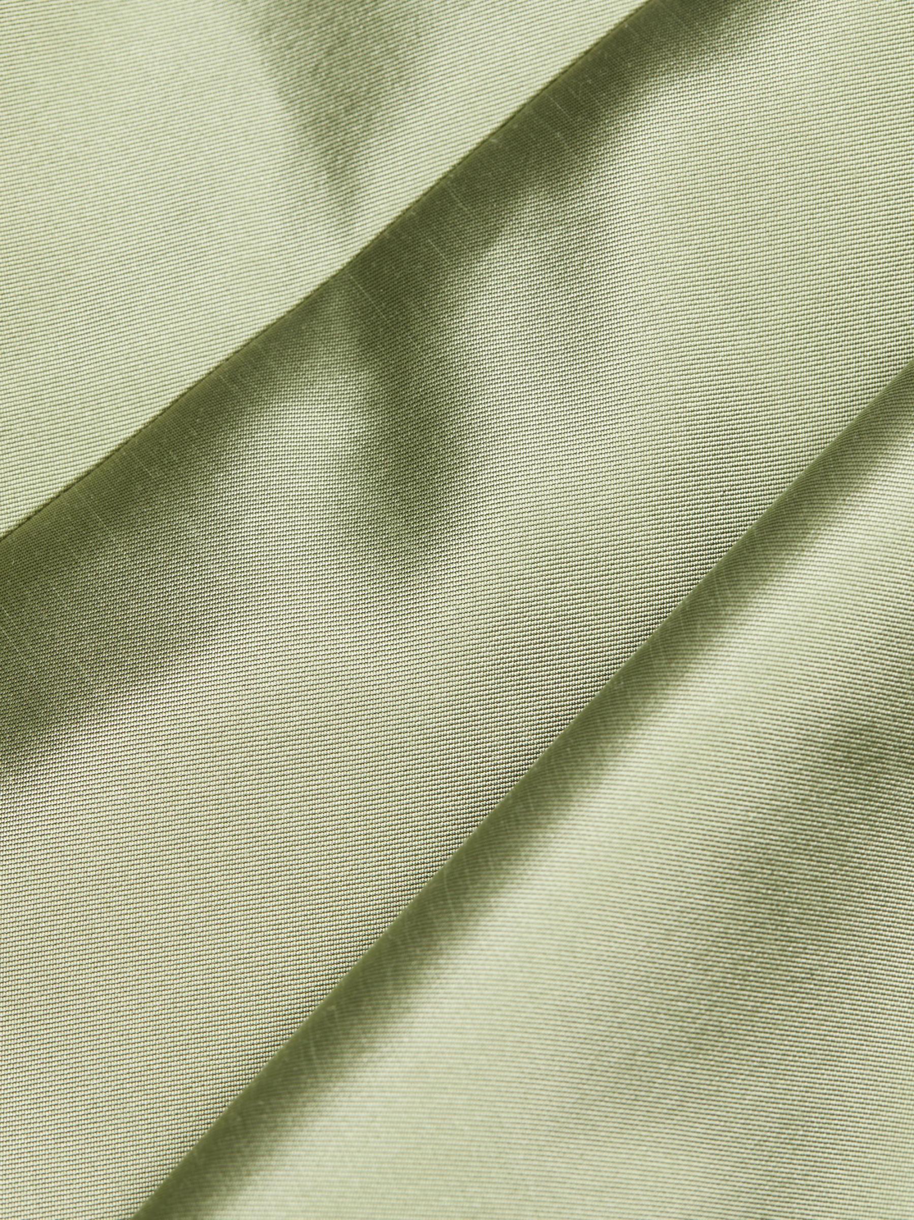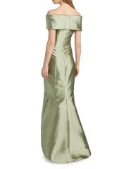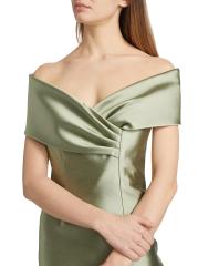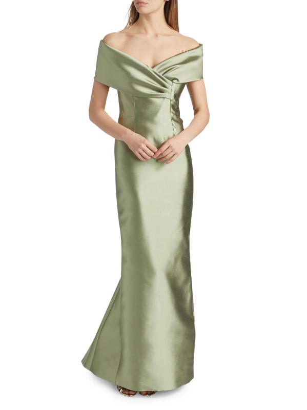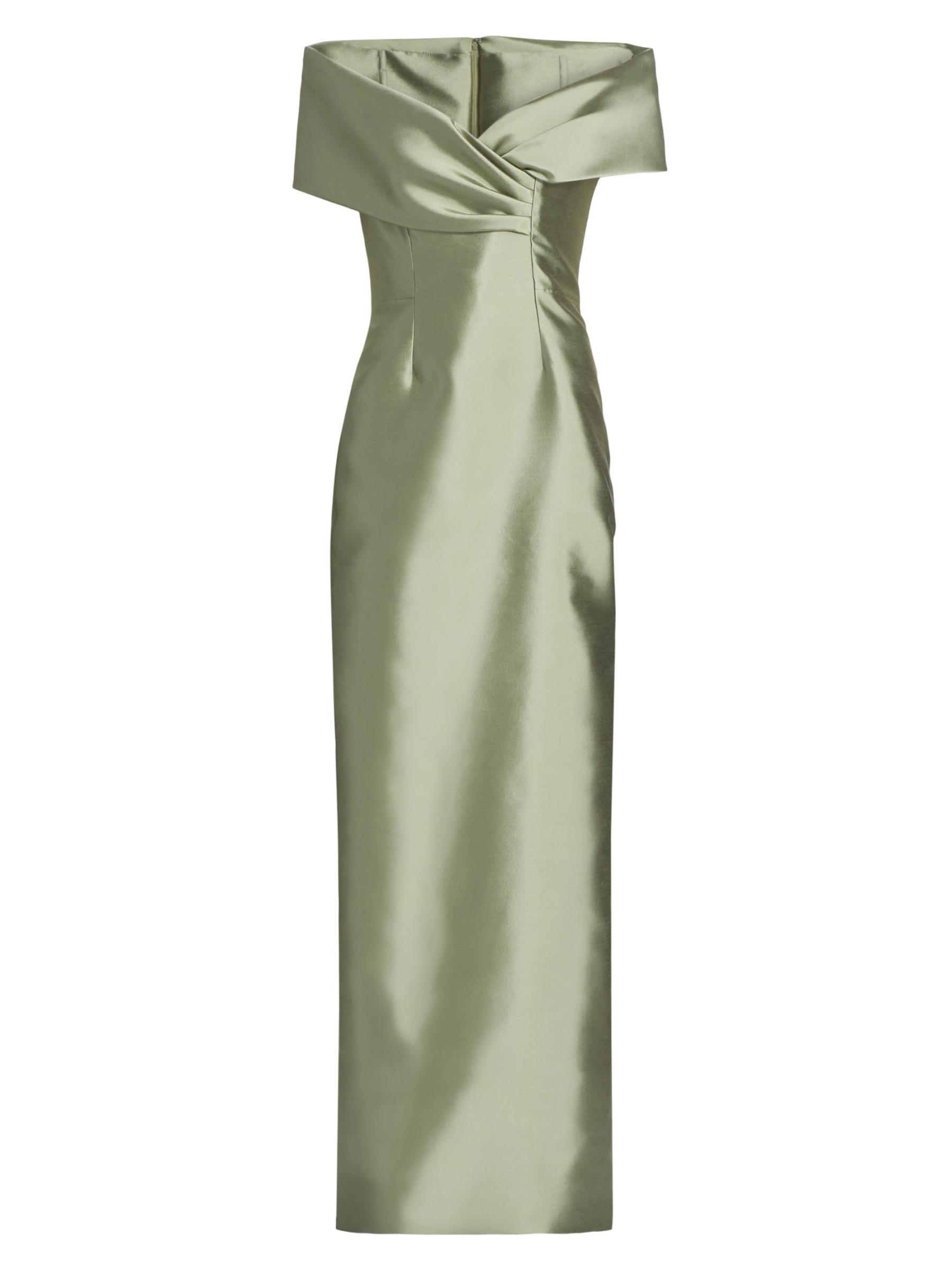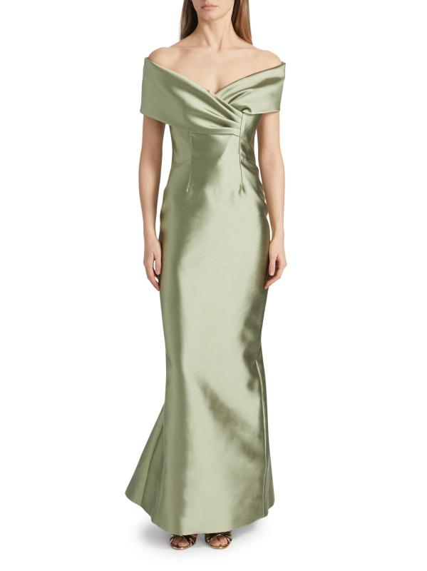 Catherine Regehr’s Margaret Gown is cut from silk radzimir to a glamorous off-the-shoulder silhouette with a trumpet hem.