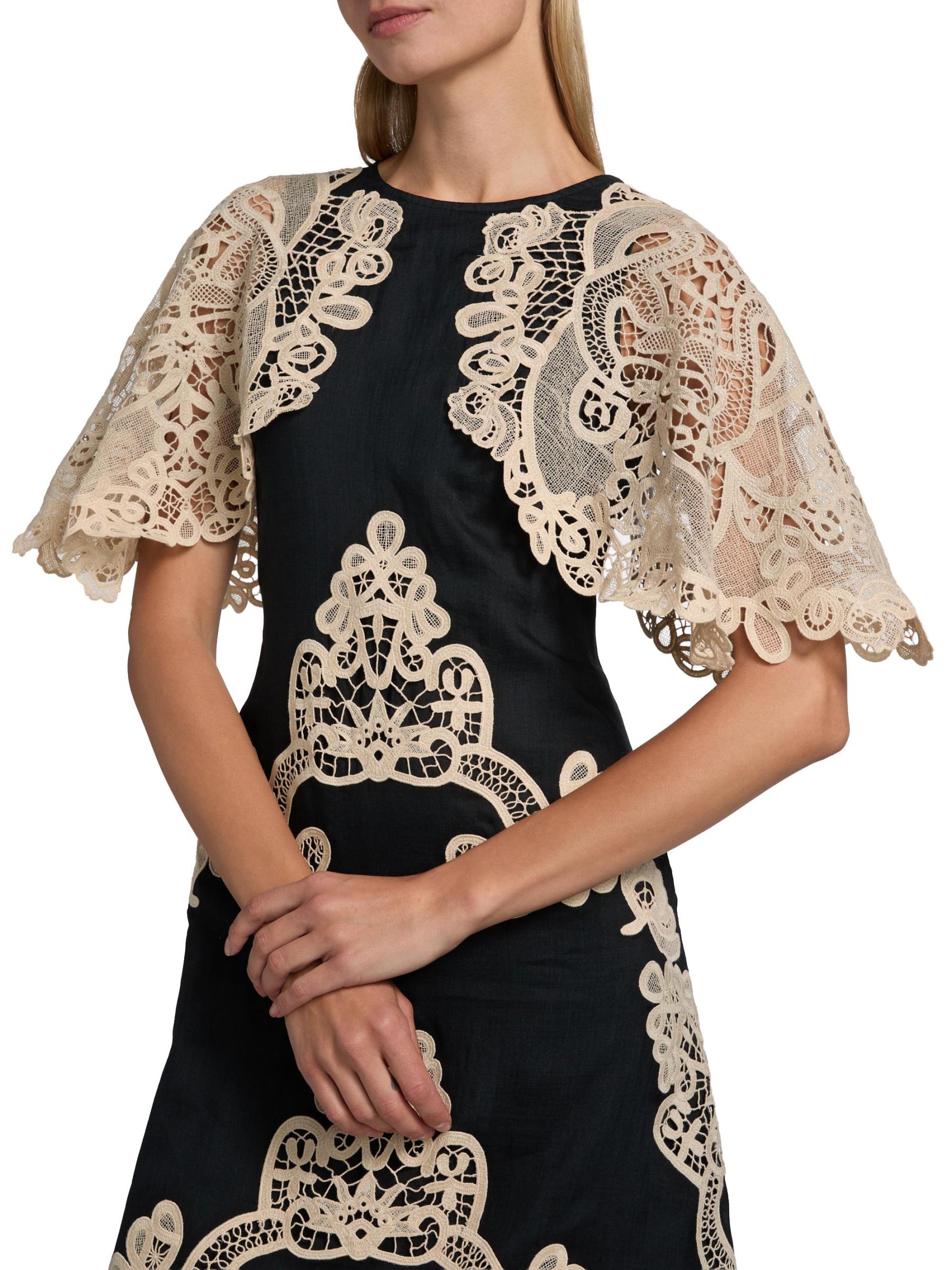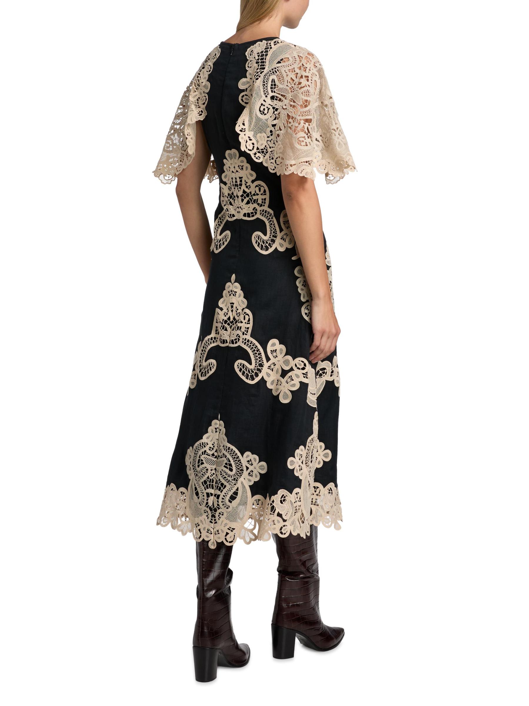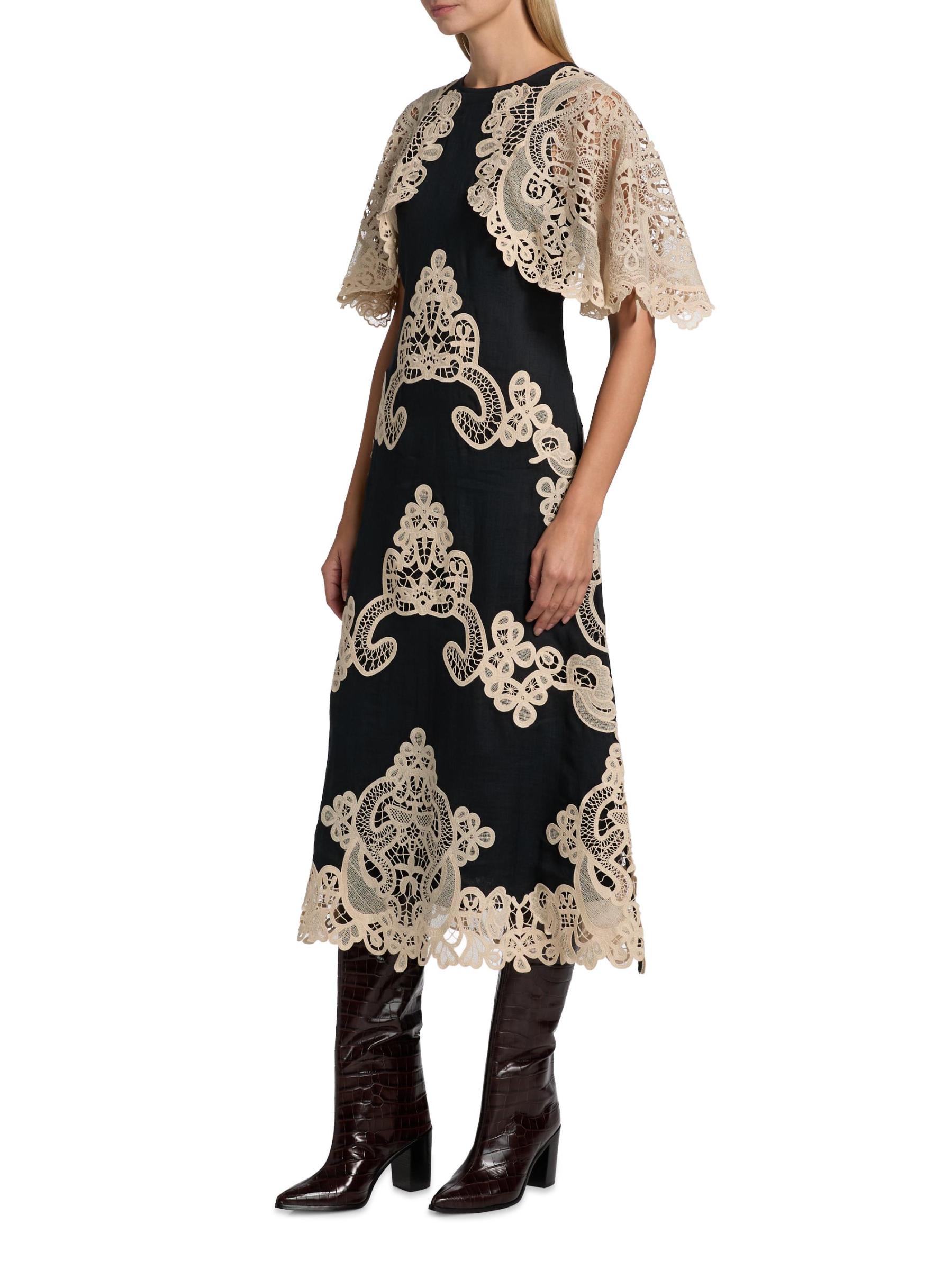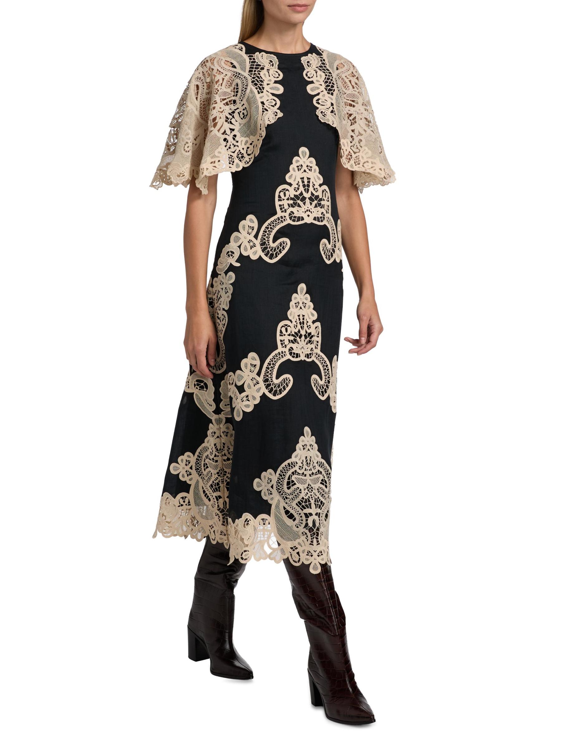 Sea’s Medina lace midi-dress is styled with a crewneck and cap sleeves.Crewneck Cap sleeves Back zip closure 100% Ramie Lining: 100% Cotton Trim: 100% Polyester Dry clean Imported