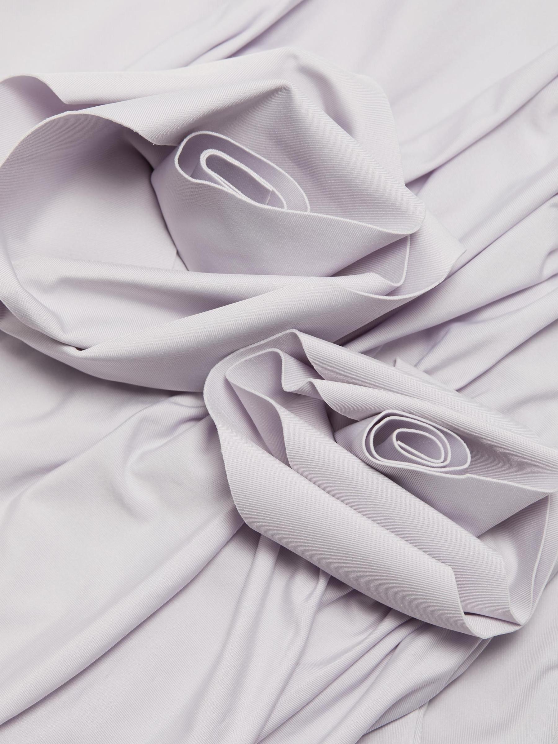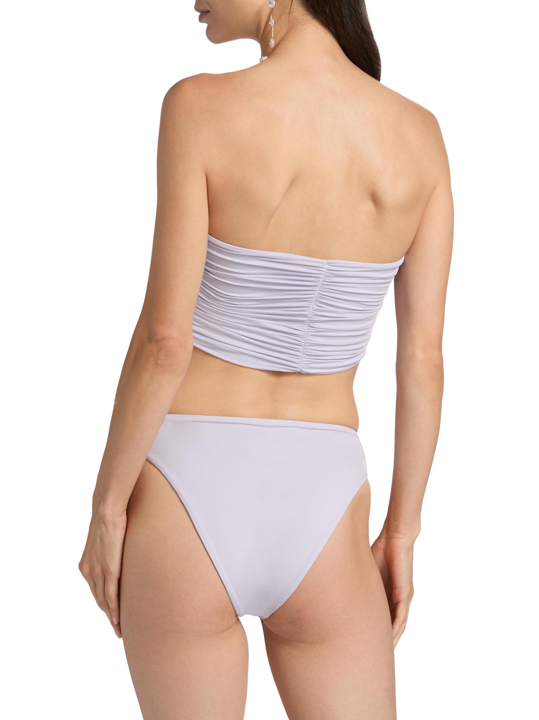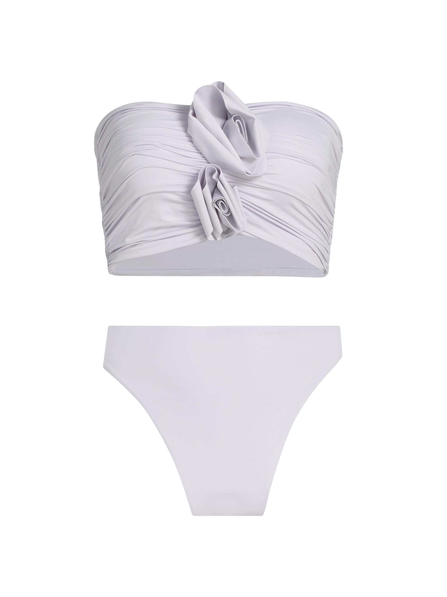 The Melao bikini set from Maygel Coronel includes a flower-appliquéd ruched strapless top and a high-waist bottom. 78% polyamide/22% elastane. Hand wash. Imported.