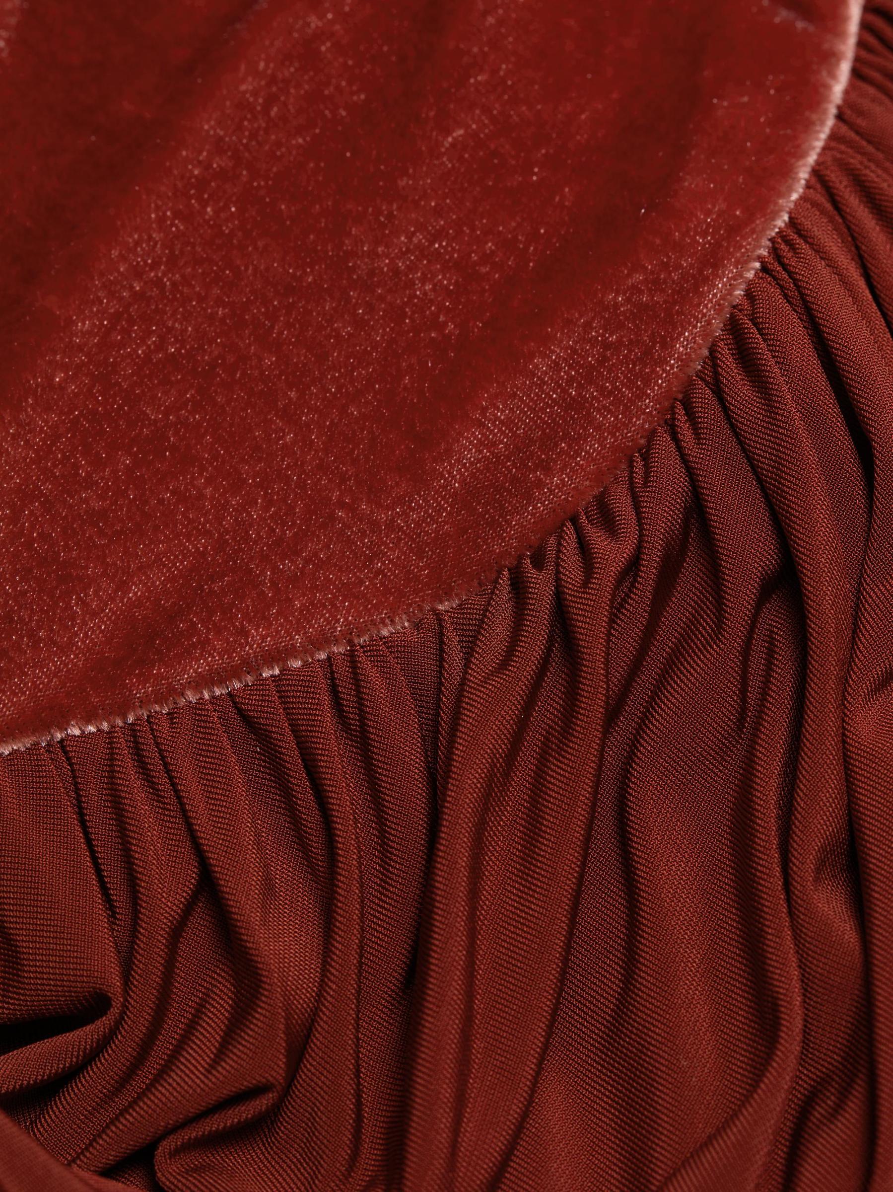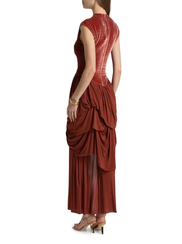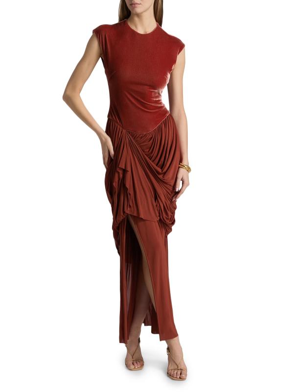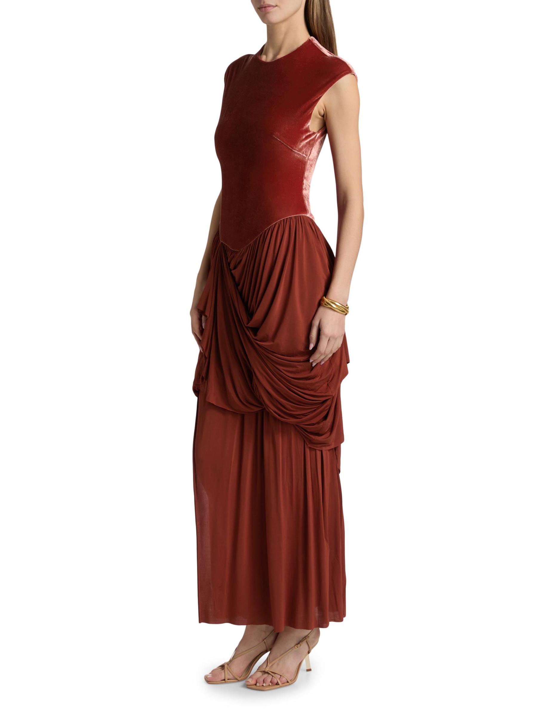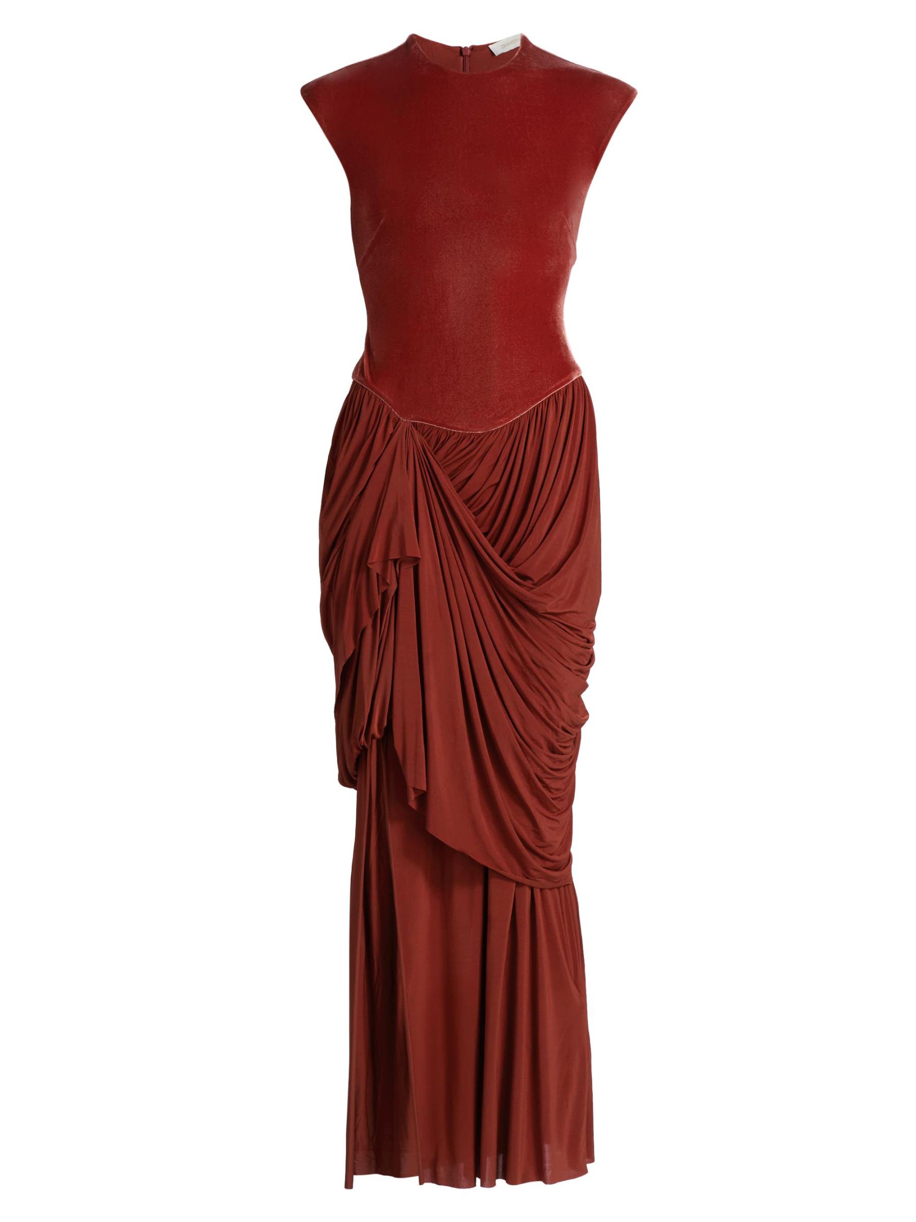 The Memento maxi dress from Zimmermann showcases a fitted velvet bodice and elegant draping at the stretch-jersey skirt.