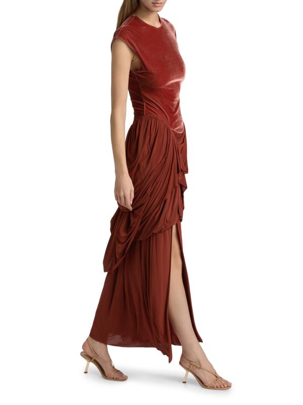The Memento maxi dress from Zimmermann showcases a fitted velvet bodice and elegant draping at the stretch-jersey skirt.Crewneck Cap sleeves Side slit Concealed back zip closure 95% polyester/5% elastane Contrast: 90% viscose/10% elastane Dry clean Imported