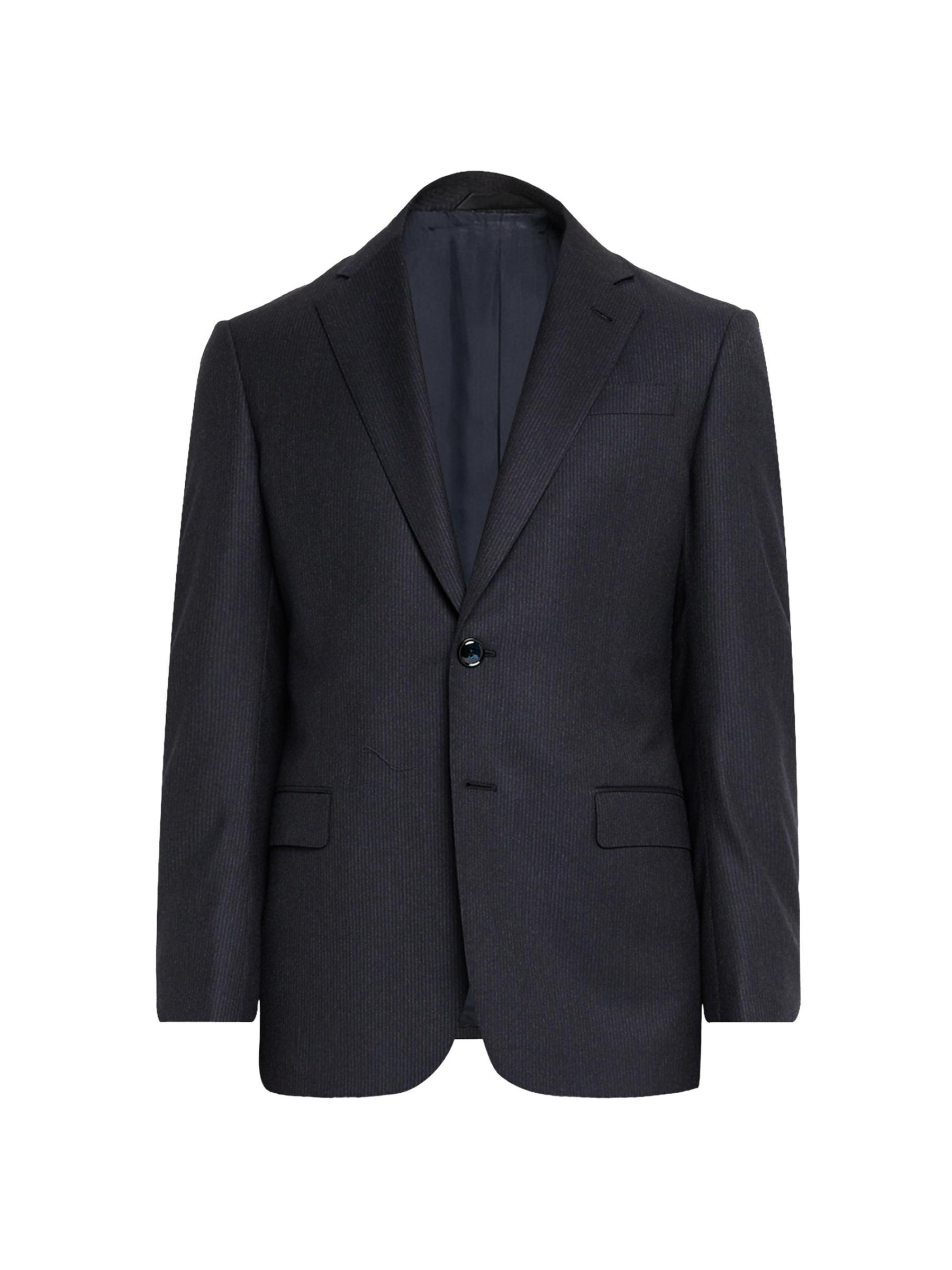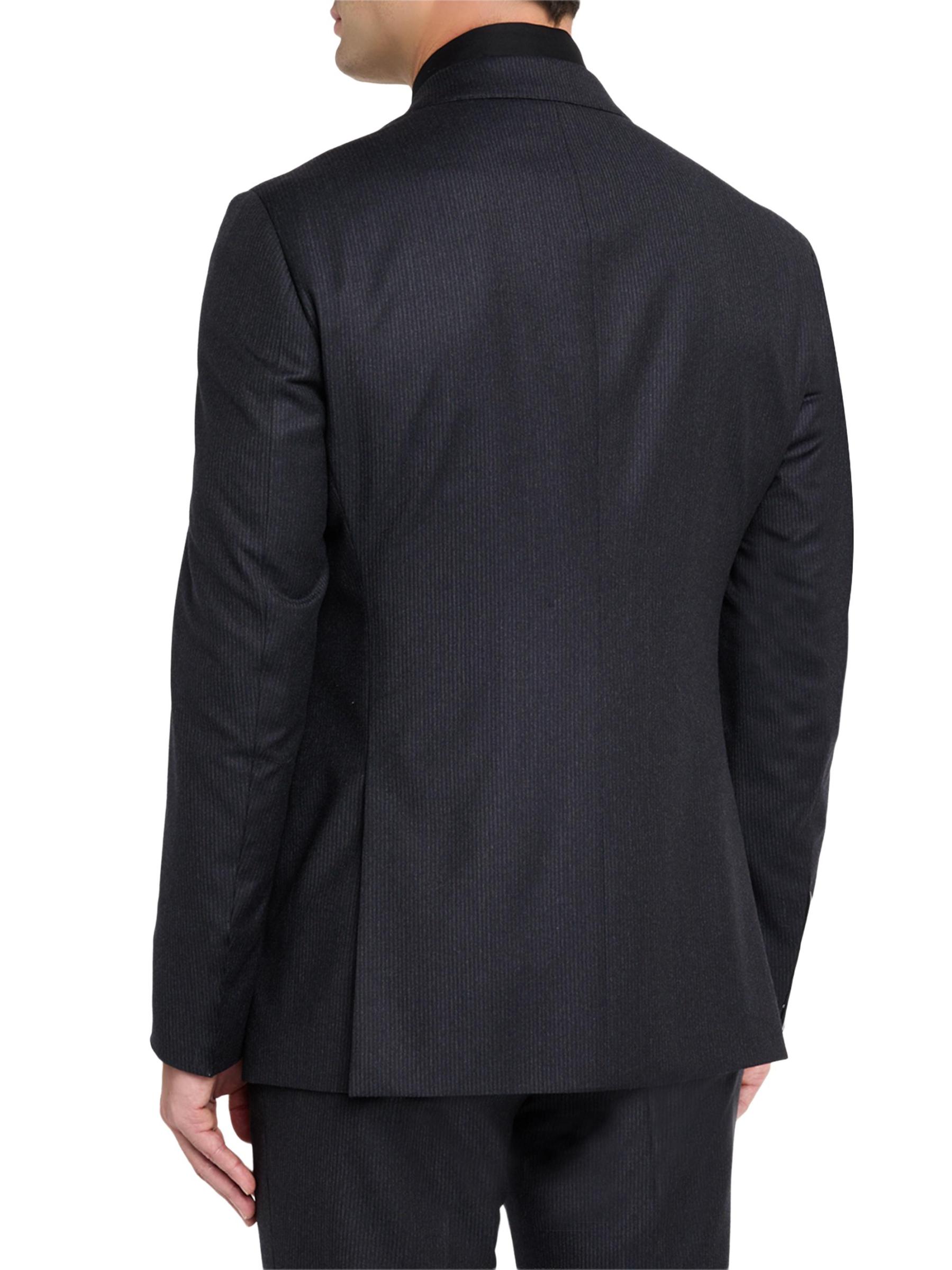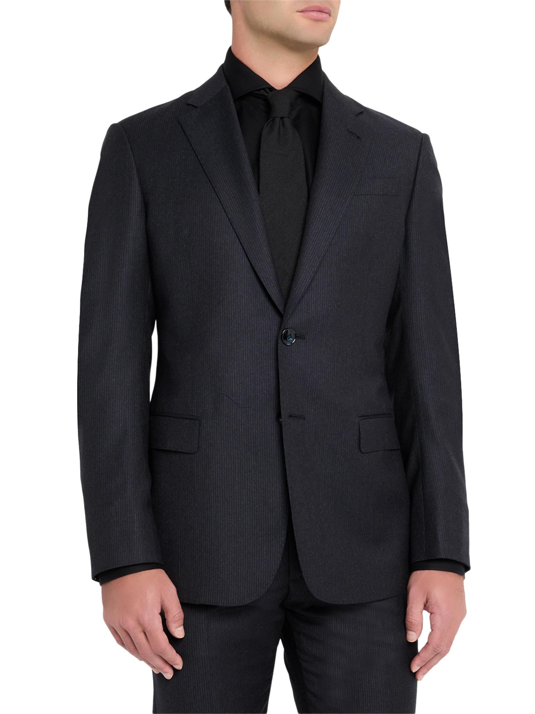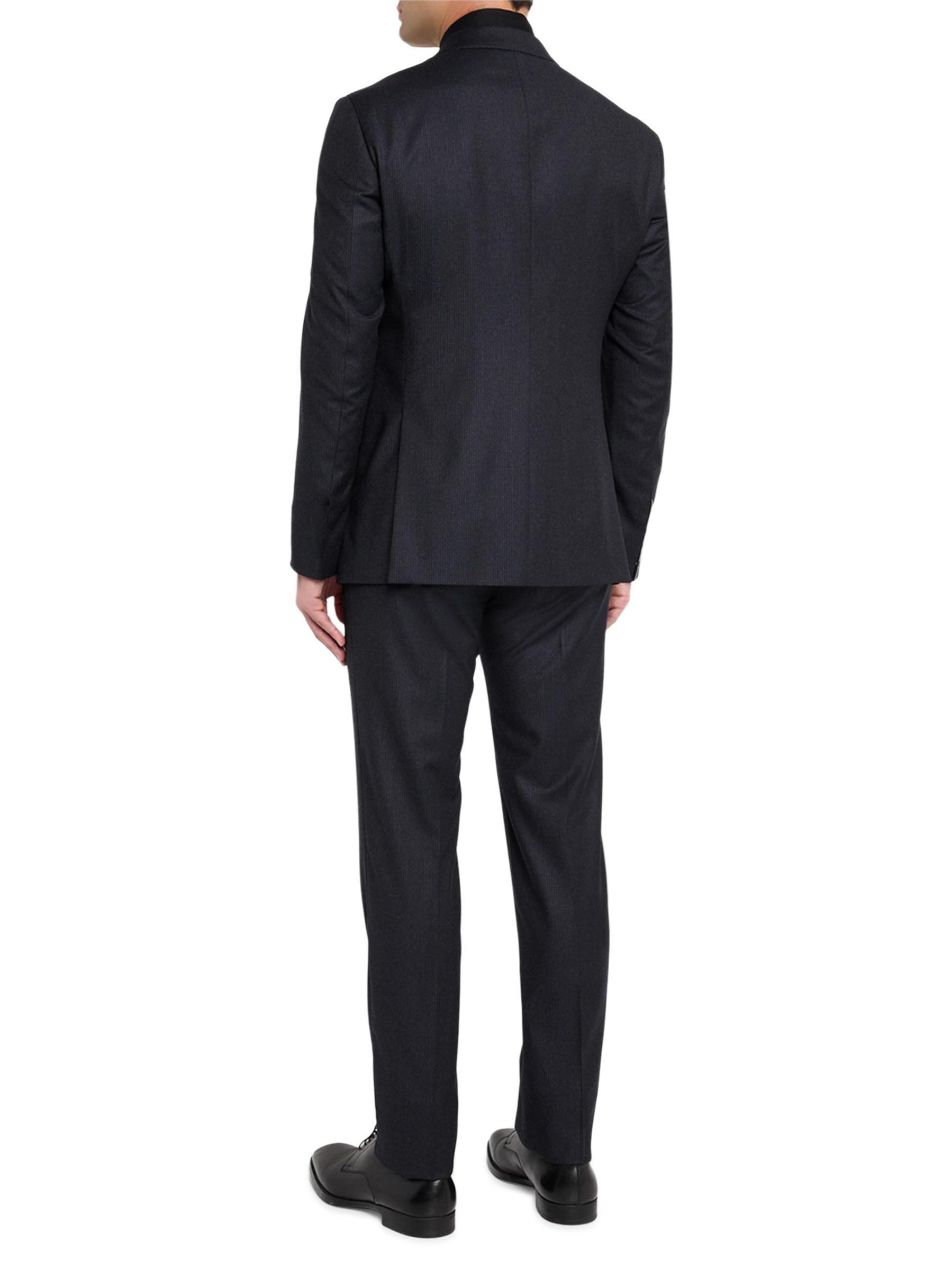 This Giorgio Armani suit is crafted of a lightweight pinstriped virgin wool blend and is cut for a single-breasted, classic fit. The jacket features notch lapels, a two-button closure, and a double-vented back, while the pants are cut in a mid-rise tapered-leg silhouette. Virgin wool/viscose. Partially lined. Dry clean. Made in Italy.