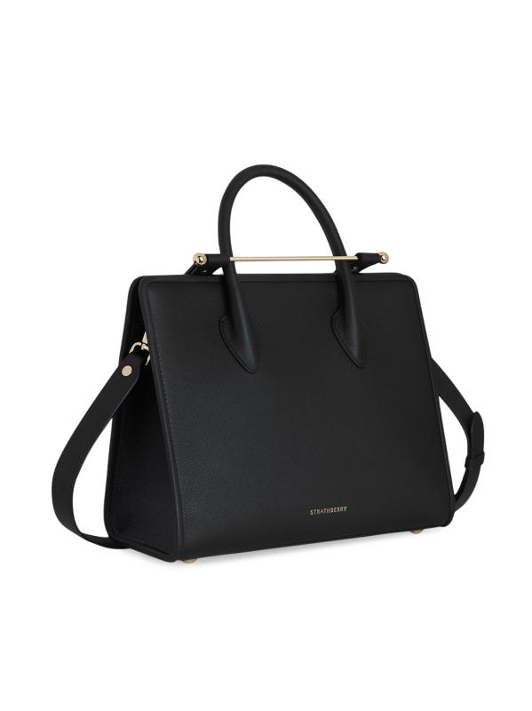 Crafted of a leather blend, this midi tote bag from Strathberry is designed with top handles that loop through a signature metal bar.Two top handles Removable shoulder strap interior: one slip and one zip pocket Protective metal feet Magnetic snap closure Leather/polyester Made in Spain