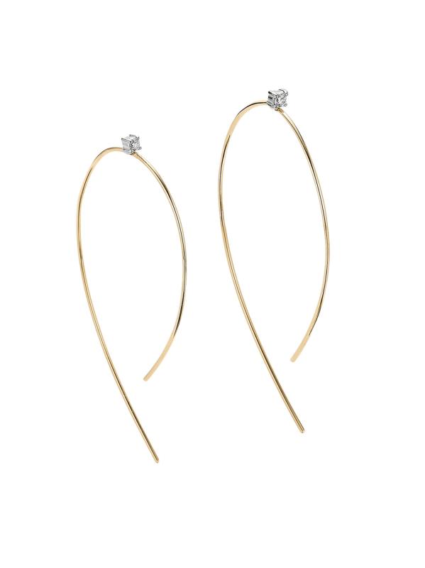 Lana's mini wire hoop earrings are crafted of 14K yellow gold and feature a single prong-set round diamond for added sparkle and shine.Diamonds, 0.036 tcw Diamond color: GH Diamond clarity: SI 14K yellow gold Ear wire Imported