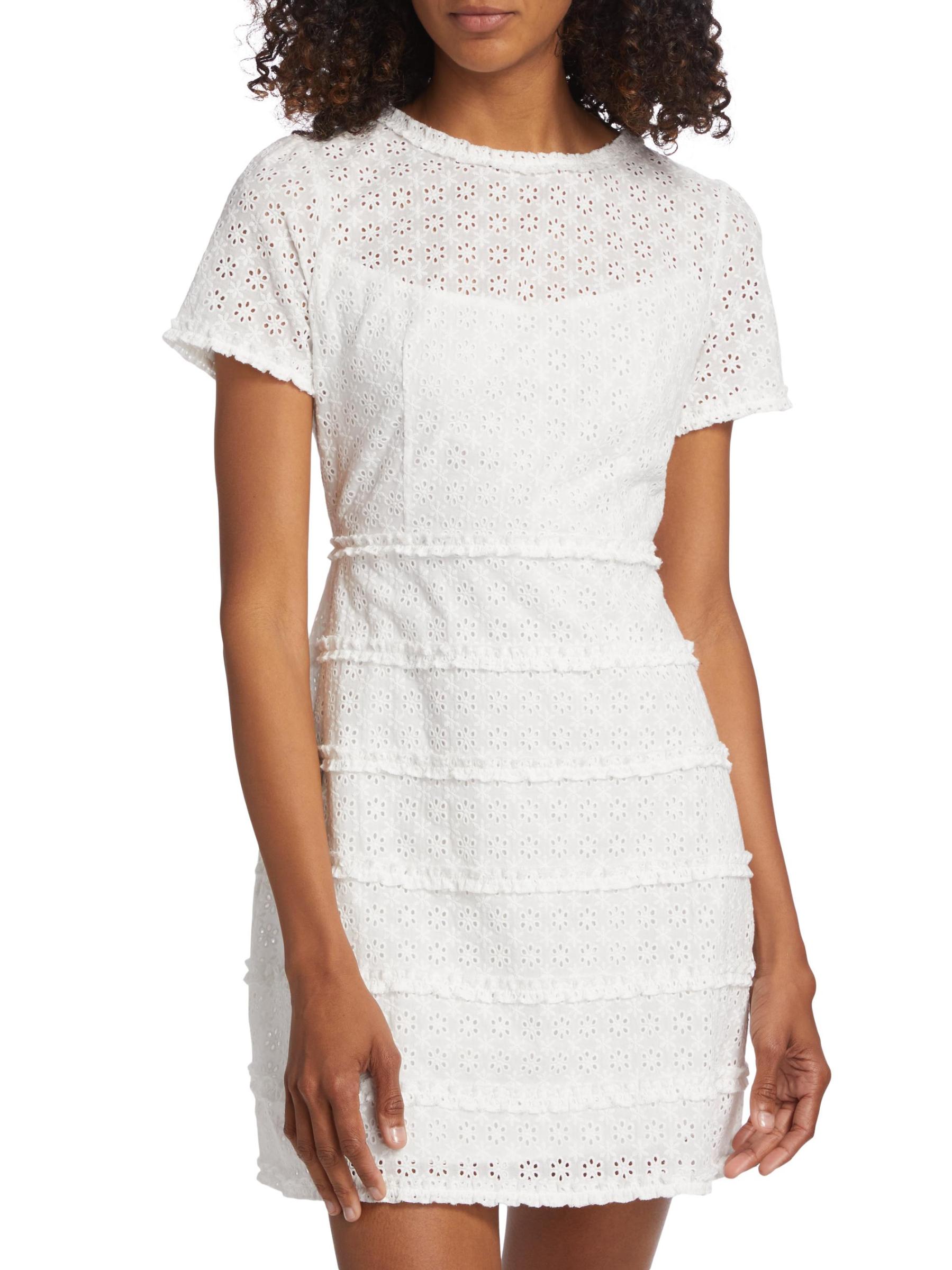 Crafted of eyelet-embroidered cotton, the mini Natalie minidress from HVN is detailed with ruffled trim.Round neck Short sleeves Back zip closure 100% Cotton Lining: 95% polyester/5% spandex Dry clean Imported