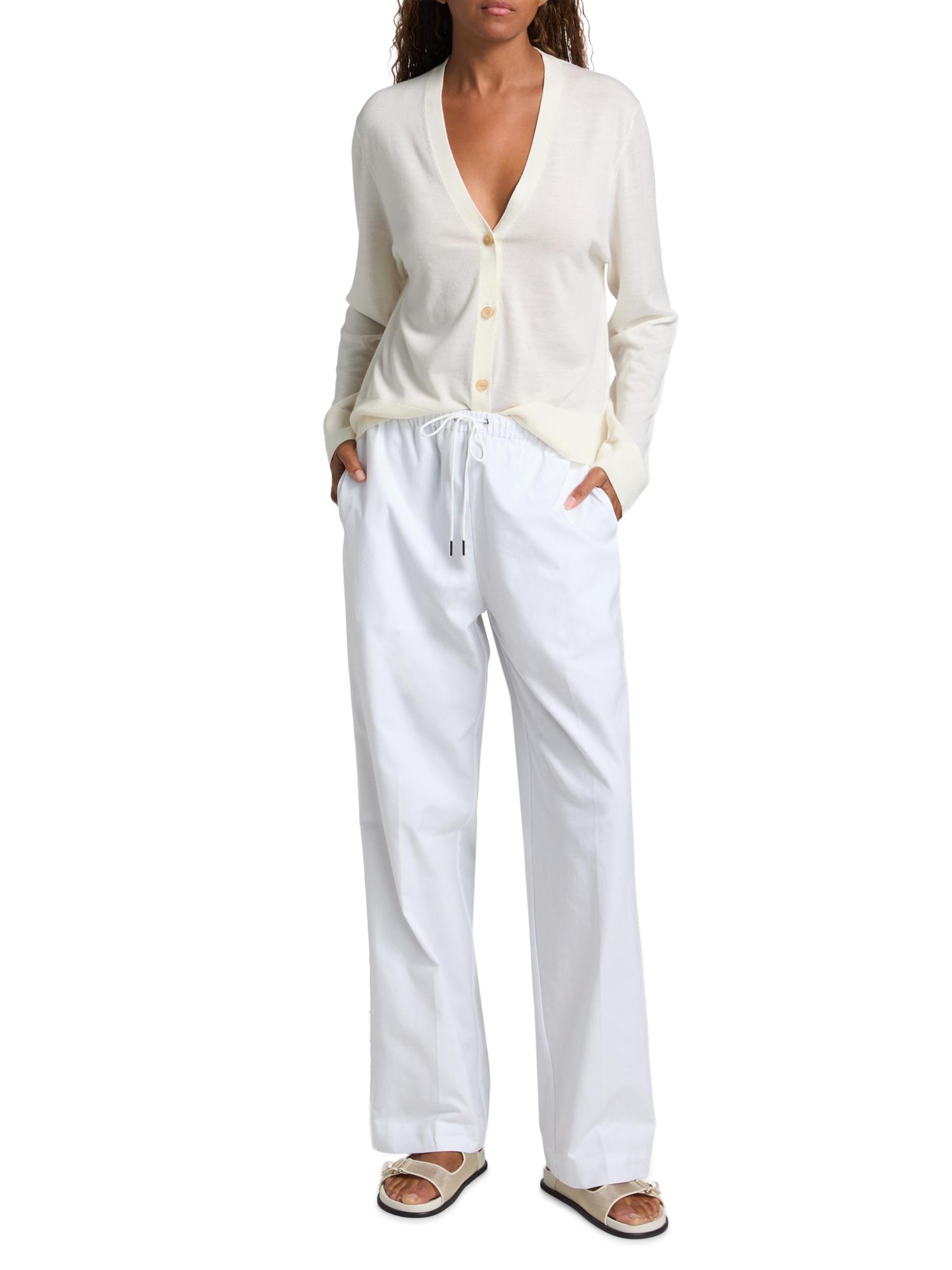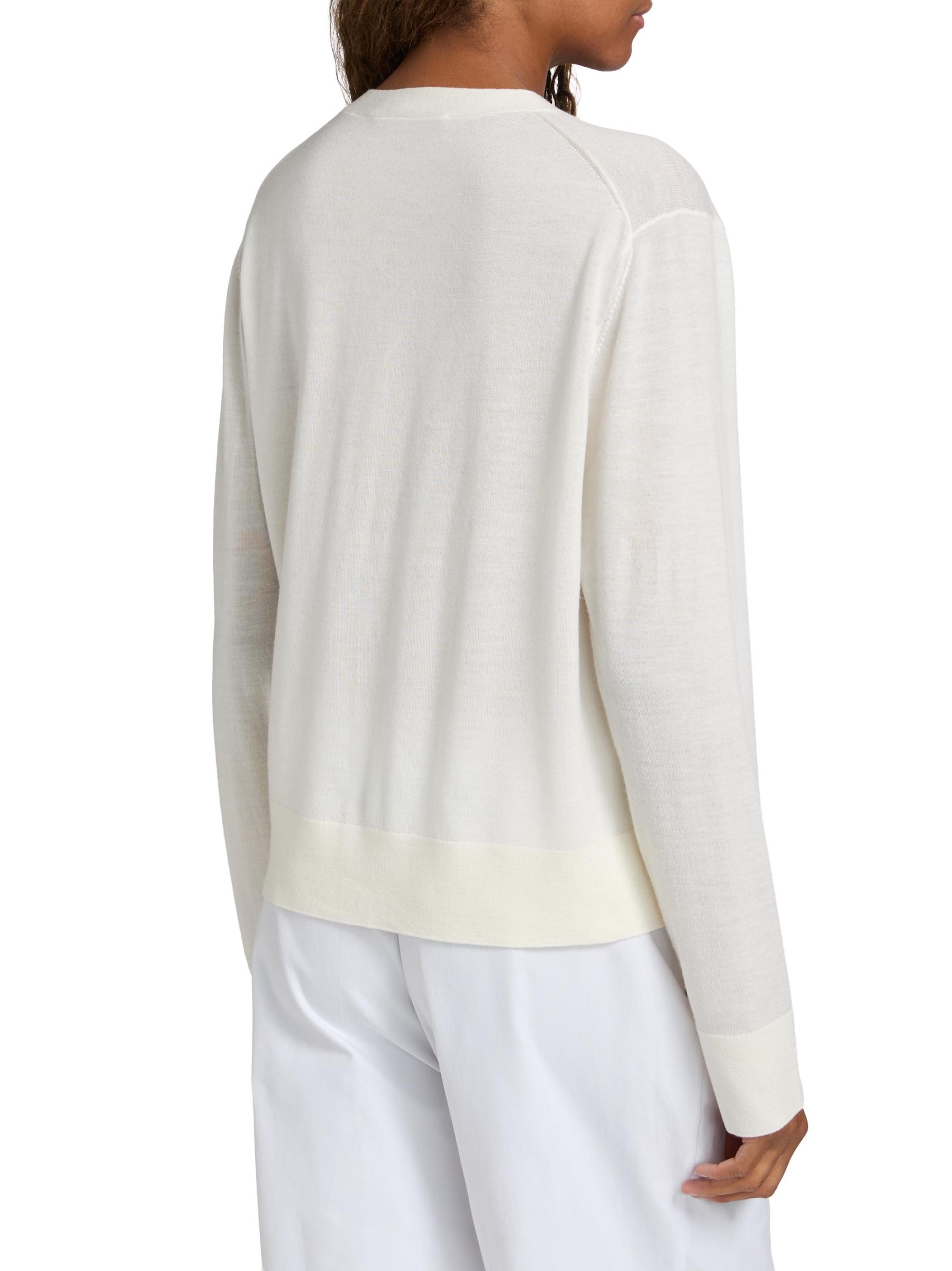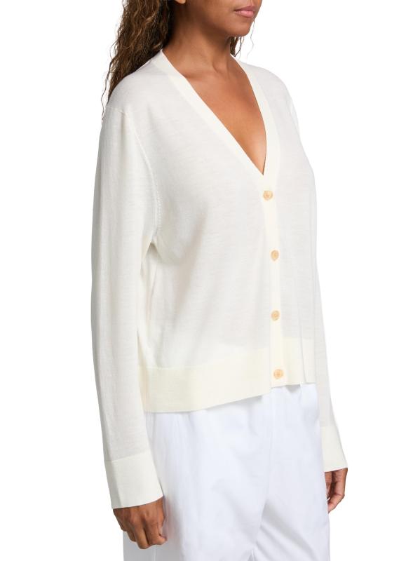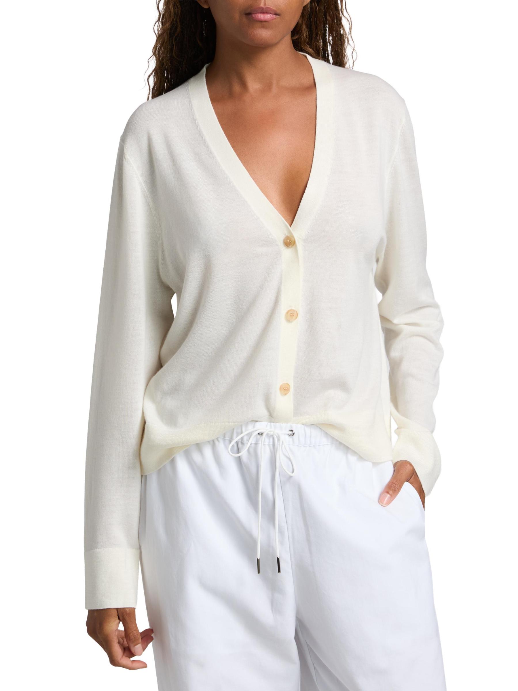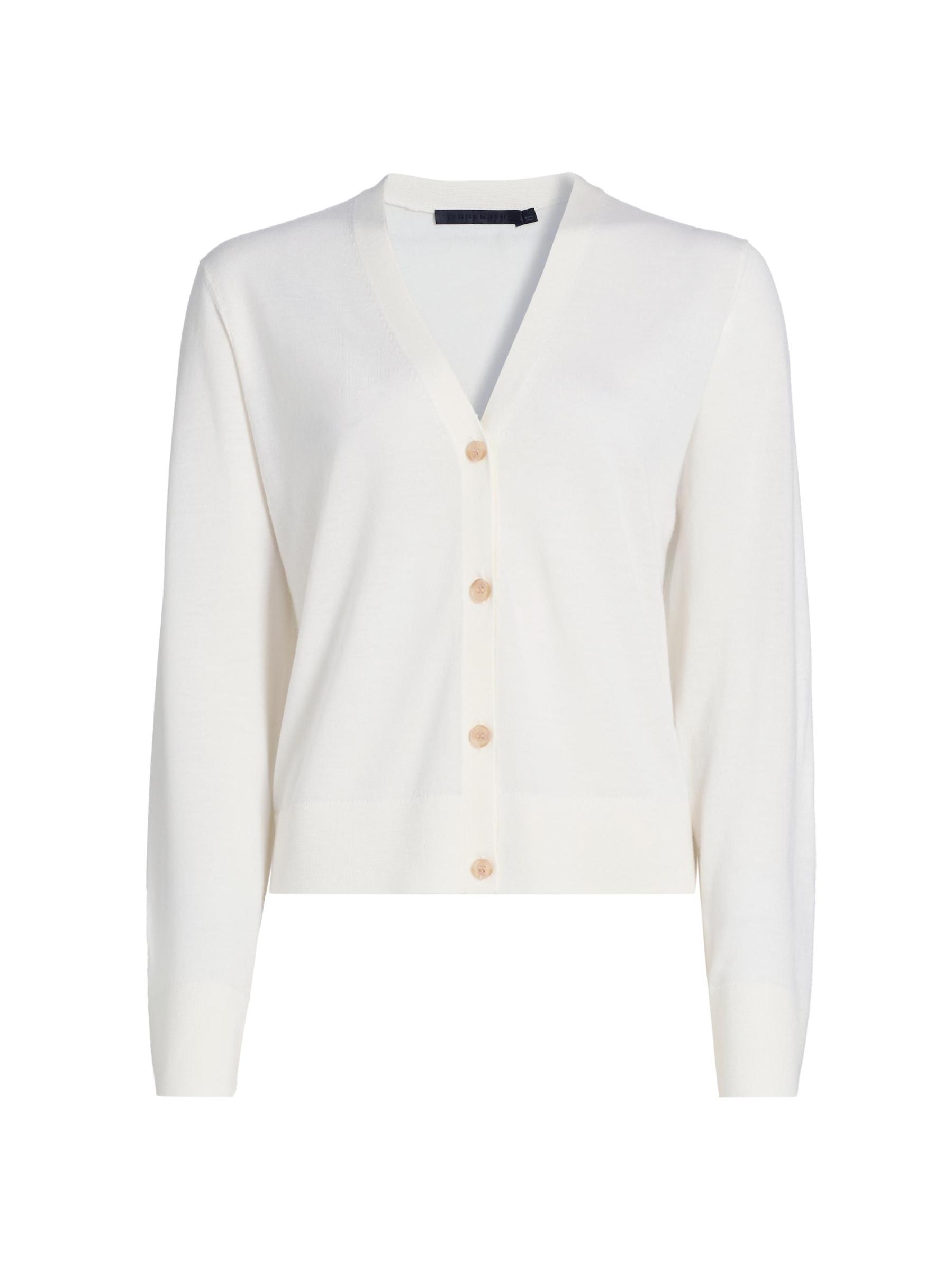 The Mira cardigan from Jenni Kayne is crafted of a lightweight merino wool. Ribbed cuffs and hem finish the look.