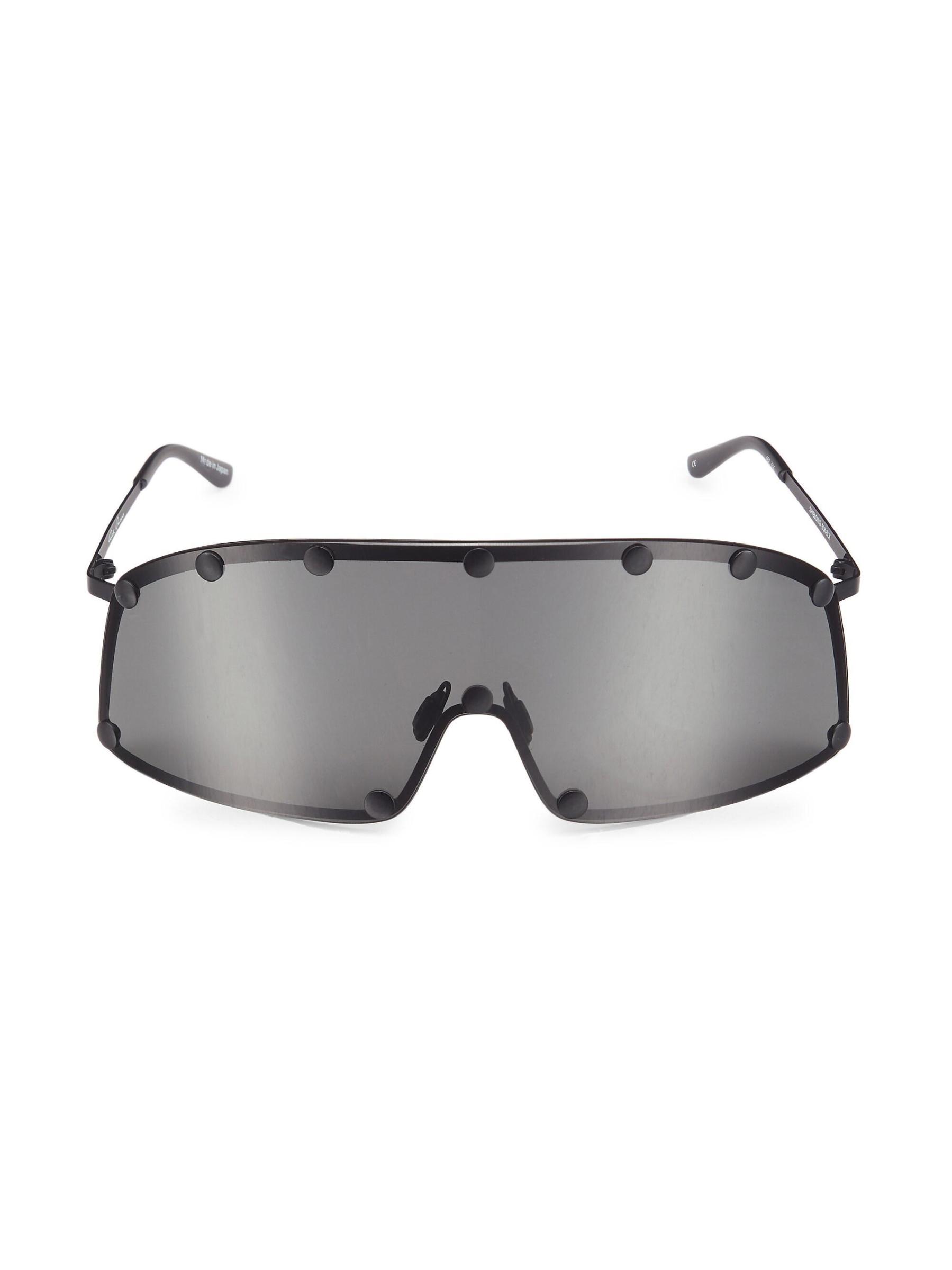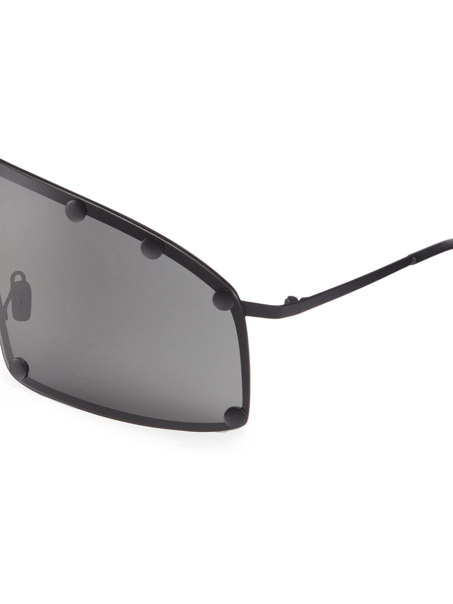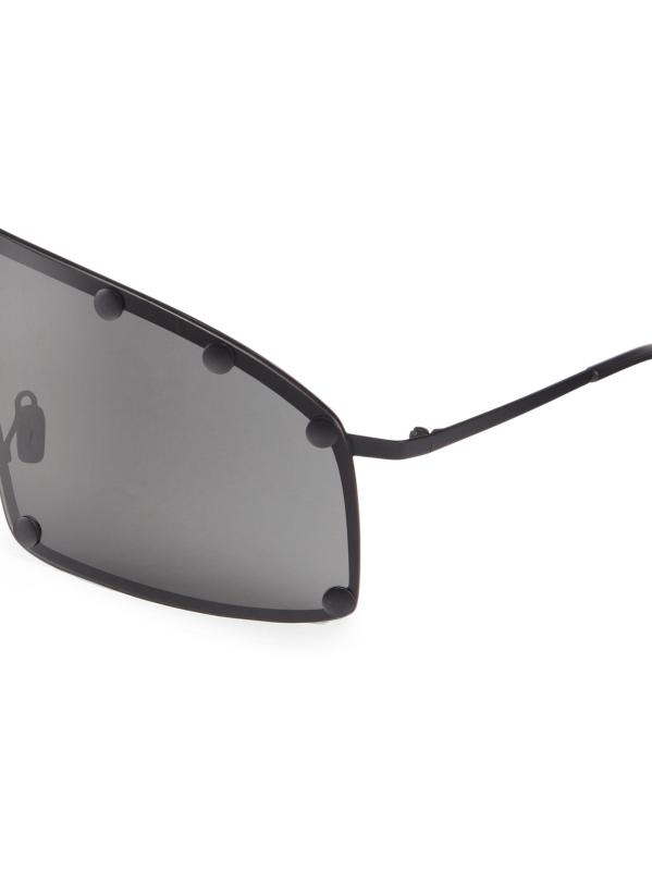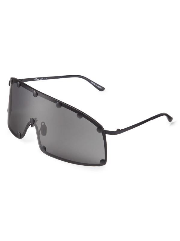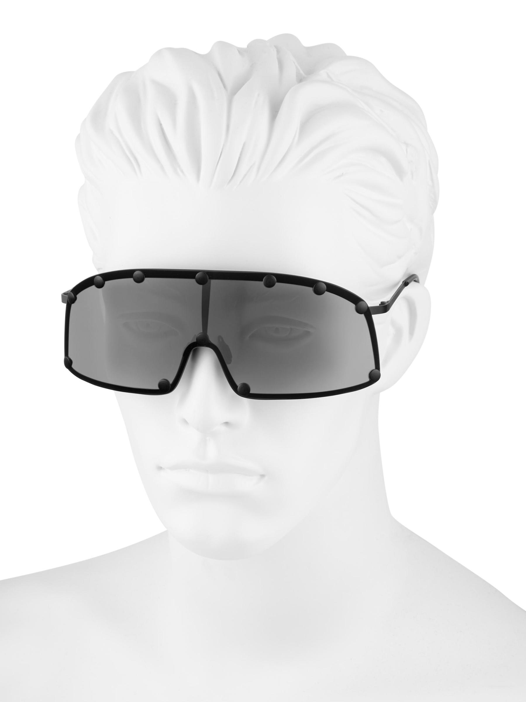 Decorative stud detailing lends a utilitarian feel to Rick Owens’ shield sunglasses, designed with an oversized futuristic look.