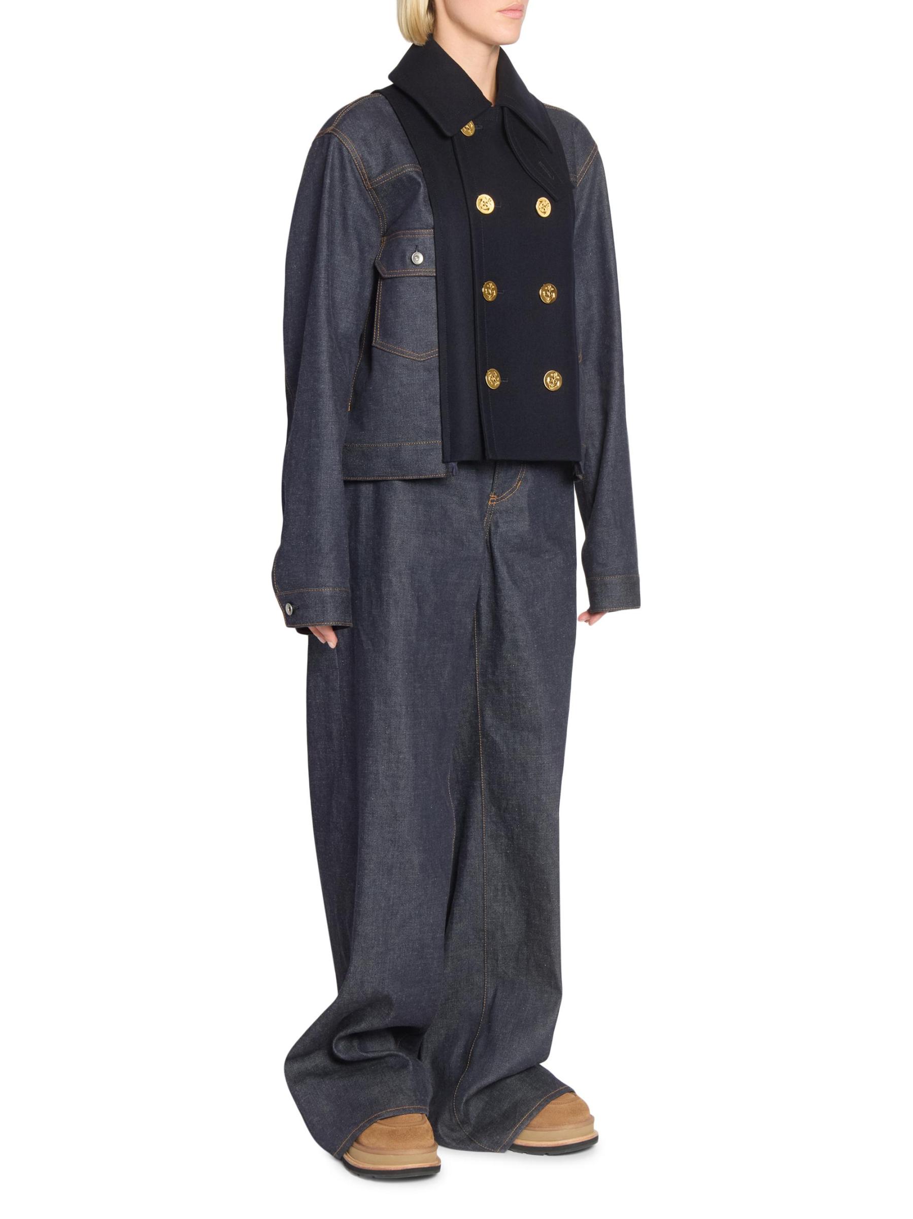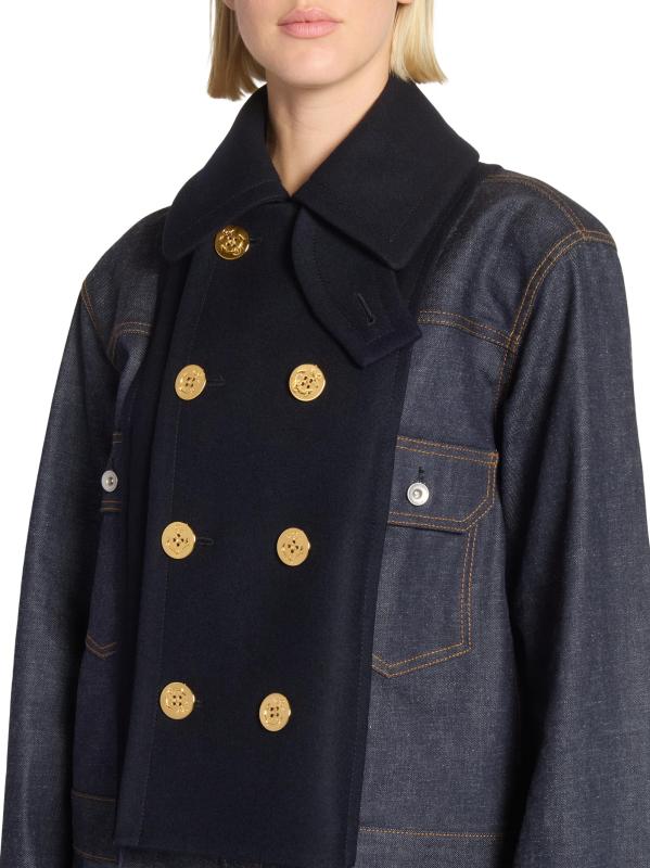 This Sacai denim jacket is designed with a double-breasted button-front closure and contrasting wool panels for a structured, layered look.