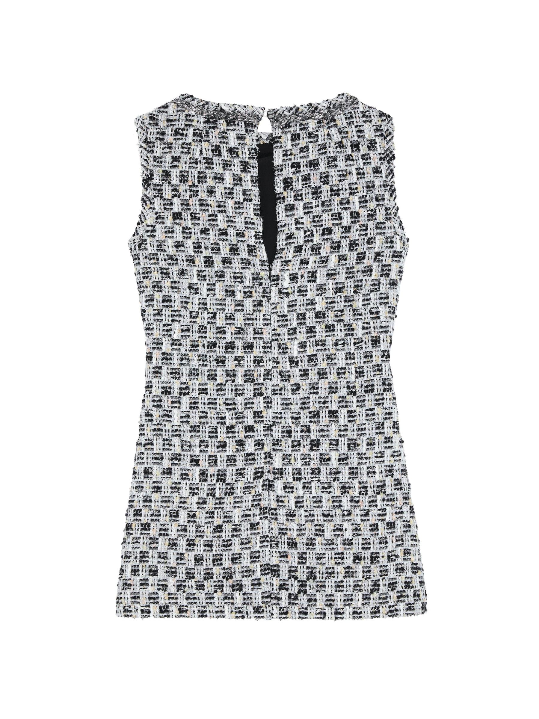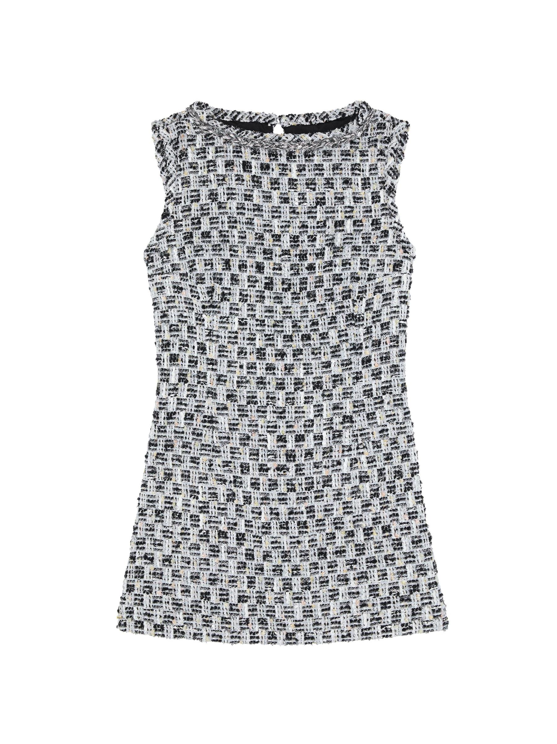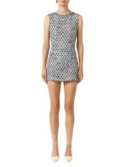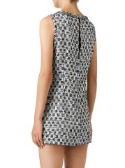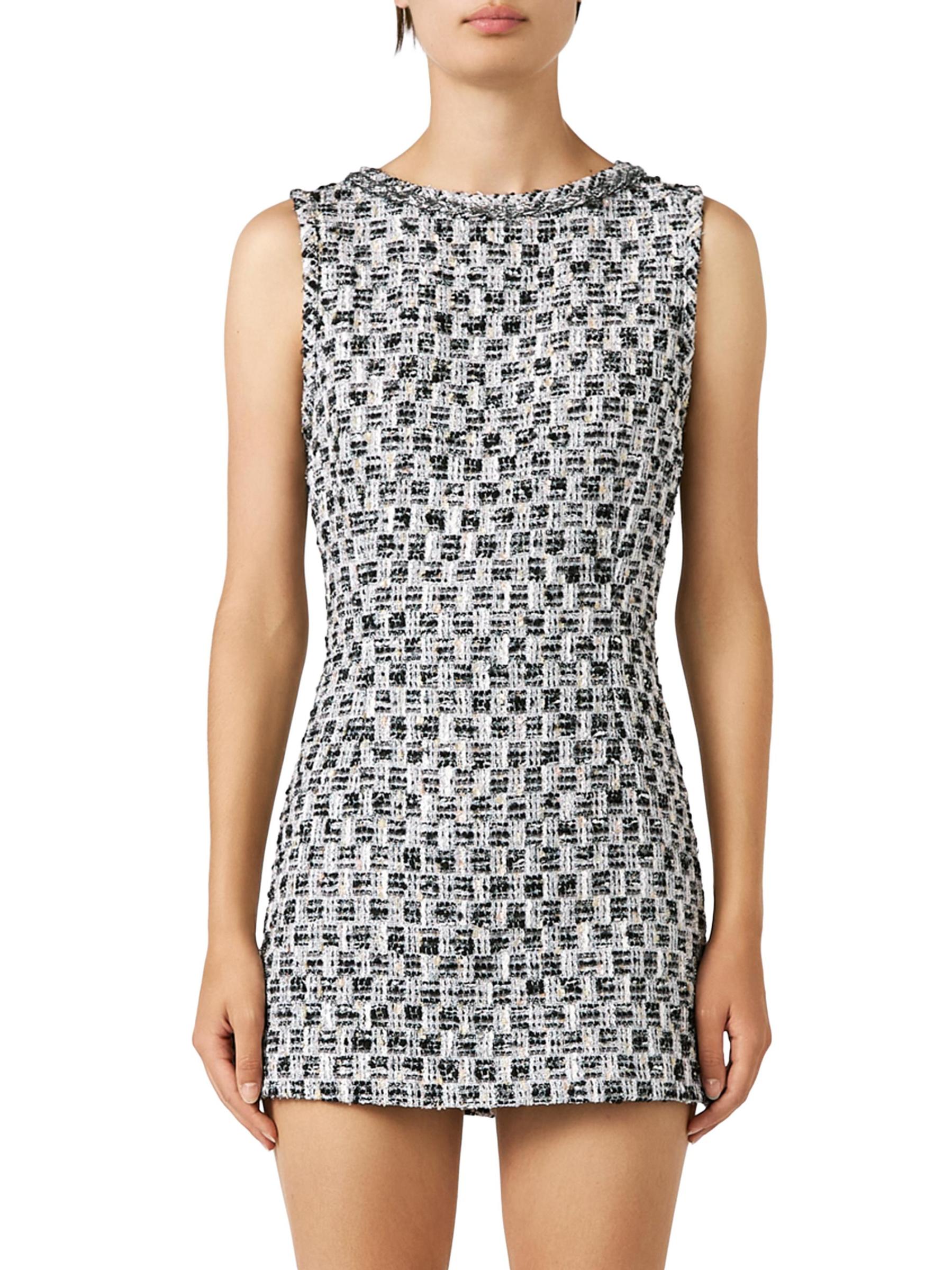 Cut in a shift silhouette, this Moorgate minidress from Liberowe is crafted of tweed with a woven geometric design and braided trim.