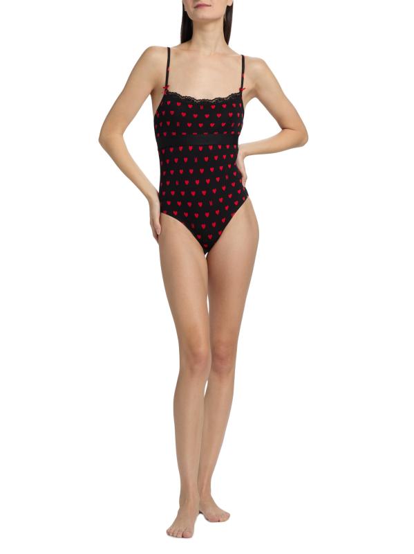 From the Moschino Intimo Donna Collection. Crafted of soft stretch cotton, this bodysuit from Moschino is defined by a repeating M hearts pattern. Lace trim and a tonal elasticized logo band complete the design.