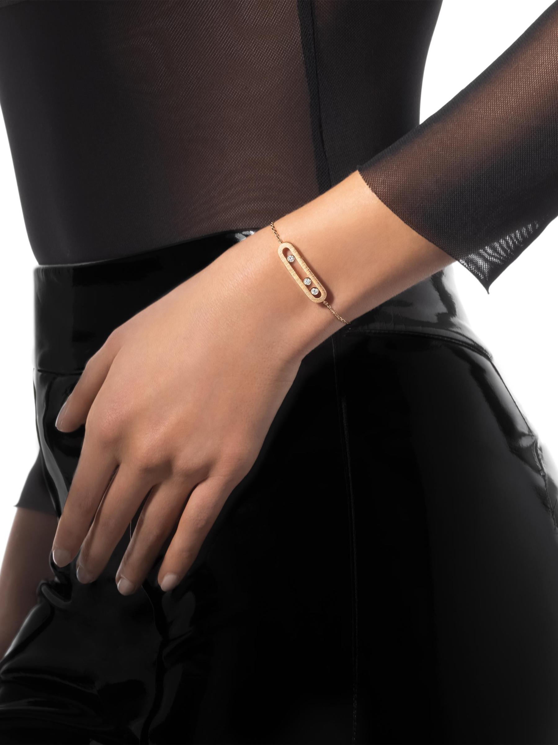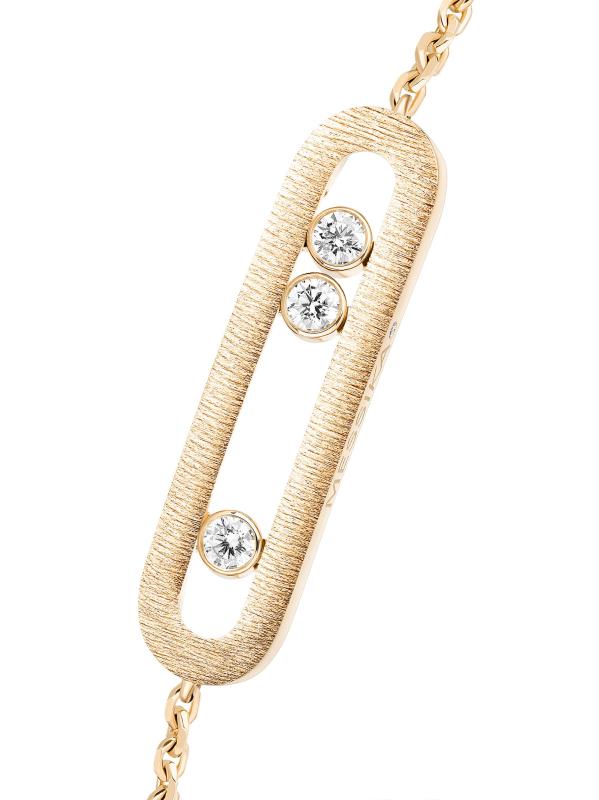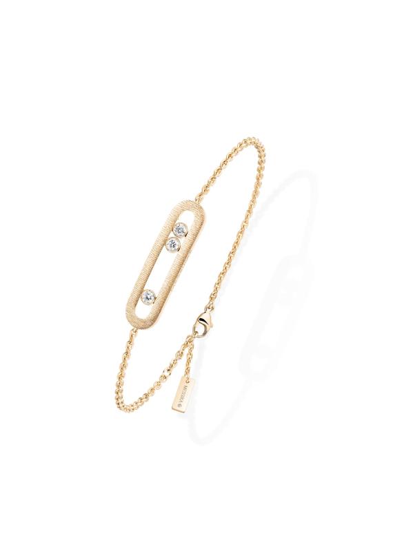 From the Move Noa Collection. Made of 18K yellow gold, the Ciselé bracelet from Messika features three freely moving round diamonds housed in an oval cage. This striking charm is completed with a hand-engraved finish for a soft, velvety effect.Diamonds, 0.20 tcw Diamond color grade: G Diamond clarity grade: VS 18K yellow gold Lobster clasp Imported