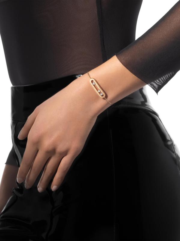 From the Move Noa Collection. Made of 18K yellow gold, the Ciselé bracelet from Messika features three freely moving round diamonds housed in an oval cage. This striking charm is completed with a hand-engraved finish for a soft, velvety effect.