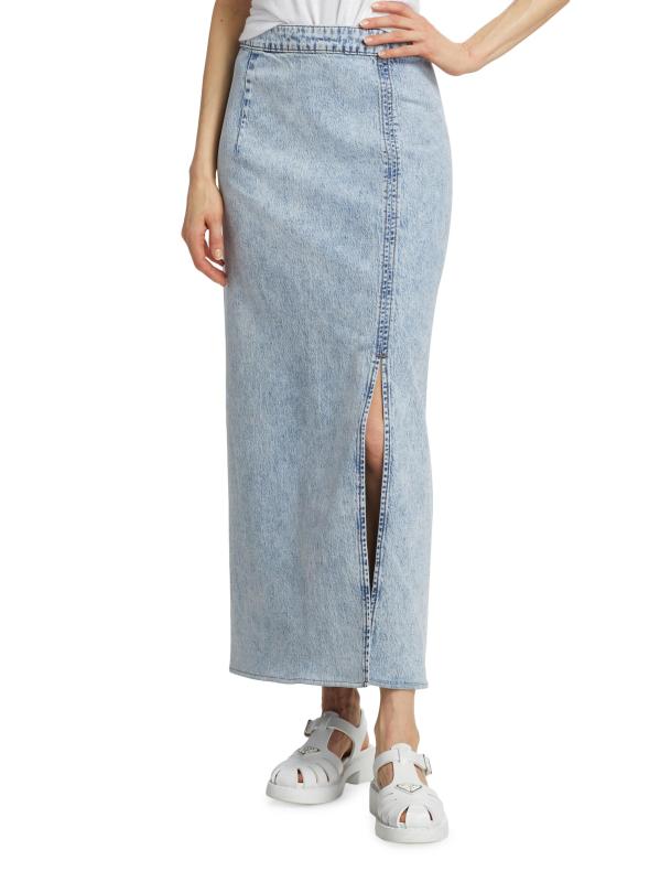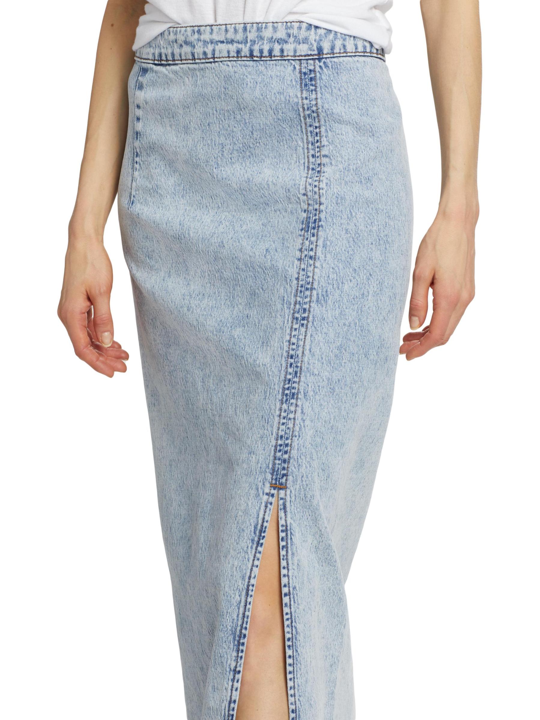 Crafted of acid-washed denim, Triarchy's Ms. Madison skirt features a front slit and a pencil silhouette.