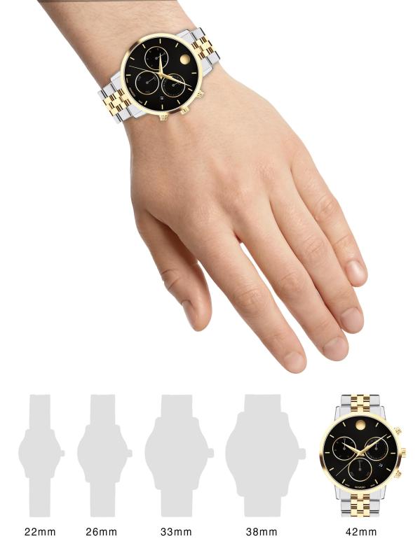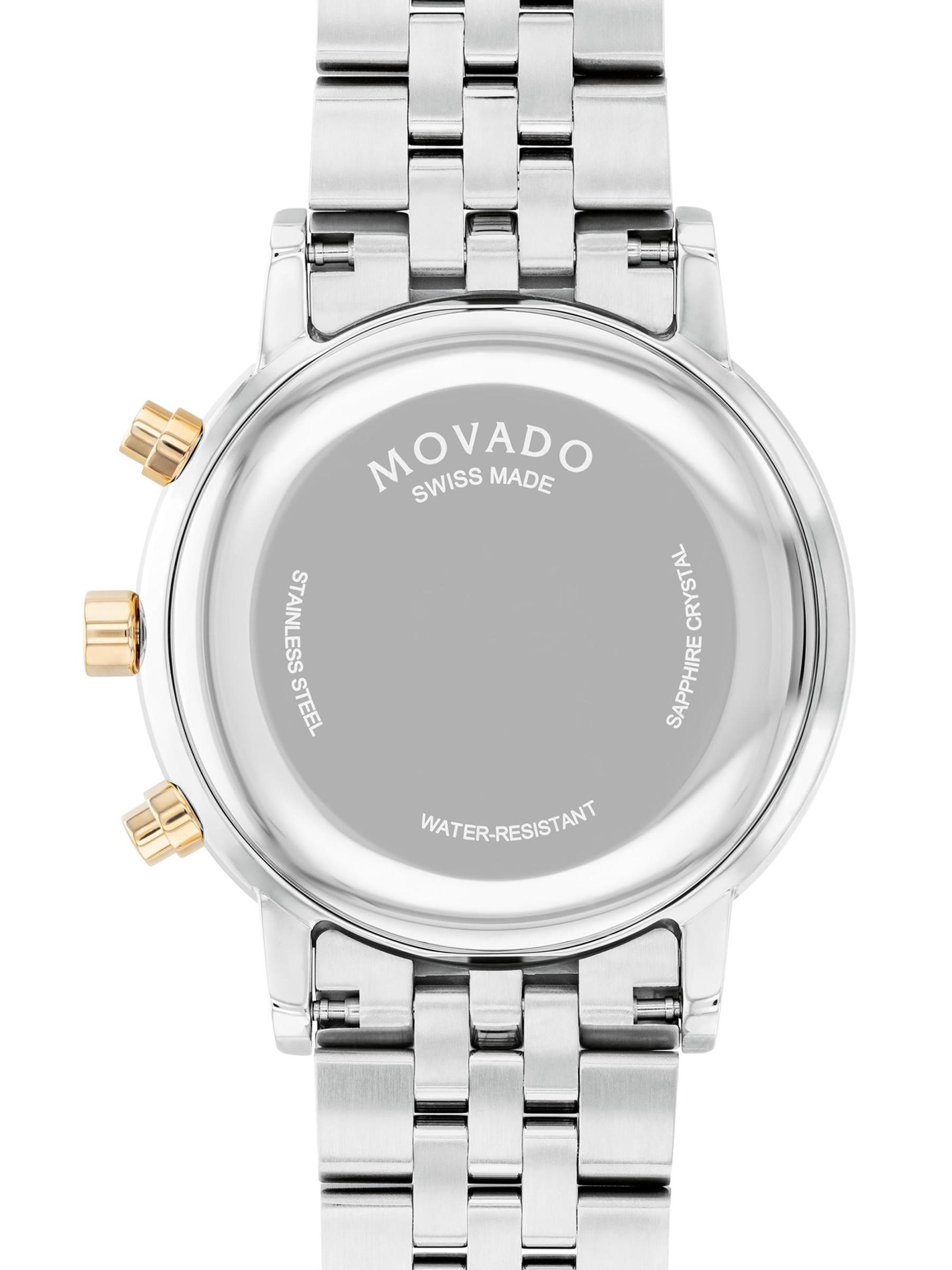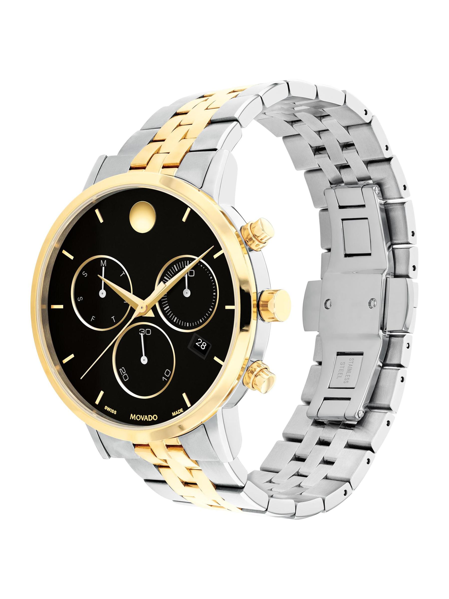 From the Museum Classic Collection. Crafted of stainless steel with yellow PVD detailing, this Movado chronograph watch offers an elegant design. The handsome timepiece features a round case, three subdials, and a date display at 4 o'clock.Swiss quartz movement Fixed bezel Sapphire crystal Screw-down crown Black dial Three chronograph subdials Date display at 4 o'clock Second hand Yellow PVD-plated stainless steel case and bracelet Deployant clasp Two-year limited warranty Made in Switzerland