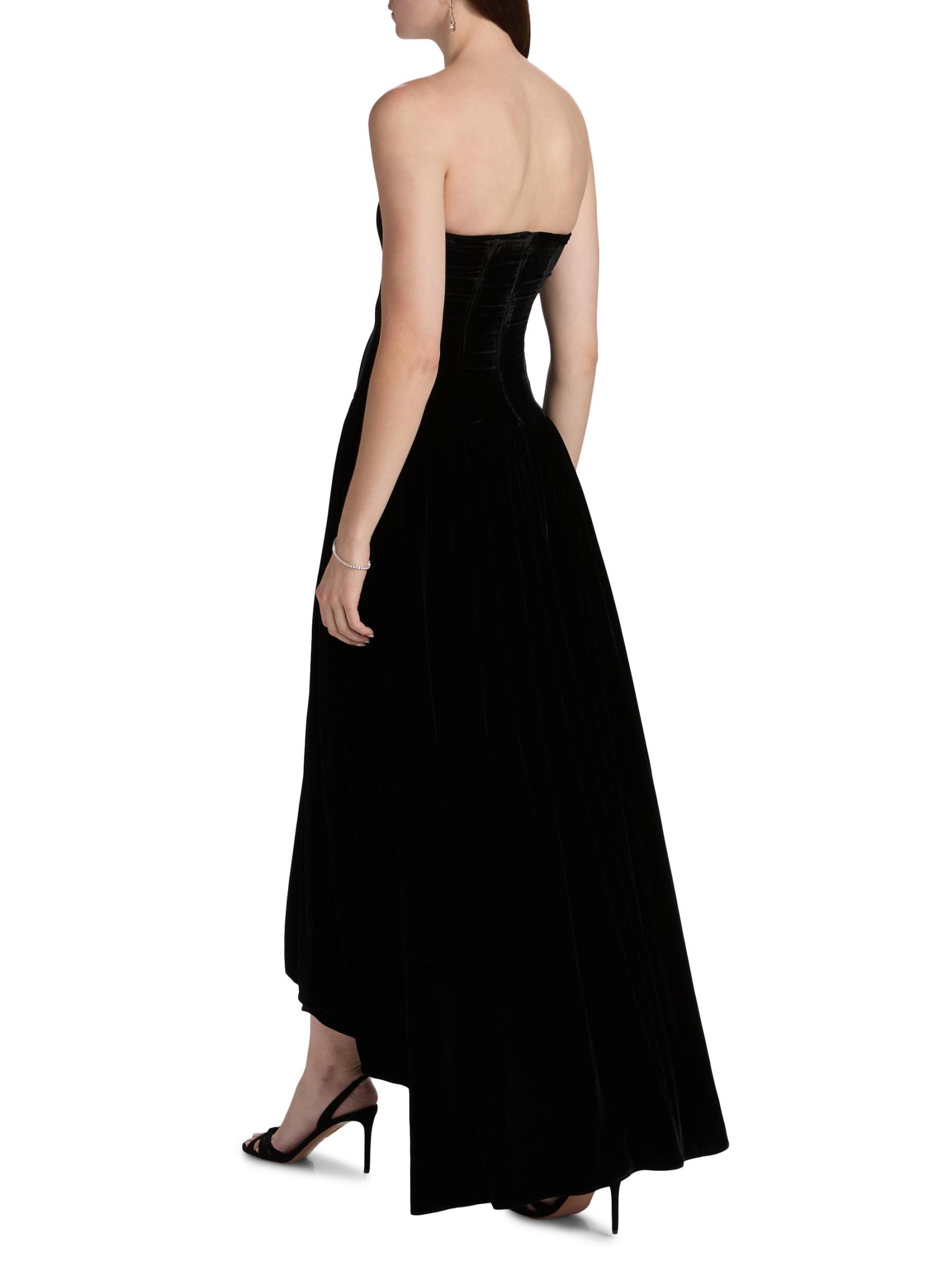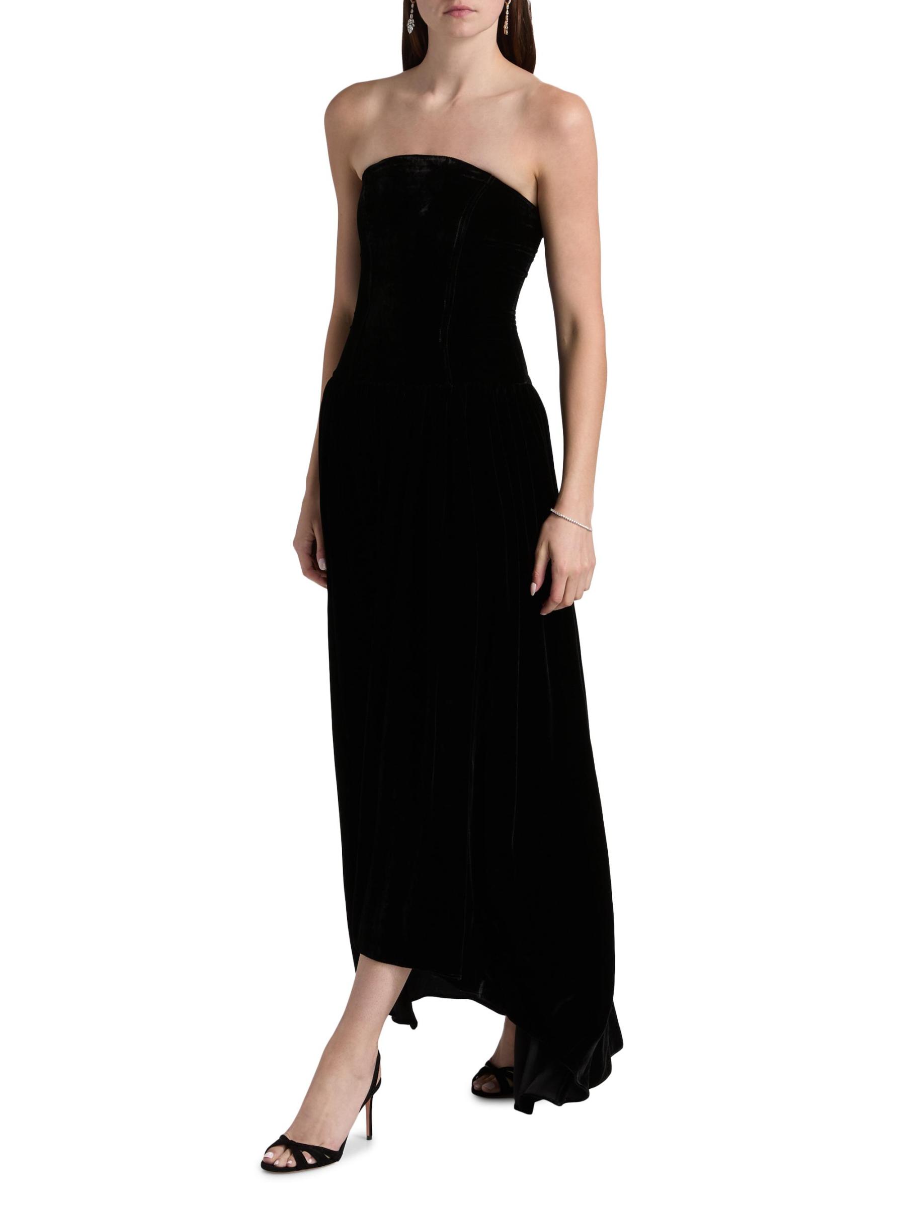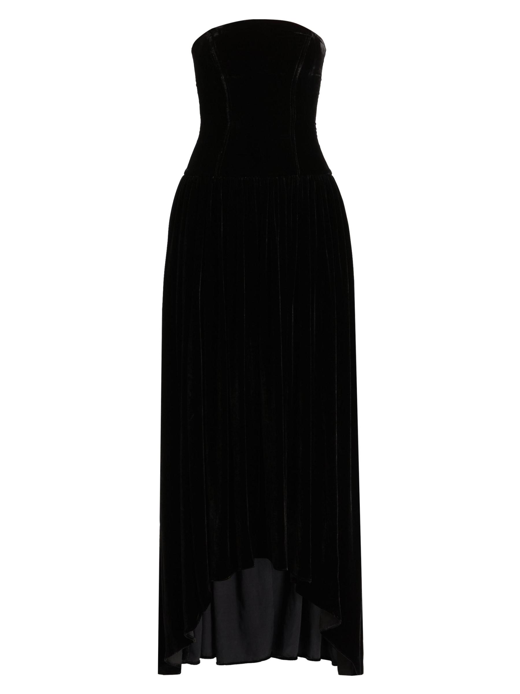 Azeeza's Nayara velvet midi-dress elevates the design with a strapless silhouette and flowing high-low hem.Bandeau neck Strapless High-low hem Concealed back zip closure 96% polyester/4% Lycra® spandex Dry clean Imported