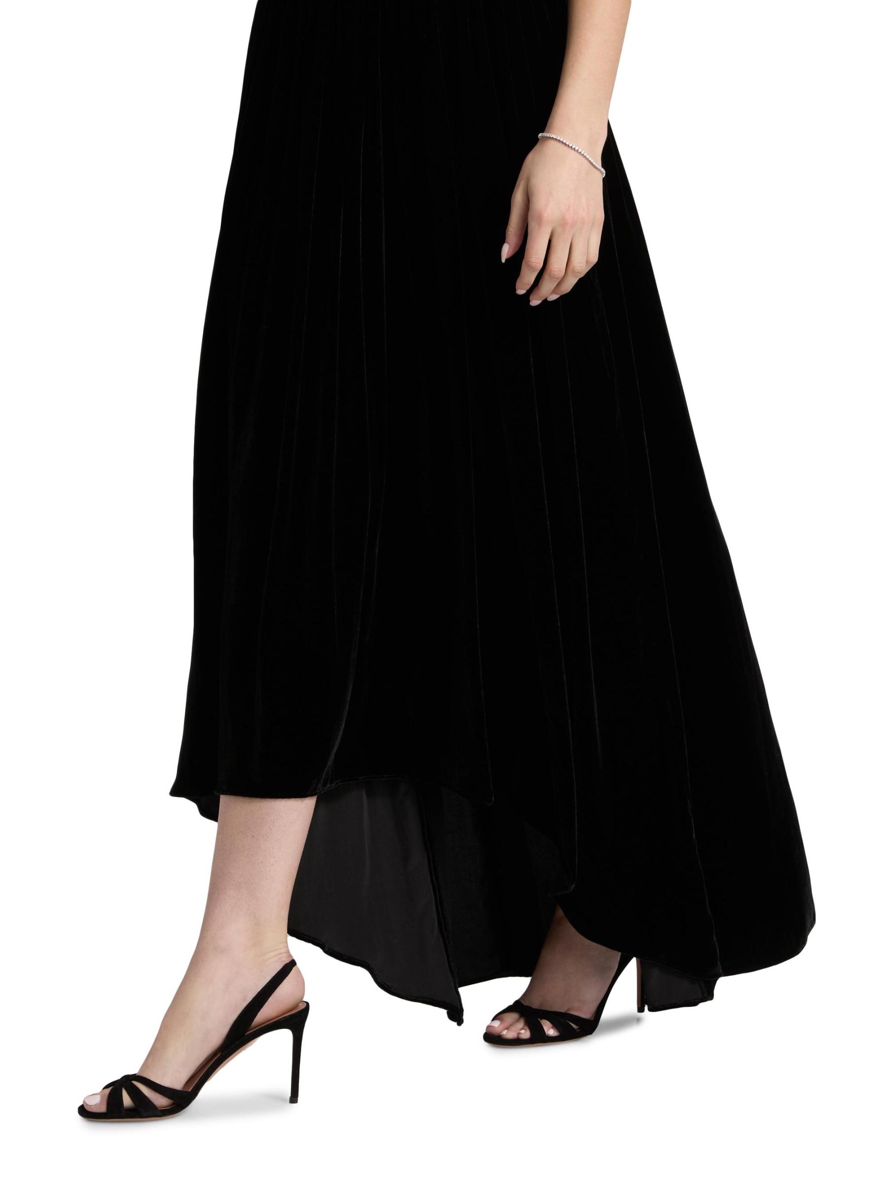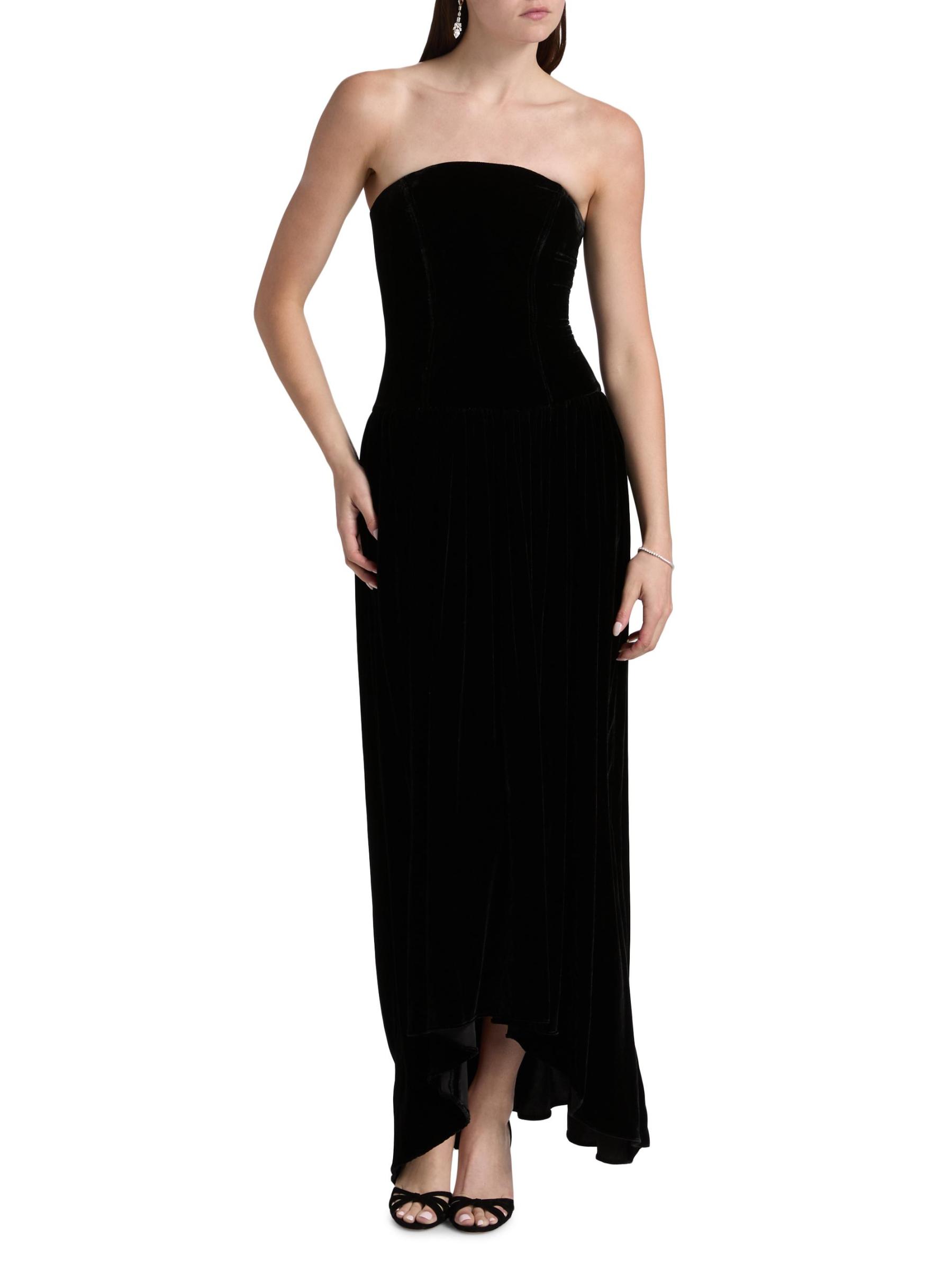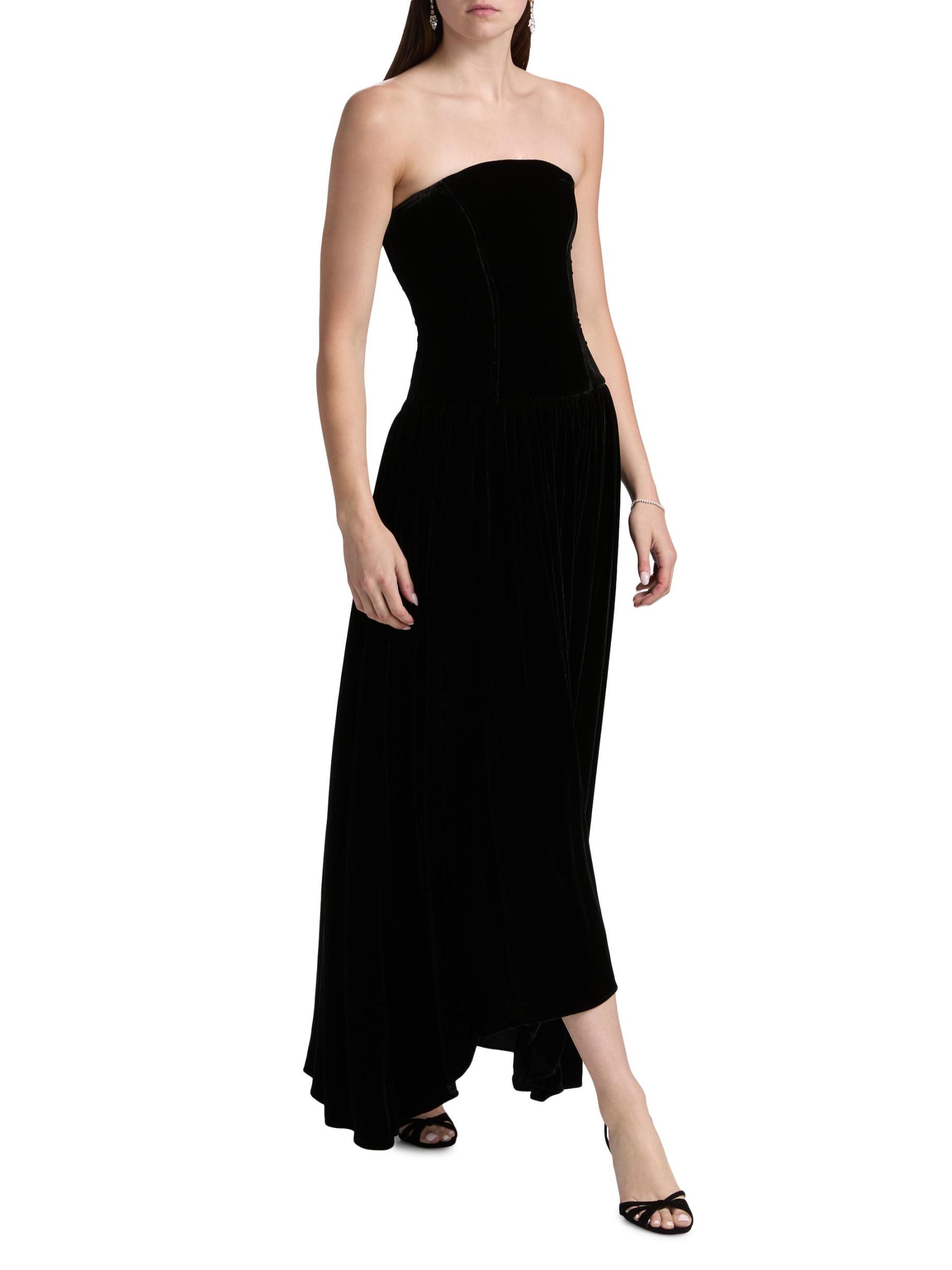 Azeeza's Nayara velvet midi-dress elevates the design with a strapless silhouette and flowing high-low hem.Bandeau neck Strapless High-low hem Concealed back zip closure 96% polyester/4% Lycra® spandex Dry clean Imported