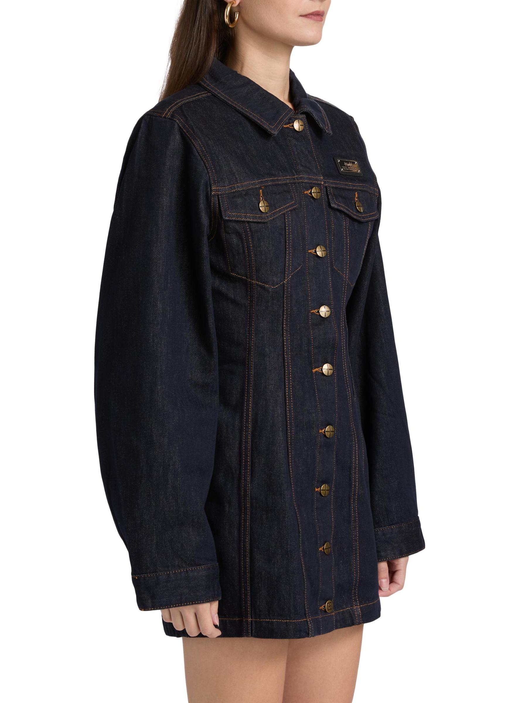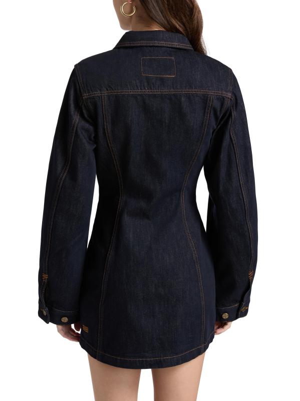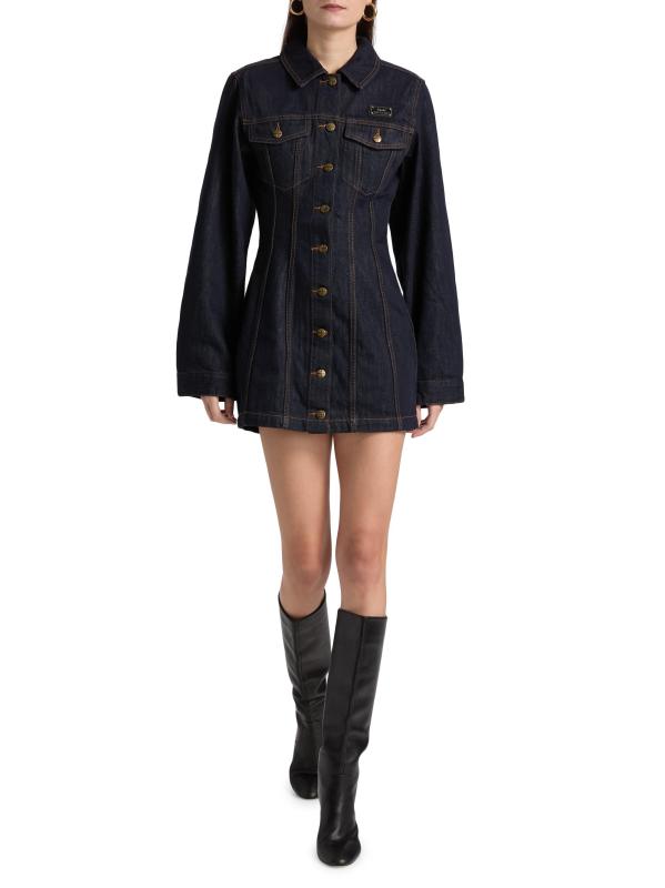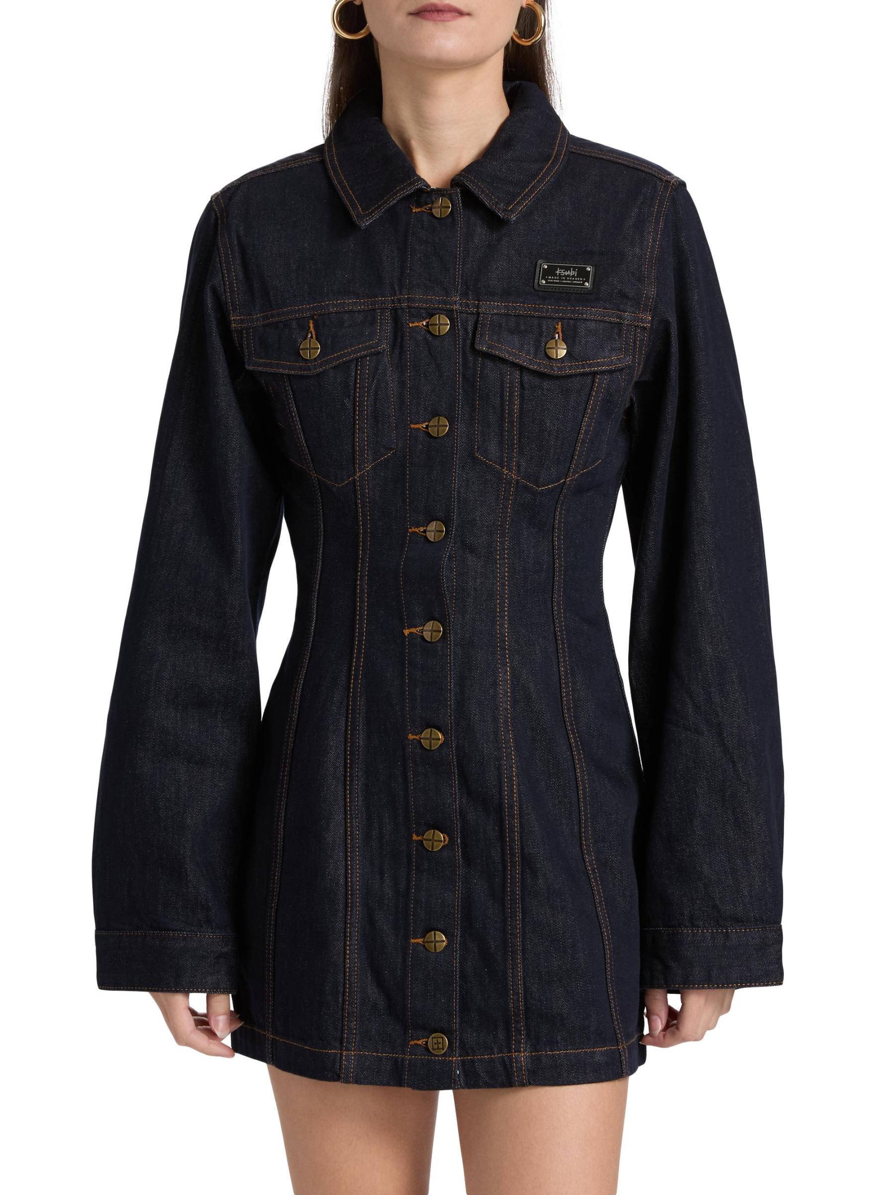 From the Neo-Nostalgia Collection. An update to Ksubi's best-selling 'Cinch jacket', this minidress features curved trucker panel lines around the waist, creating an hourglass silhouette. Crafted of premium cotton raw rinse denim with tobacco topstitched detailing, this style is finished with branded anti-brass hardware and ksubi logo metal plate.Spread collar Long sleeves Chest button-through flap patch pockets Button front closure 100% Cotton Hand wash Imported