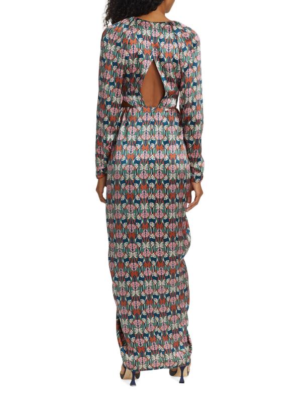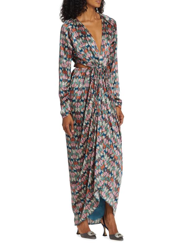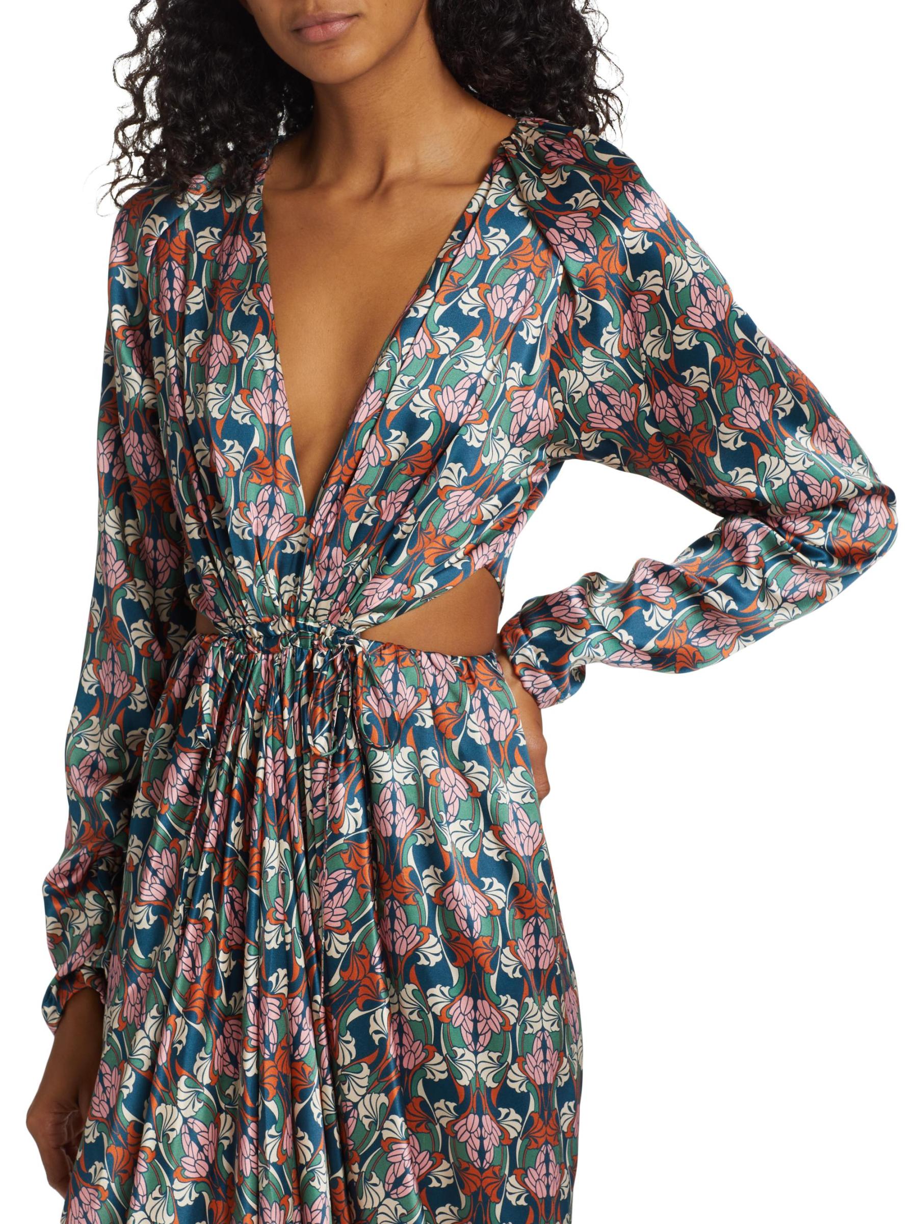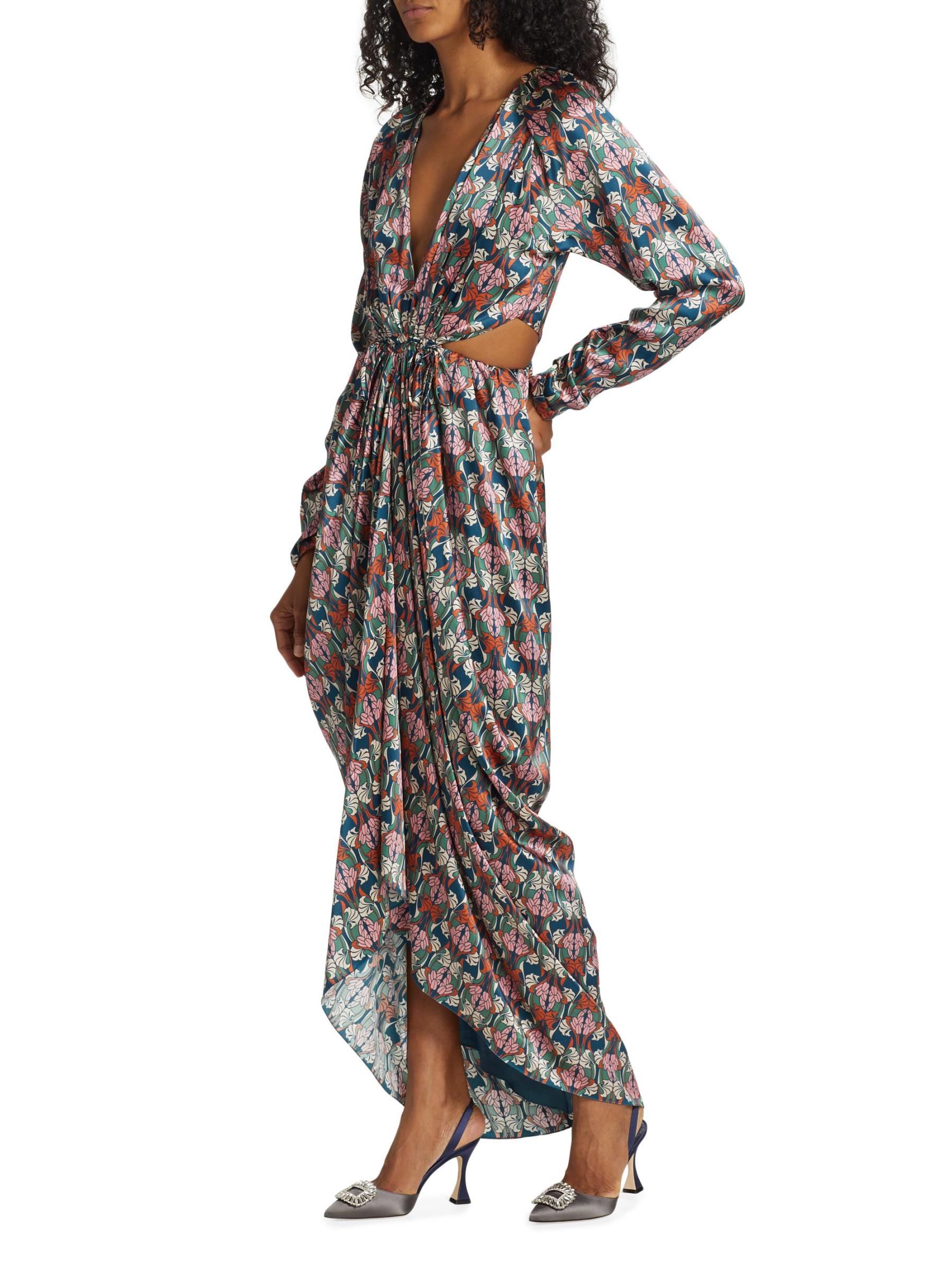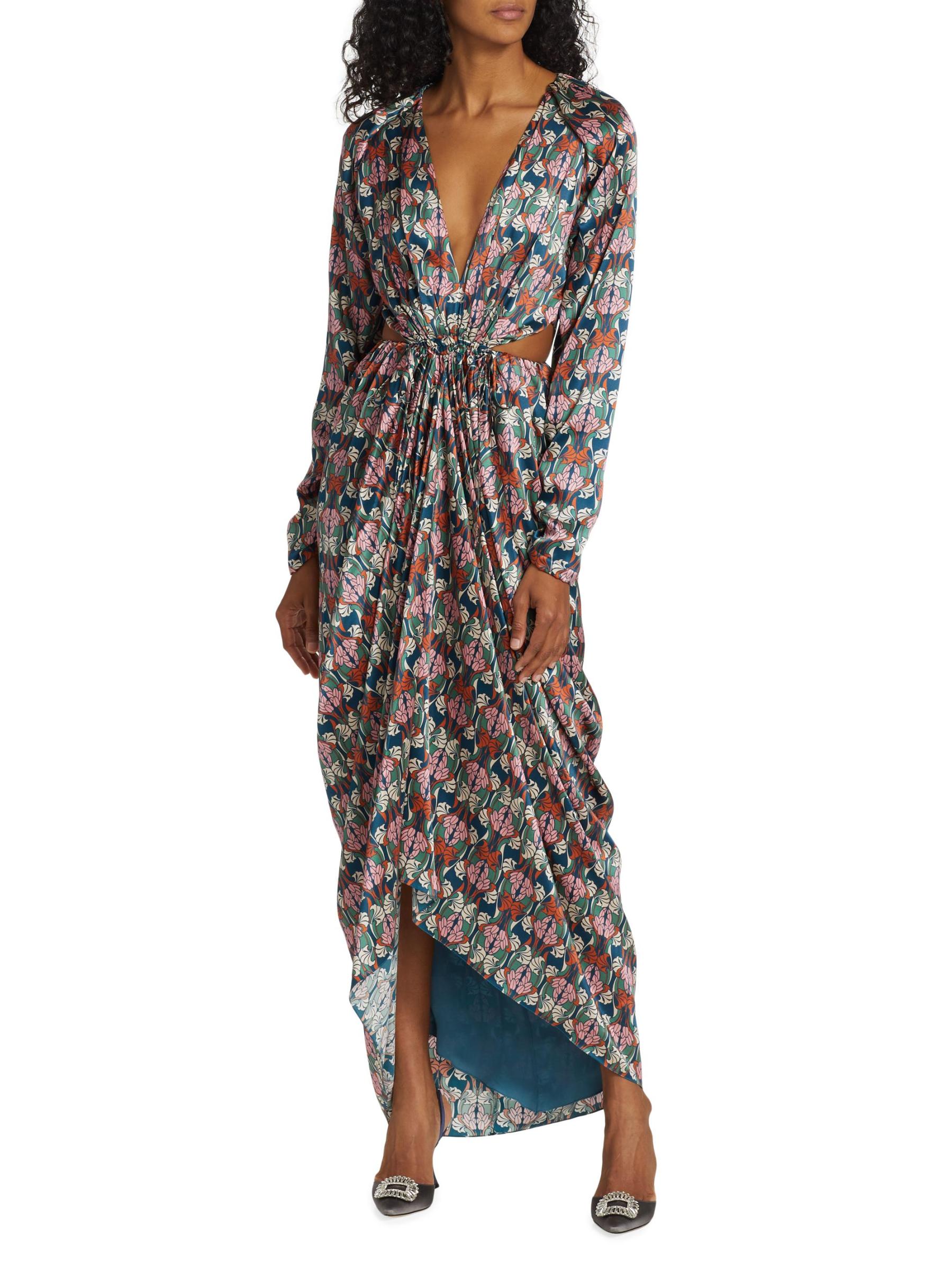 From the Winter Of Soul Collection. Featuring an asymmetrical hem, Beatriz Camacho's Nina dress flaunts a cut-out waist complemented by a plunging V-neck.V-neck Long sleeves Back zipper Back cut-out CHARMEUSE Dry clean Imported