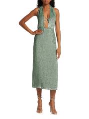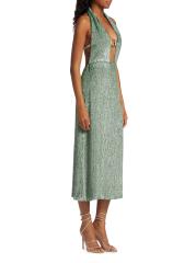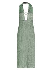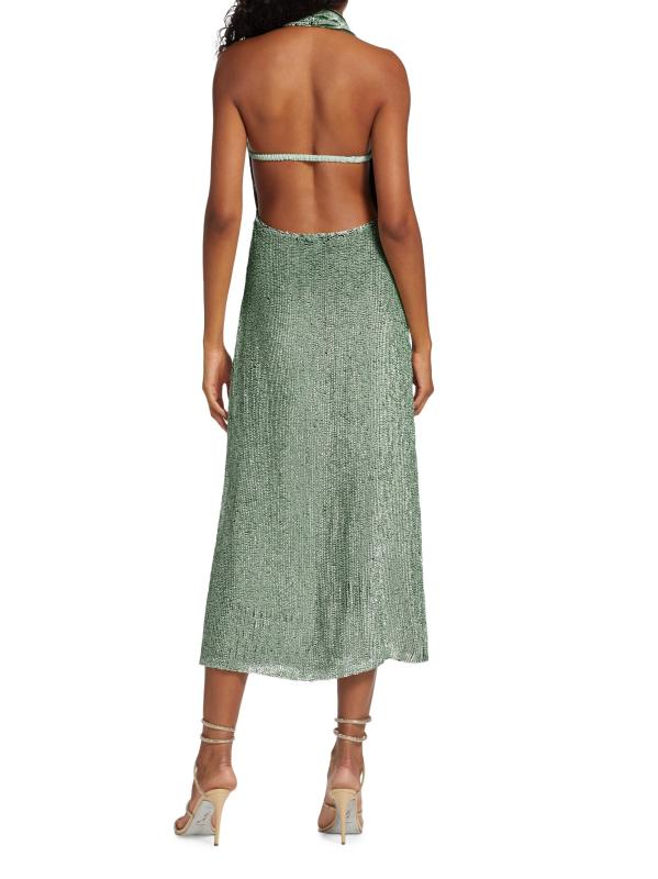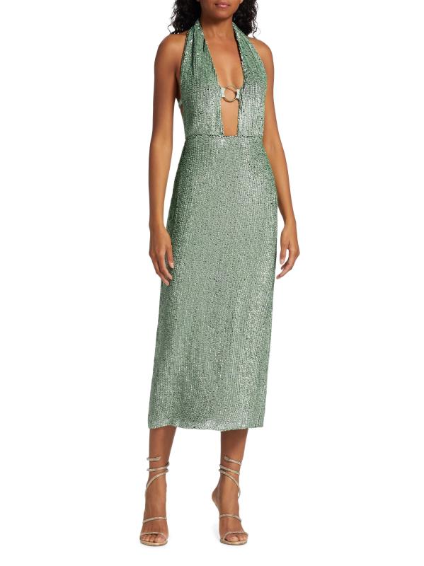 This Zeynep Arçay midi-dress features a figure-skimming silhouette crafted of sequined silk. A plunging halterneck with a goldtone O-ring detail defines this open-back style.