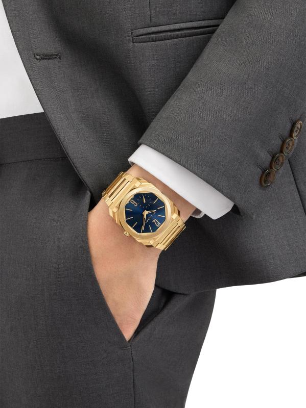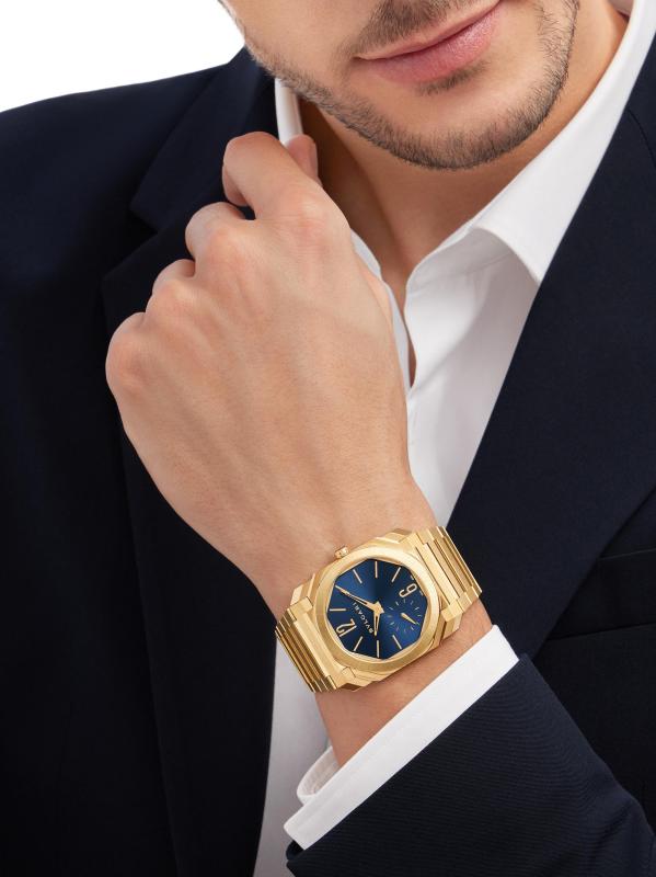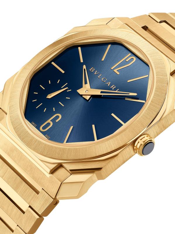From the Octo Collection. Crafted of 18K yellow gold, BVLGARI's Octo Finissimo watch flaunts an ultra-thin octagonal case, blue sunray dial, and seconds subdial at seven o'clock.